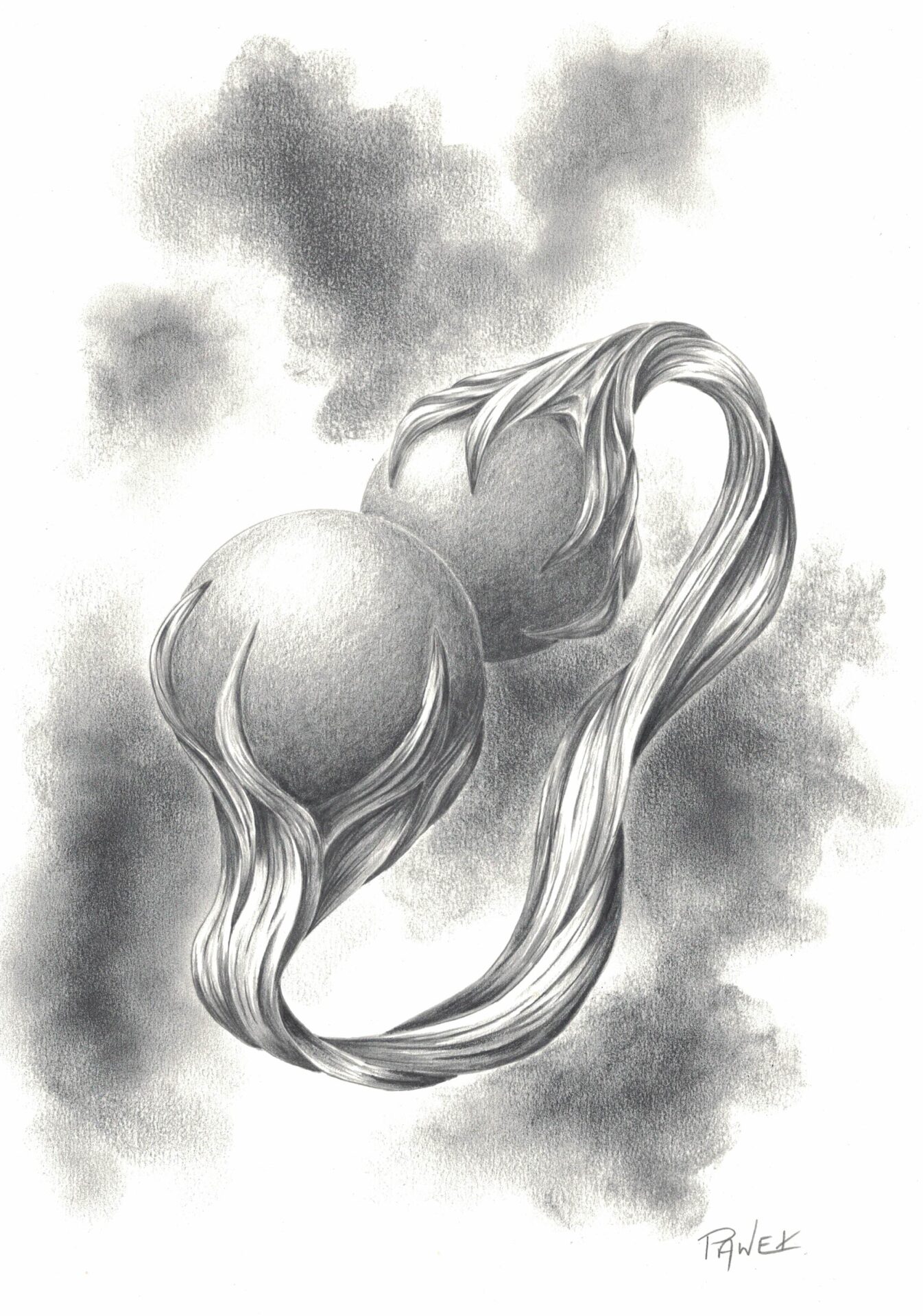 rysunek ołówkiem w formacie A-4, bez tytułu, z pogranicza abstrakcji i realizmu magicznego