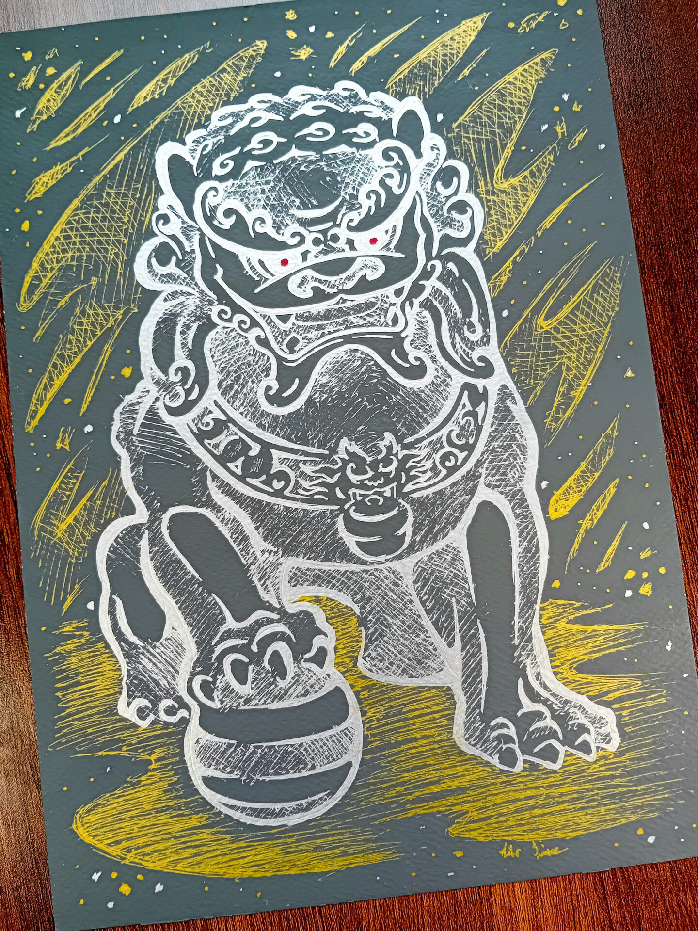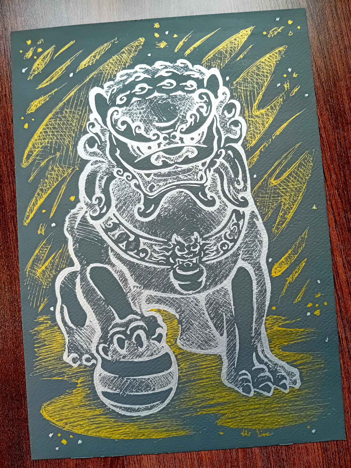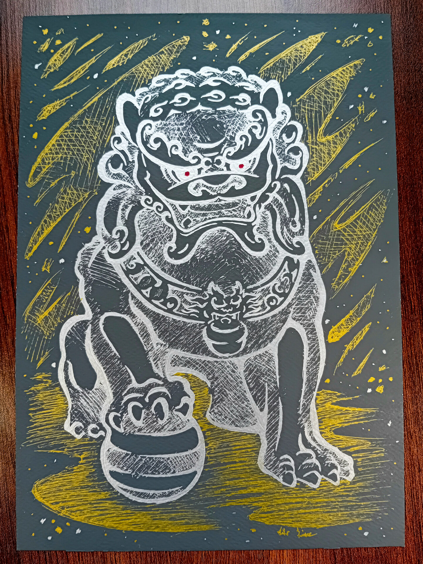 Rysunek został wykonany odblaskowymi długopisami, w opracowanej przeze mnie technice złoto srebrnego lineartu na czarnym, zapewniam że na żywo robi jeszcze większe wrażenie, wzory odbijają się i zmieniają swoją intensywność pod wpływem światła, czego nie można oddać na zdjęciu. Taki obraz może być dobrym pomysłem na prezent.