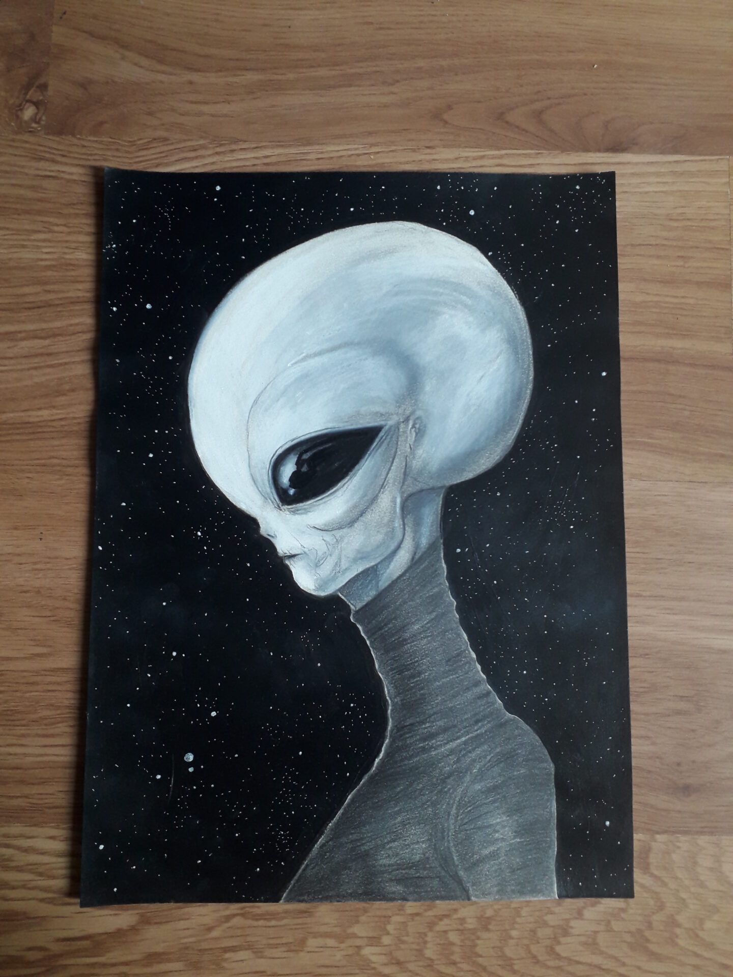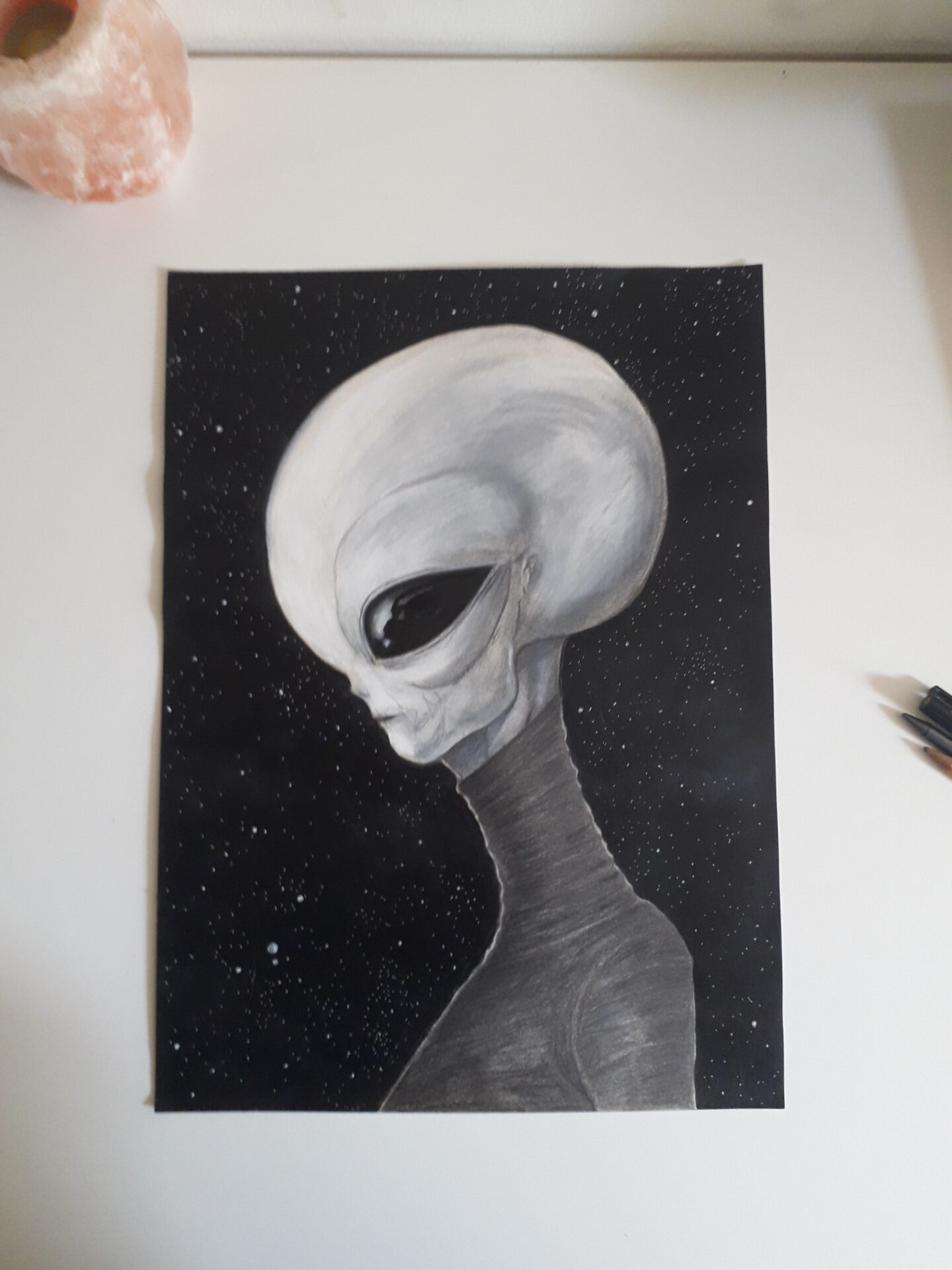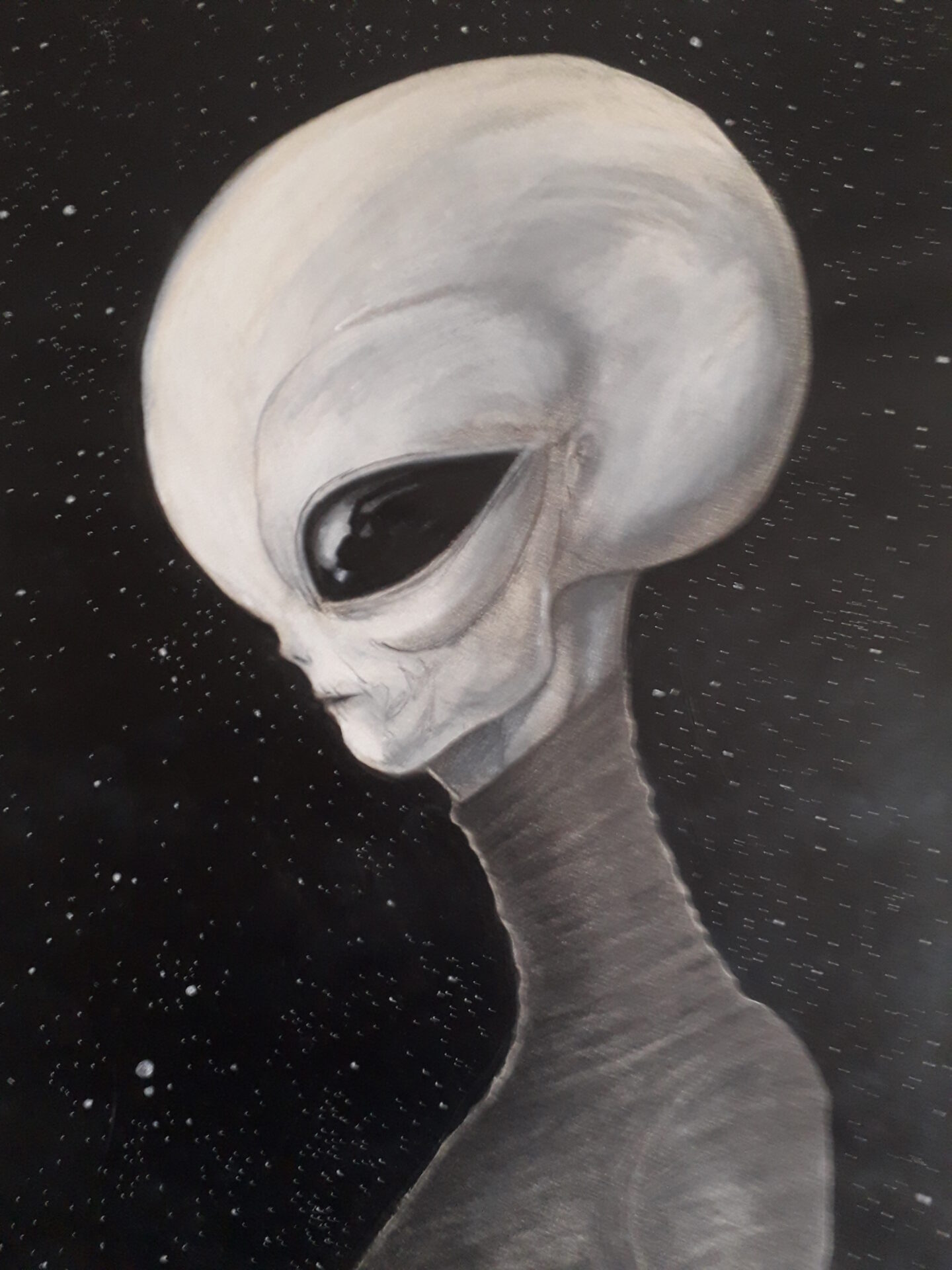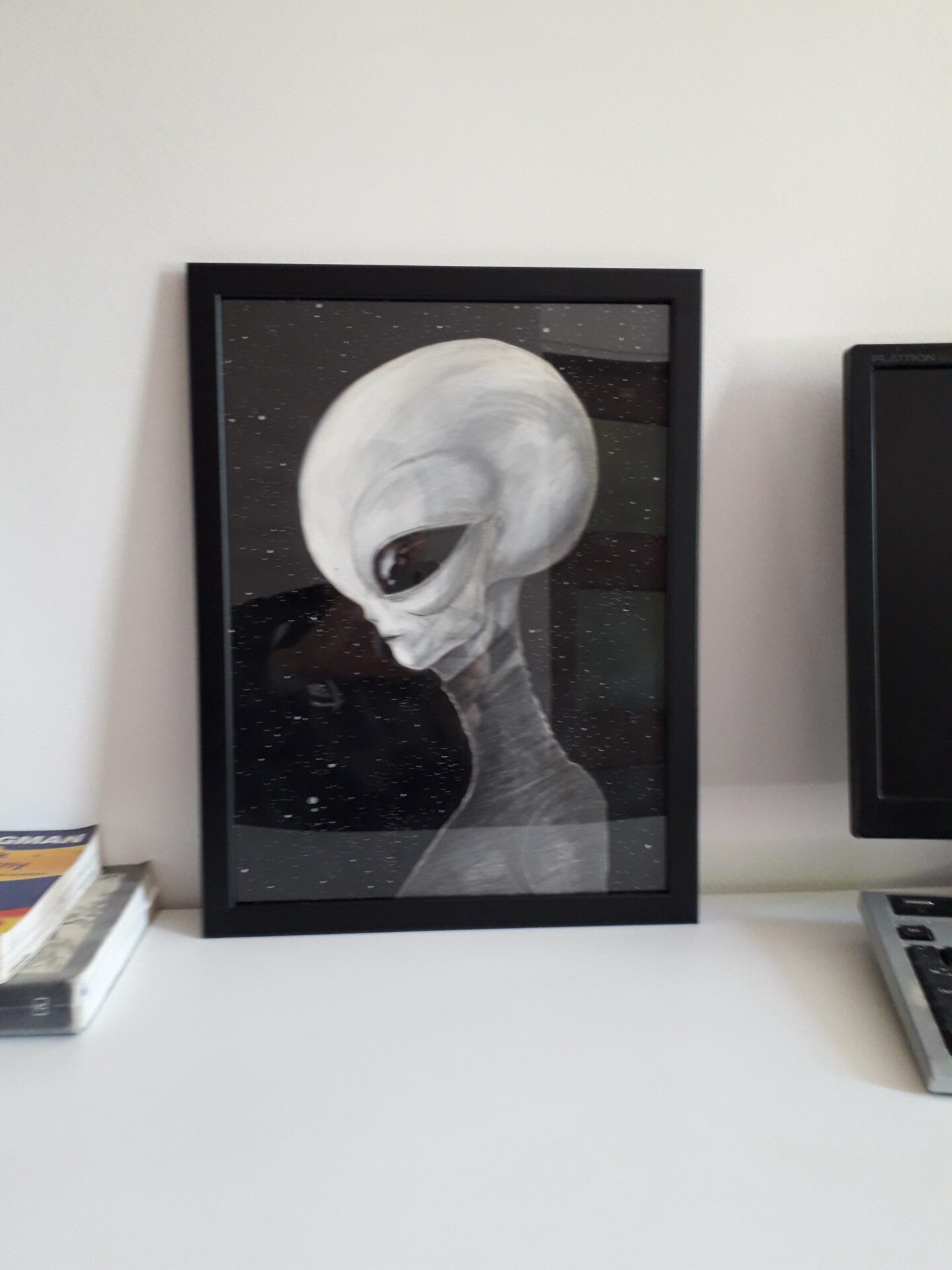 Praca wykonana w technice mieszanej w 2022r. postać jest wymyślona nie kopiowana jest częścią serii o nazwie polymer galactica która zawiera portrety obcych cywilizacji.