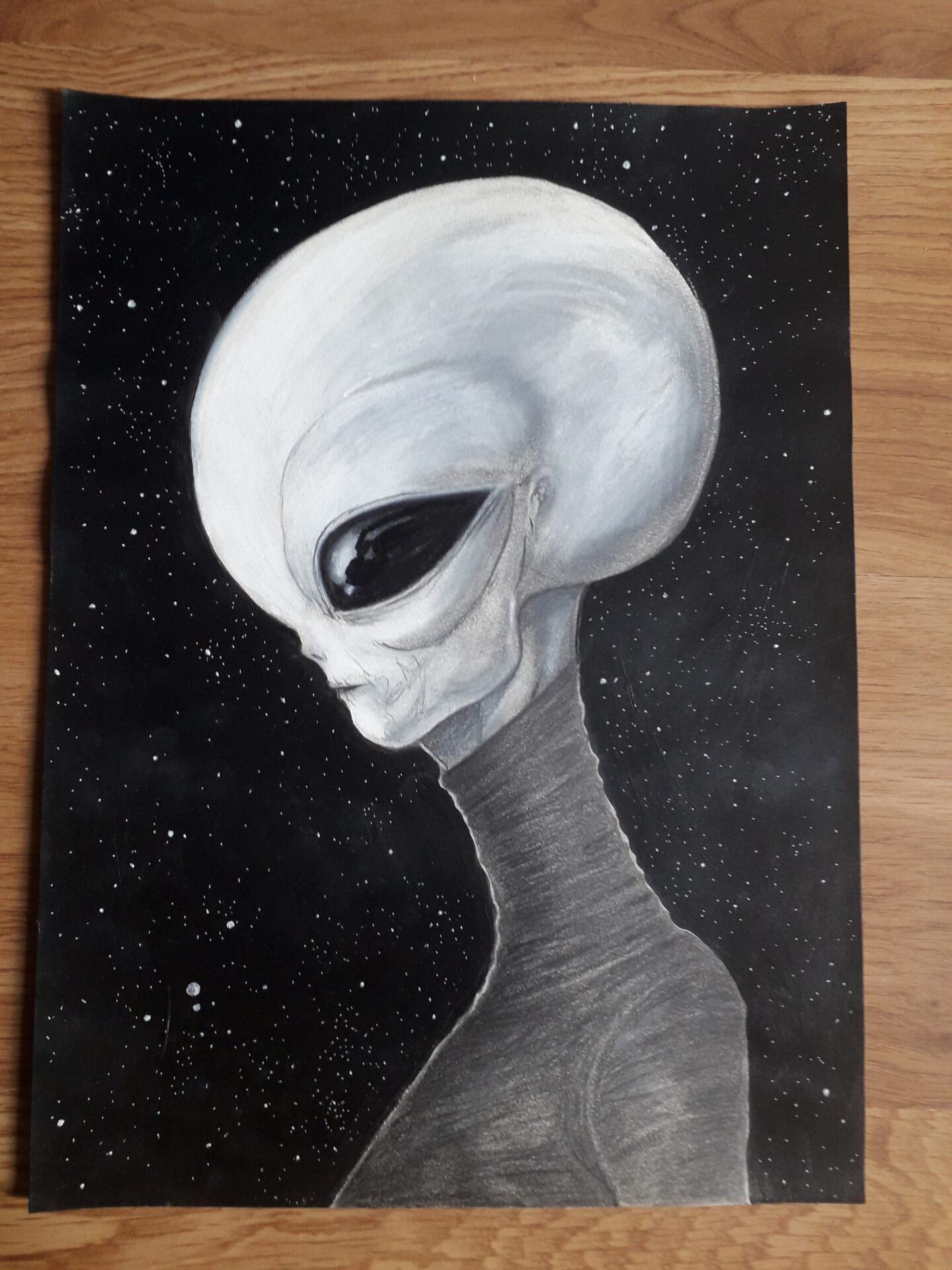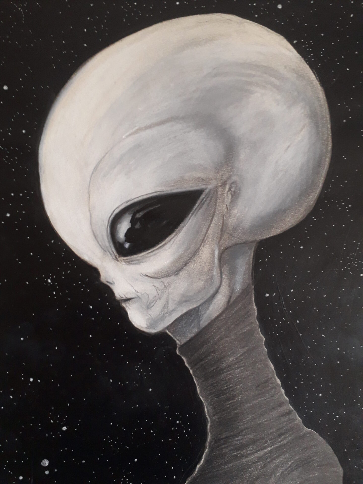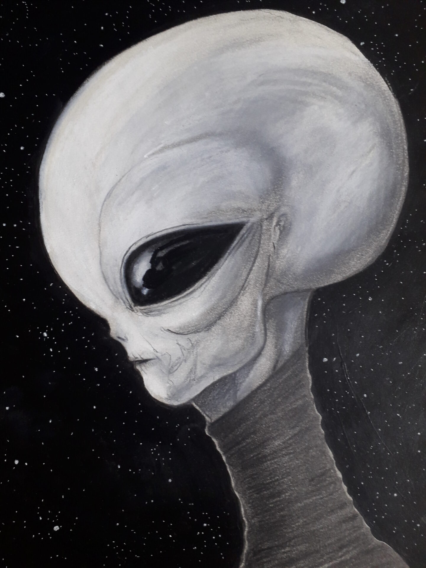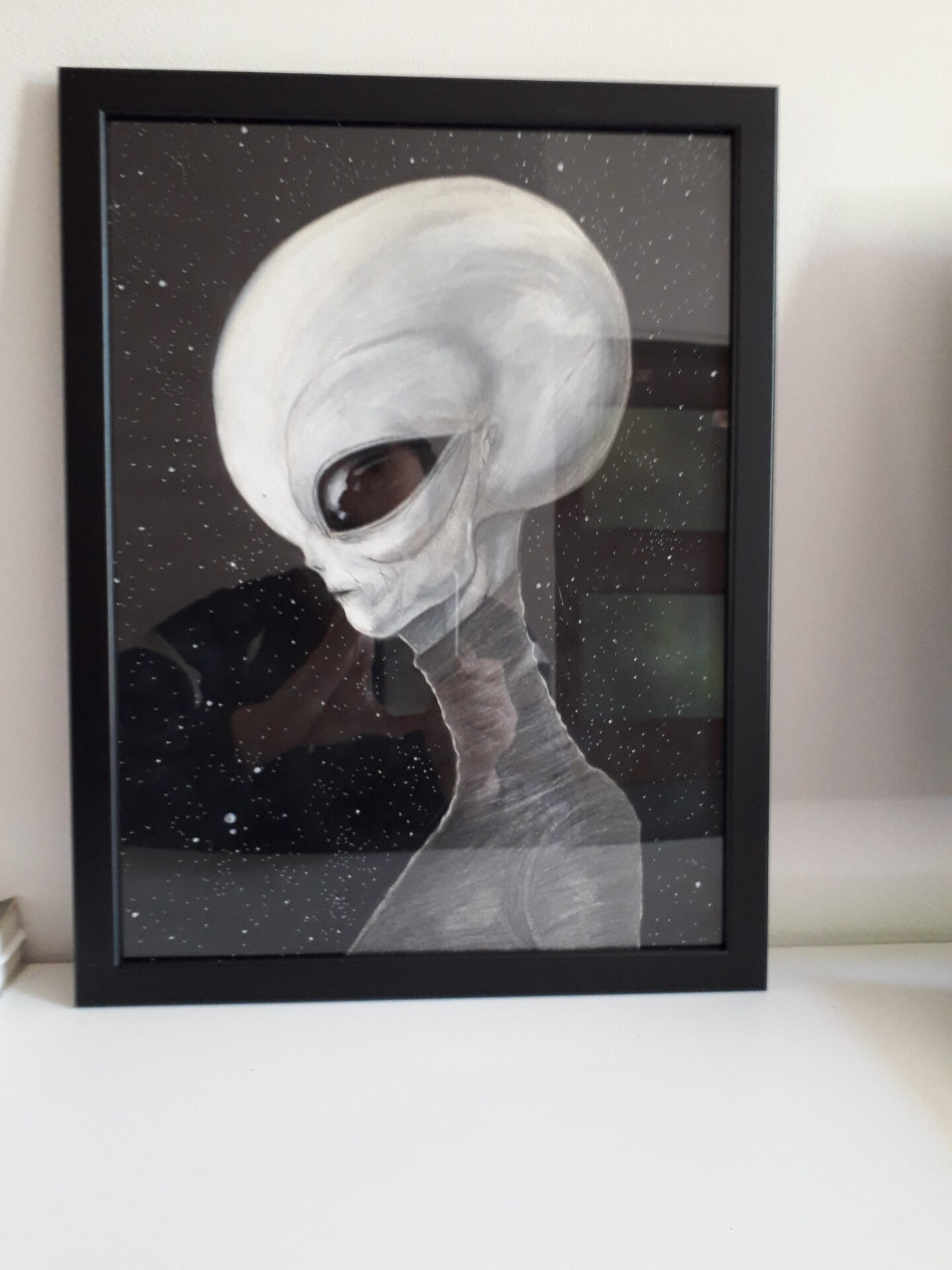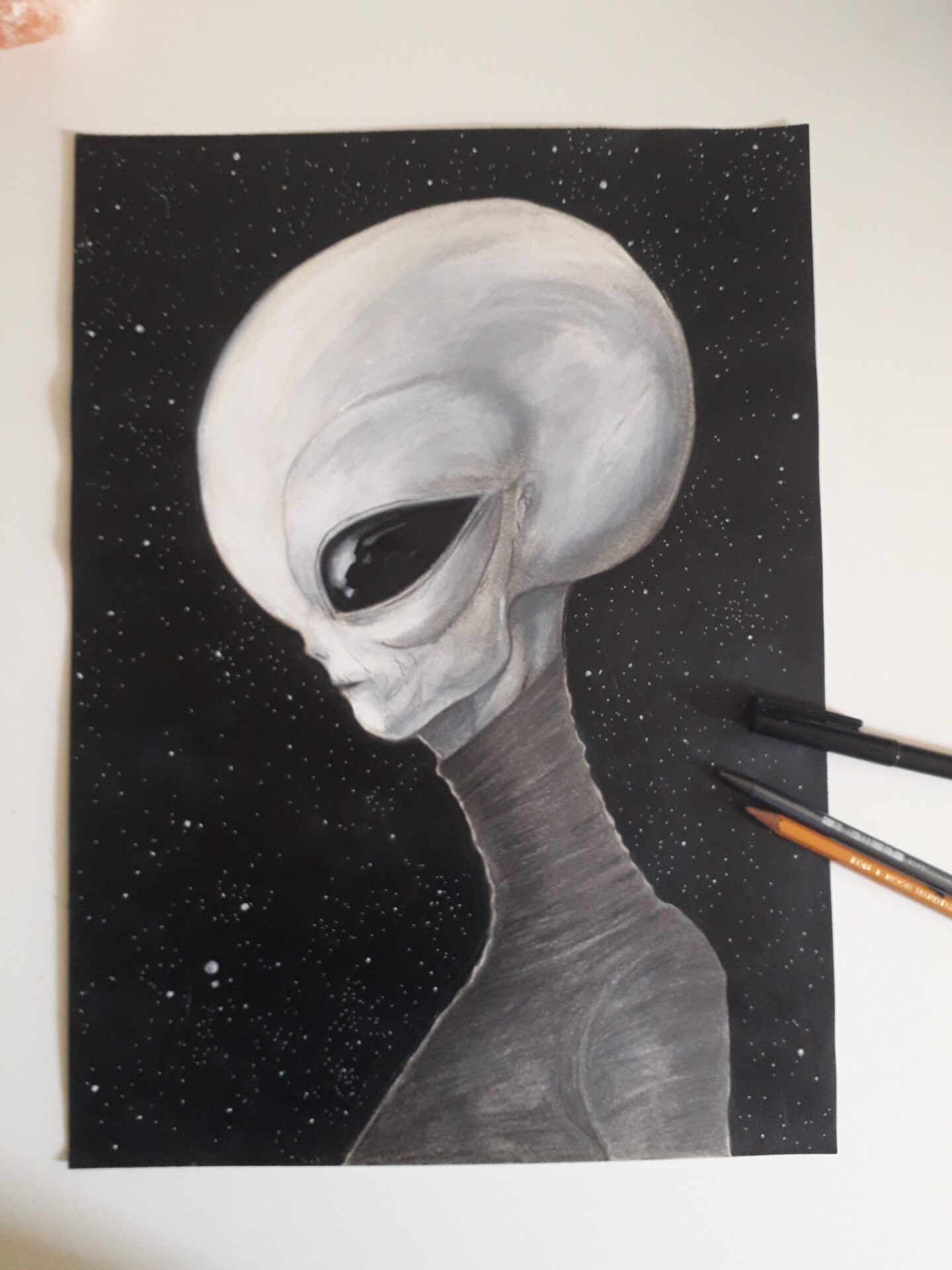 Praca wykonana w technice mieszanej w 2022r. postać jest wymyślona nie kopiowana jest częścią serii o nazwie polymer galactica która zawiera portrety obcych cywilizacji.