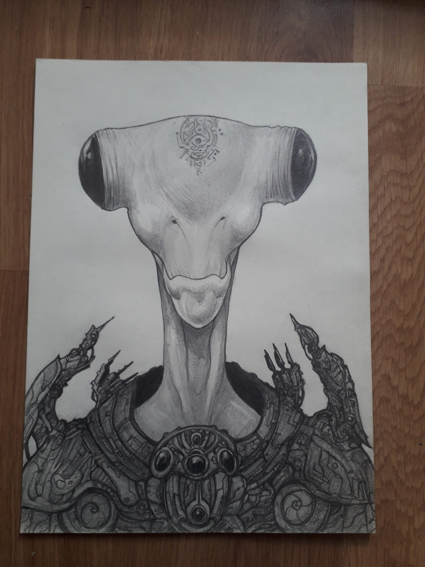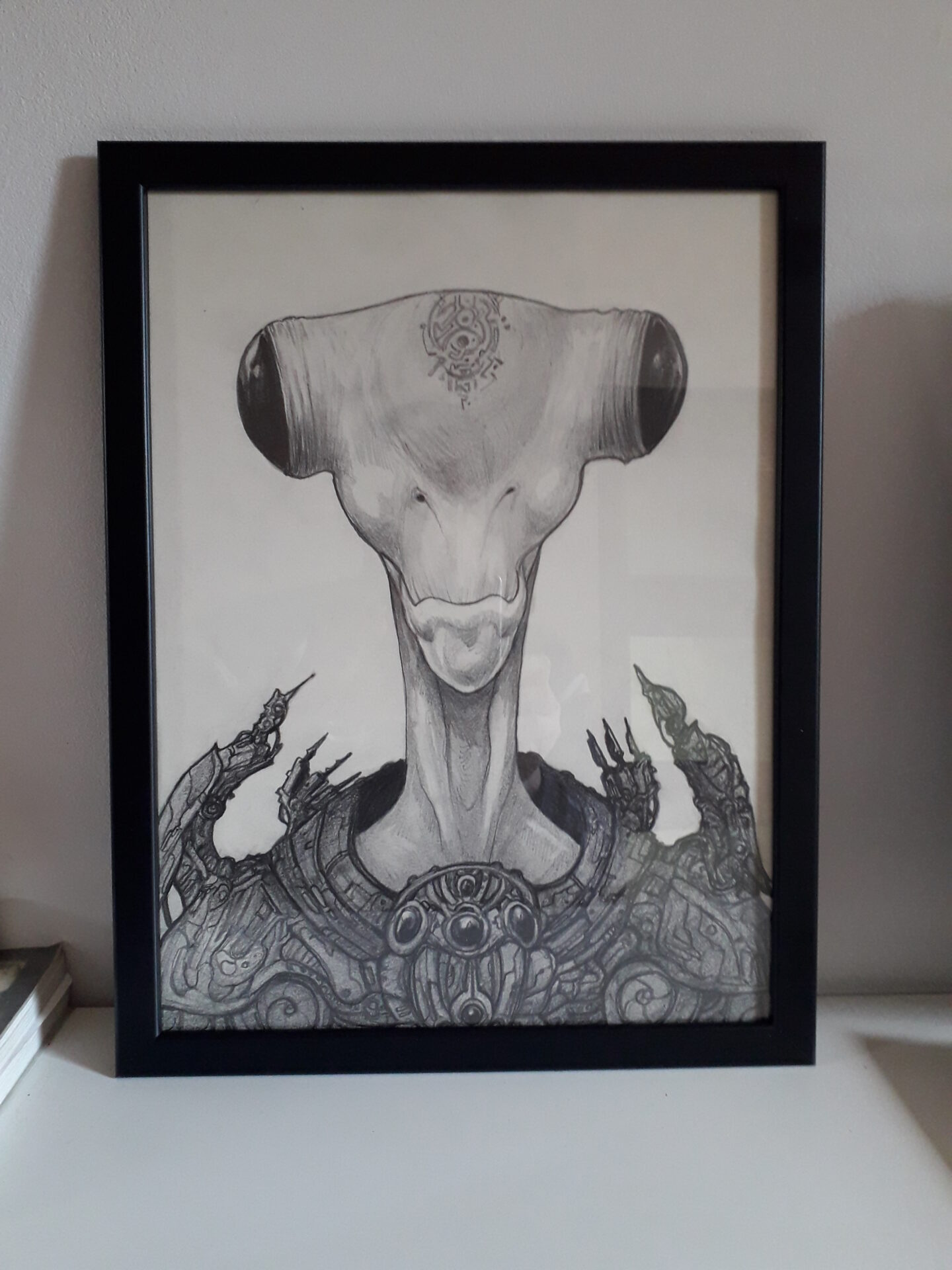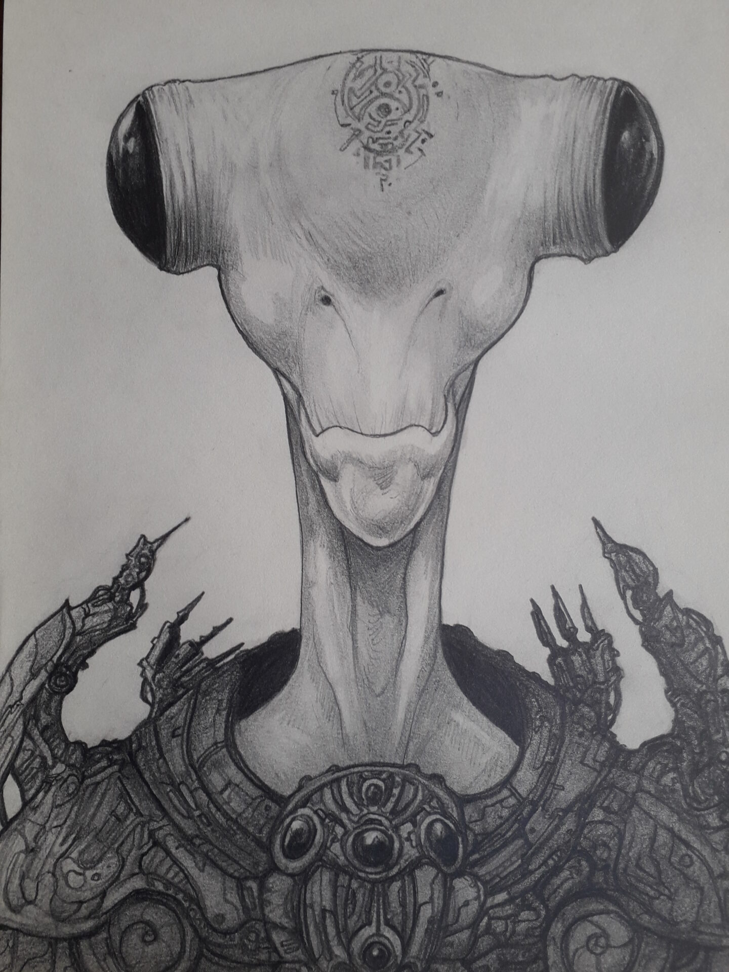 Praca wykonana w technice mieszanej w 2022r. postać jest wymyślona nie kopiowana jest częścią serii o nazwie polymer galactica która zawiera portrety obcych cywilizacji.