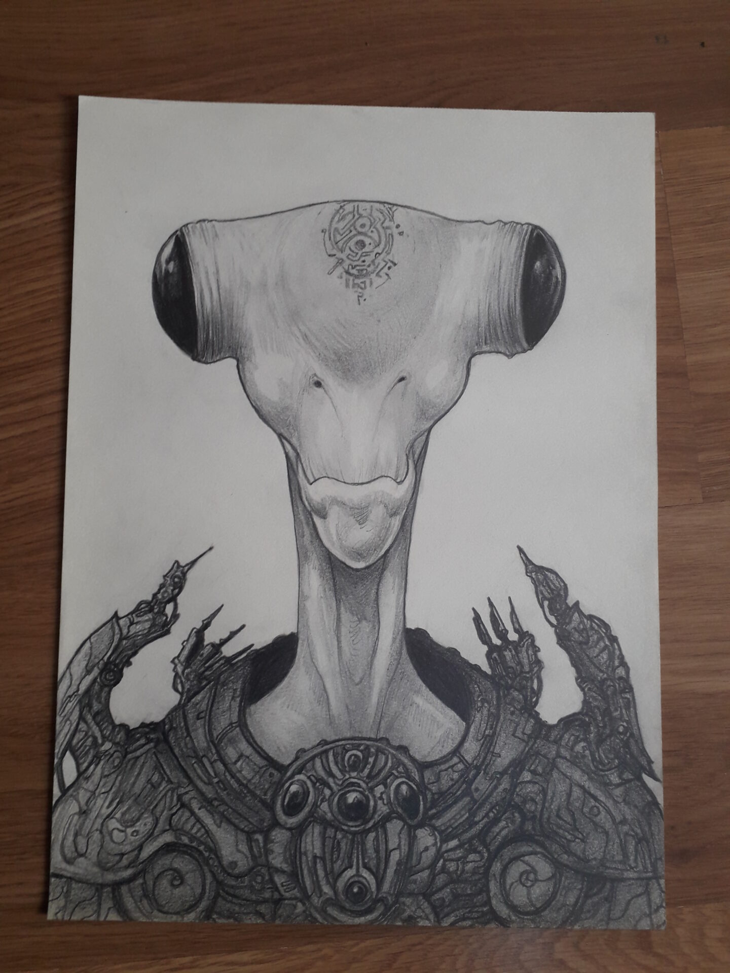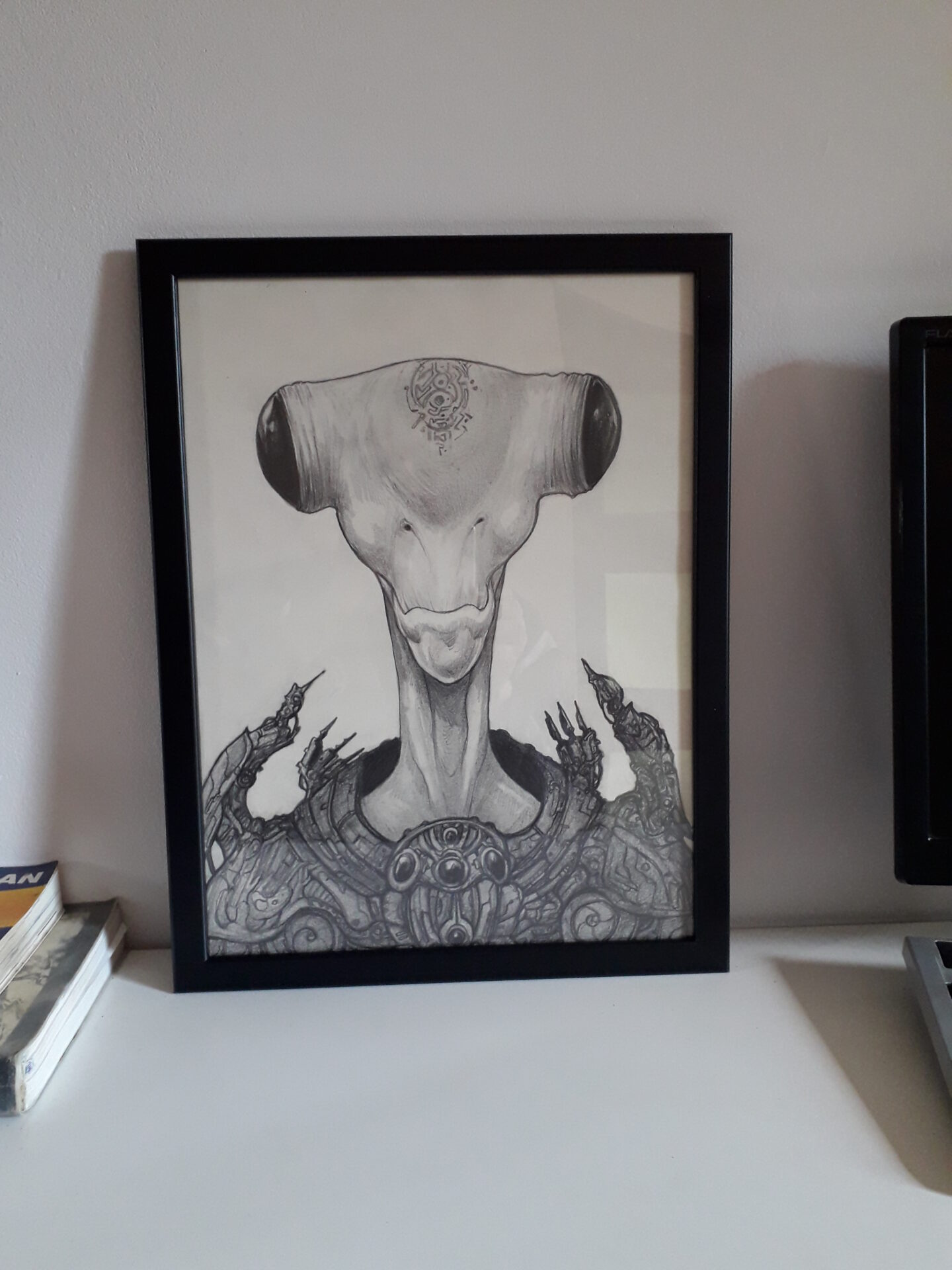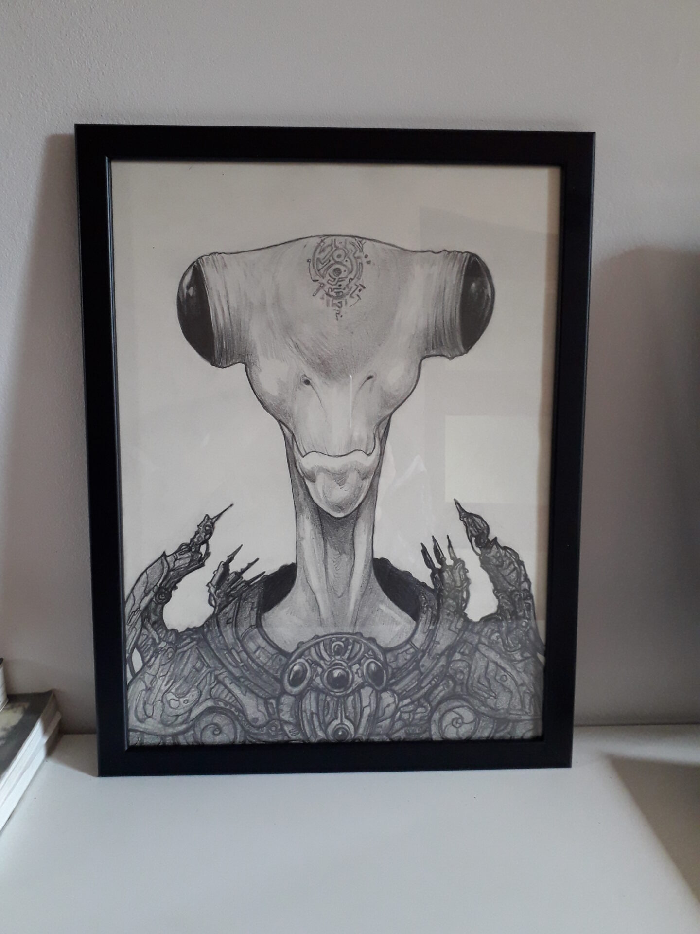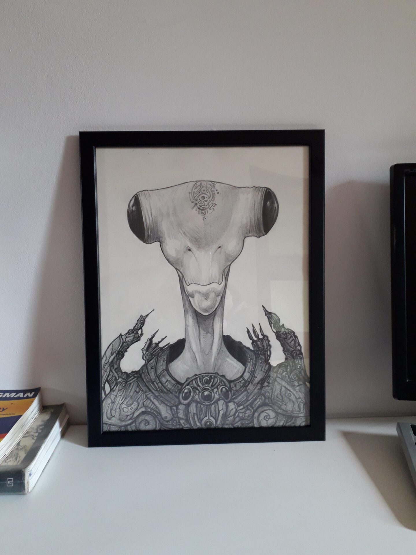 Praca wykonana w technice mieszanej w 2022r. postać jest wymyślona nie kopiowana jest częścią serii o nazwie polymer galactica która zawiera portrety obcych cywilizacji.