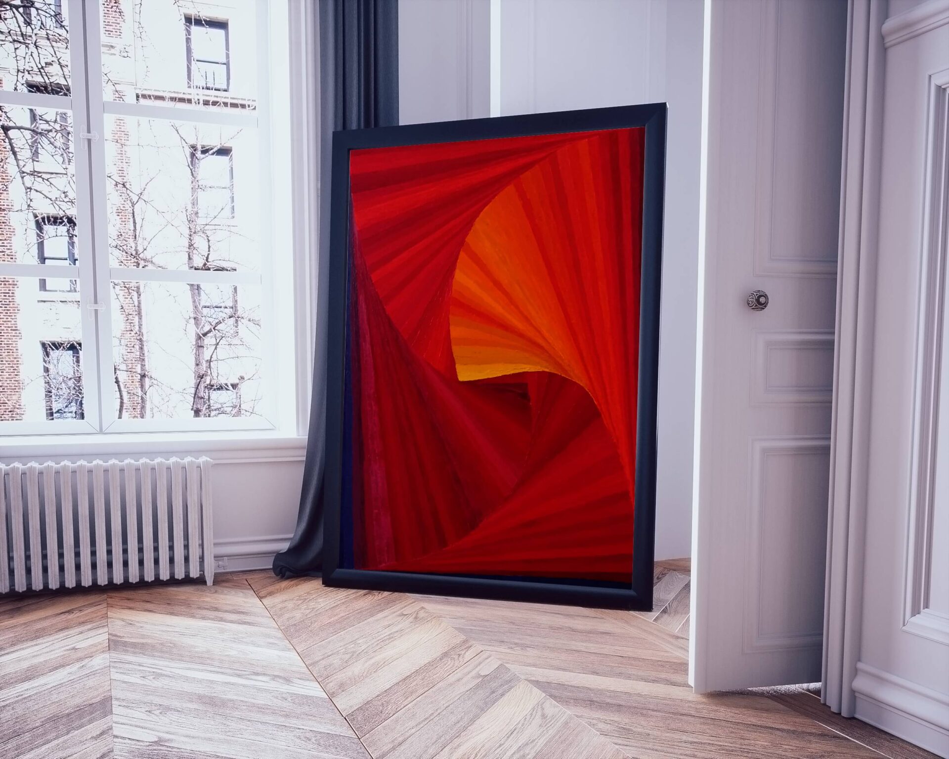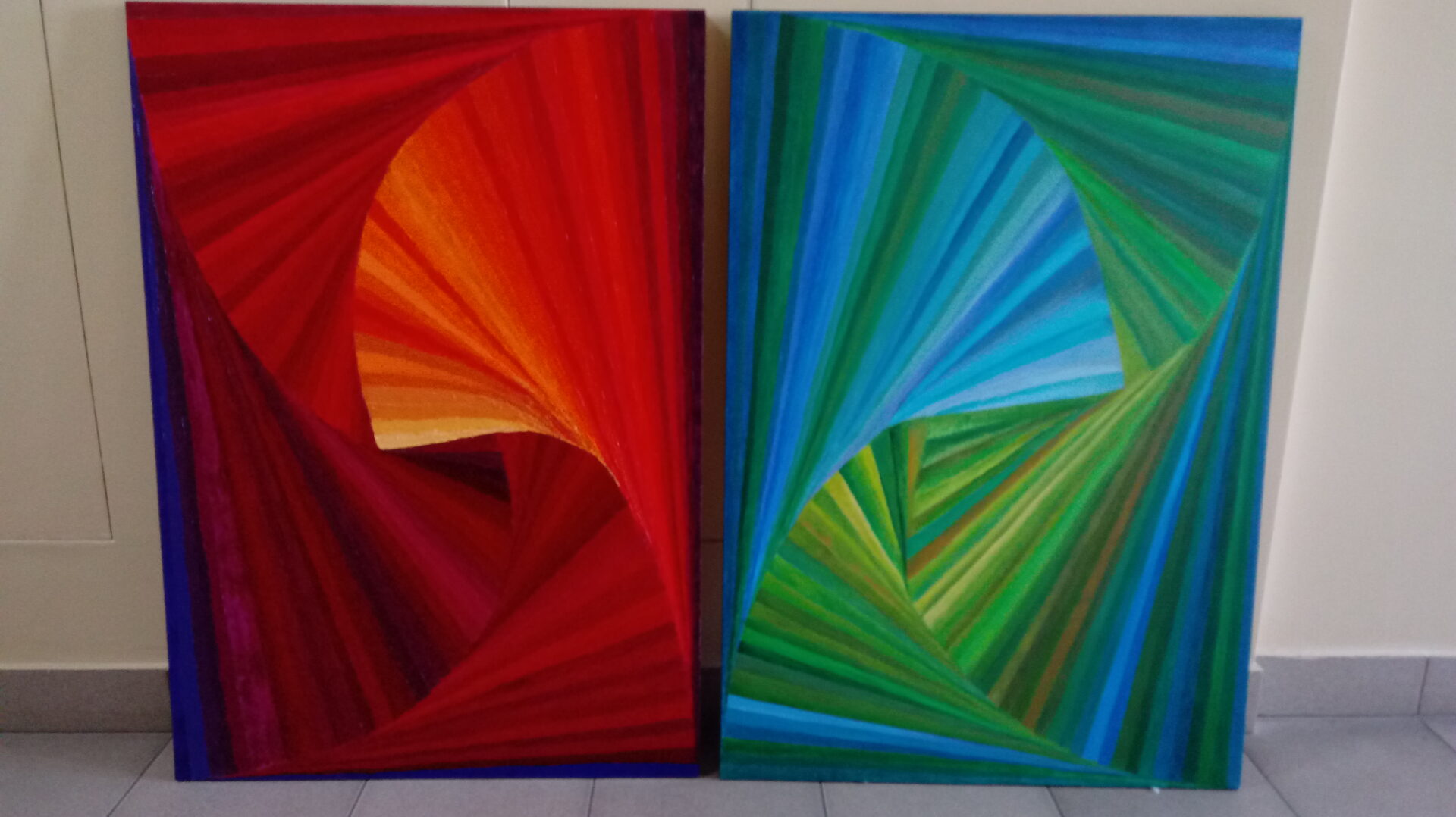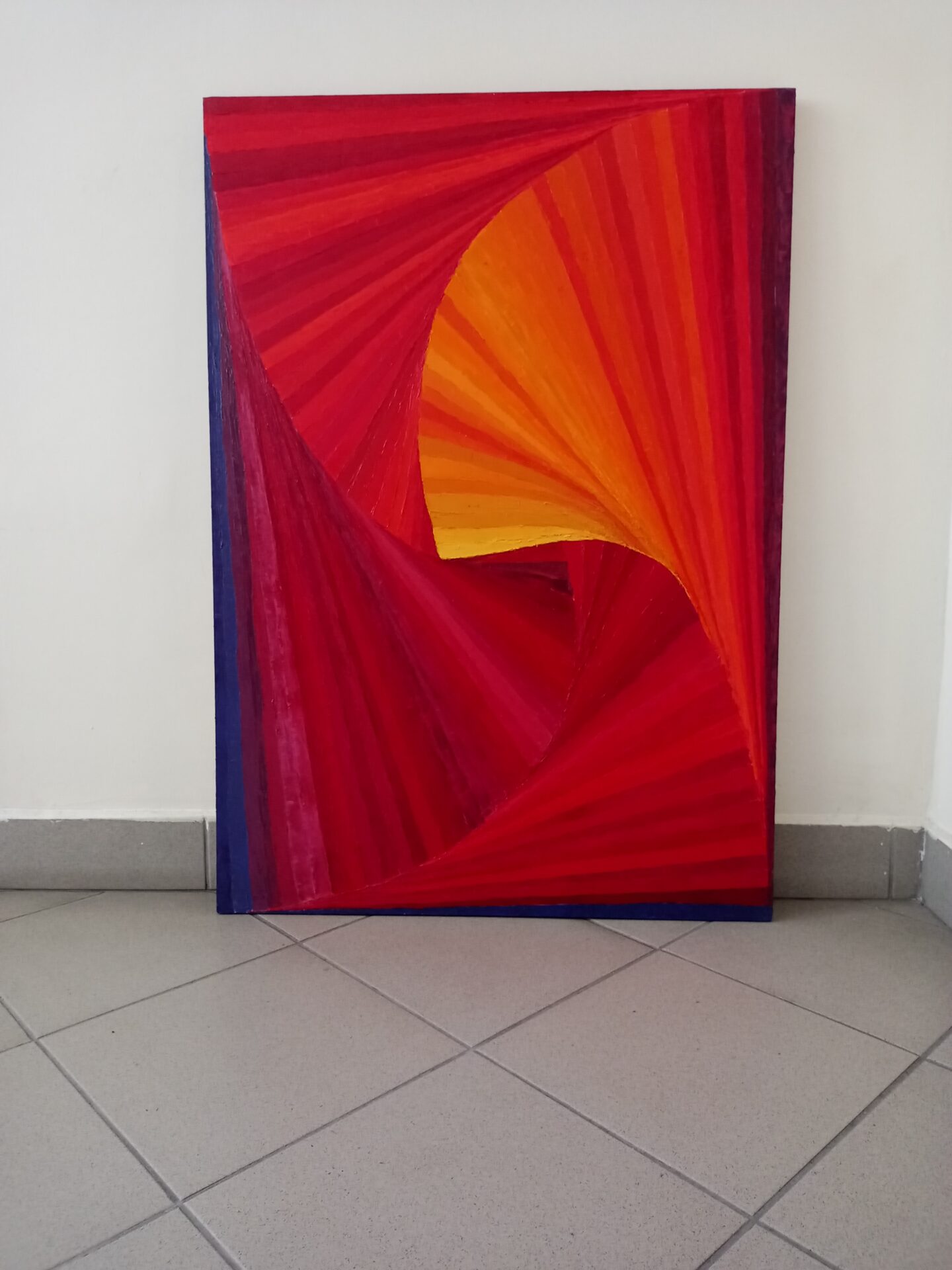 Rozmiar 70×100 cm. Obraz wykonany w techniką olejną na podobraziu bawełnianym. Zawerniksowany. Boki zamalowane na czarno. Sposób ekspozycji jest sugestią twórcy jednak kompozycja pozwala na ekspozycję zarówno horyzontalną jak i wertykalną. Abstrakcja w przewadze kolorów ciepłych, malowany techniką umożliwiającą tworzenie dodatkowej struktury. Rytm kompozycji jest wciągający i energetyczny. Obraz powstał w 2019 i stanowi część dyptyku. Samodzielnie prezentuje się równie atrakcyjnie, dlatego sprzedaję obrazy pojedynczo.