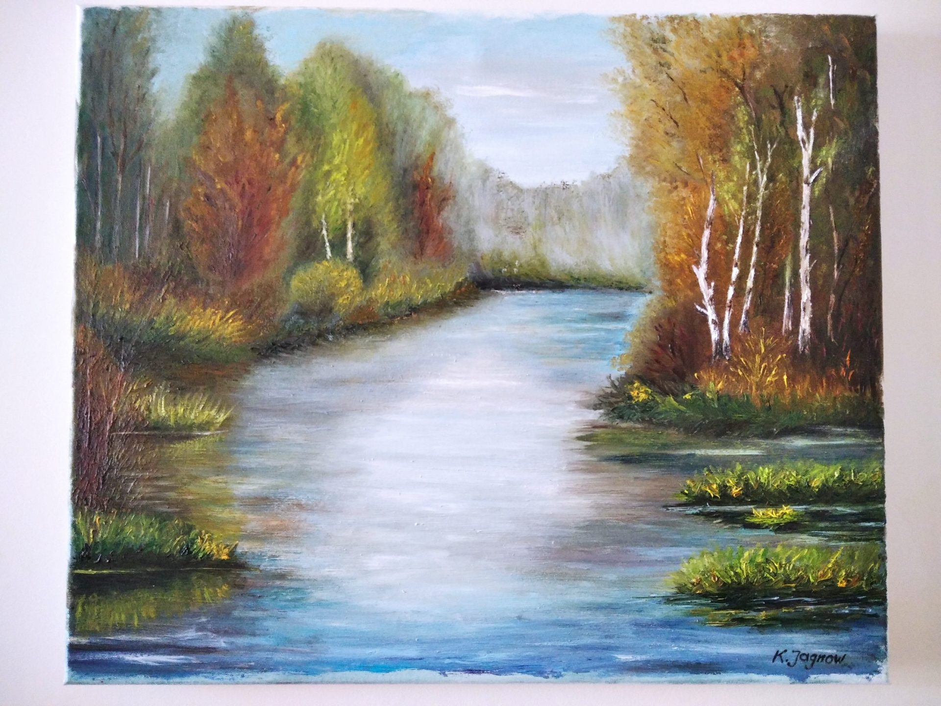 Obraz olejny, na płótnie o wymiarach 50x60cm przedstawiający rzekę płynącą przez jesienny las.