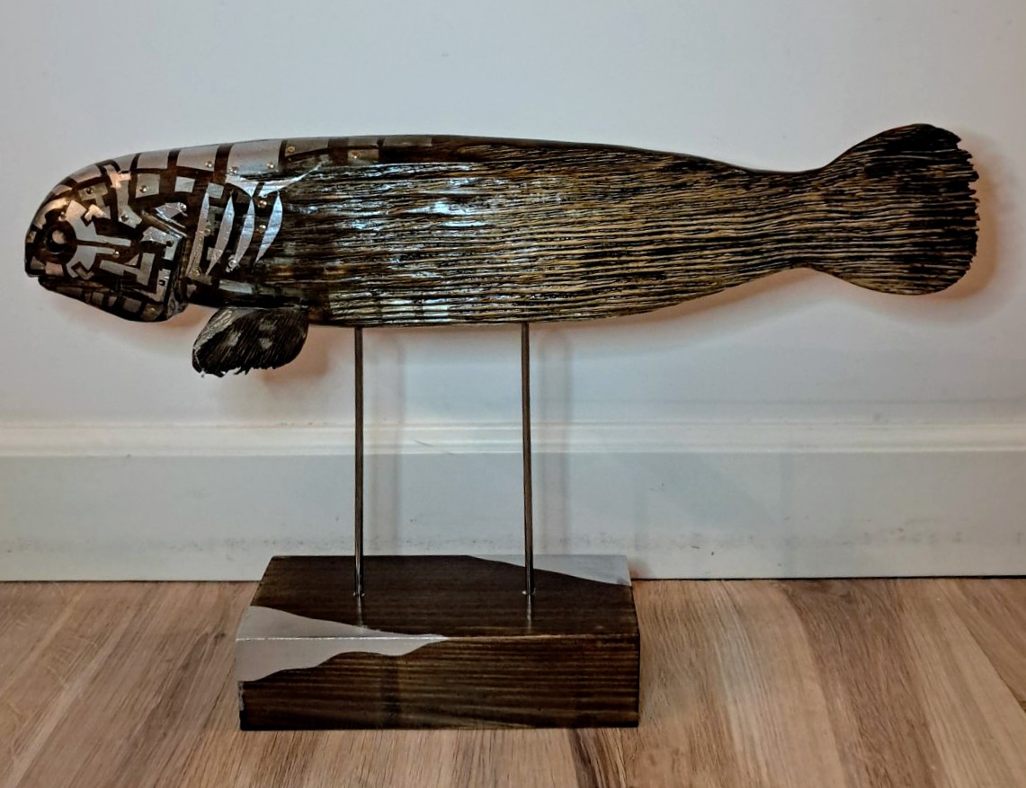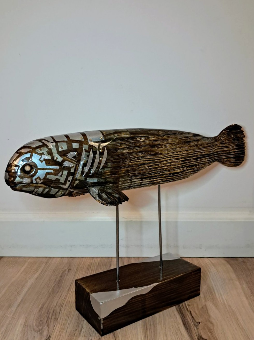 Rzeźba artystyczna wykonana w kształcie ryby. Będzie wspaniałym elementem do dekoracji wnętrz i super prezentem dla miłośników sztuki nowoczesnej.