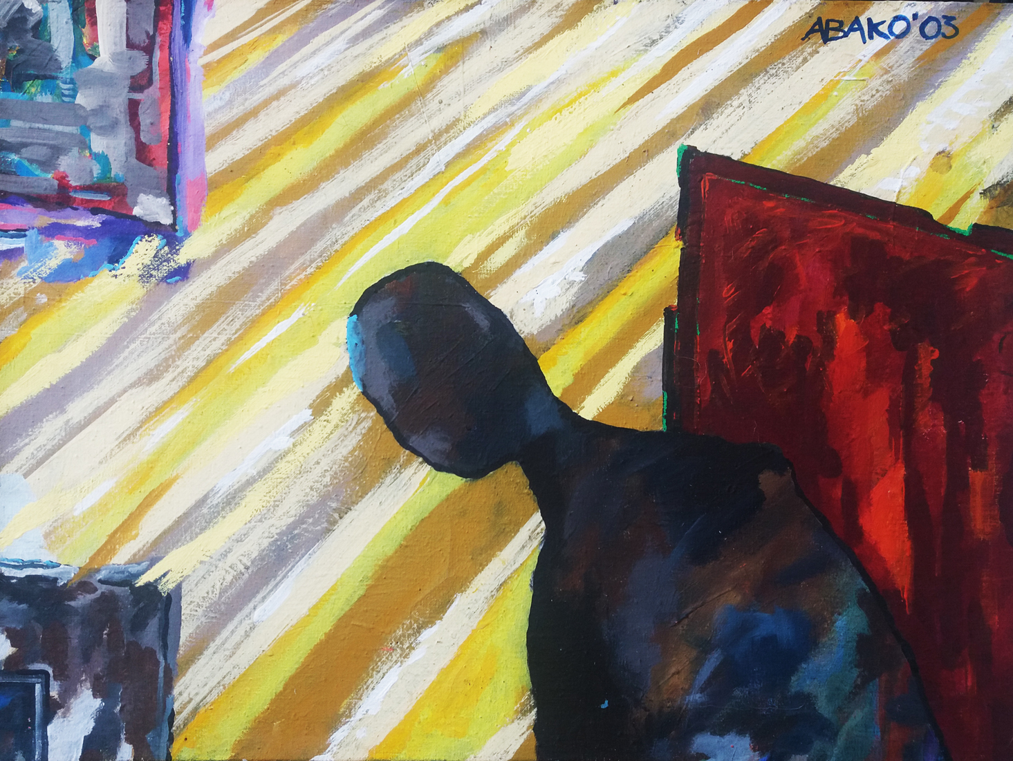 Olej, akryl na płótnie, sygn. p.g.: ABAKO’03, na odwrocie opis autorski, boczna krawędź blejtramu zamalowana.