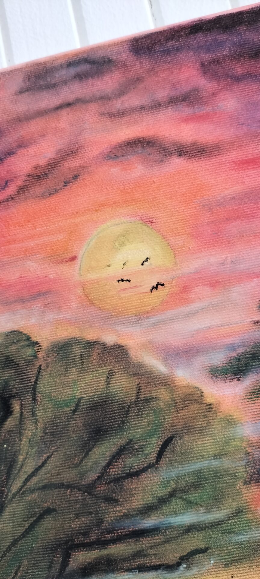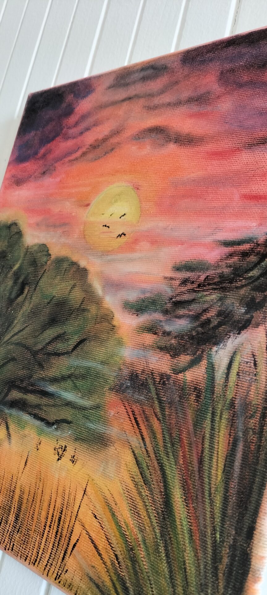 Praca własna, obraz w technice akryl i pastele na płótnie. Letni zachód słońca na Sawannie.