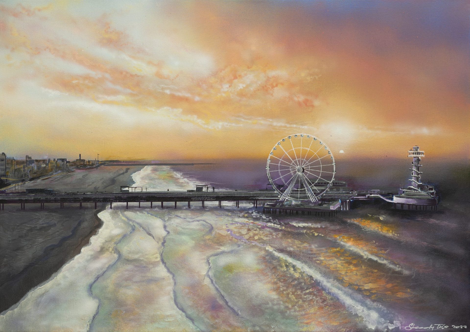 Obraz przedstawia zachód słońca na haskim Scheveningen,
