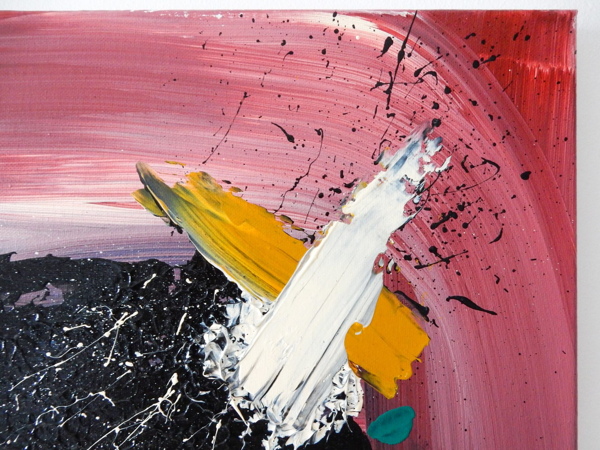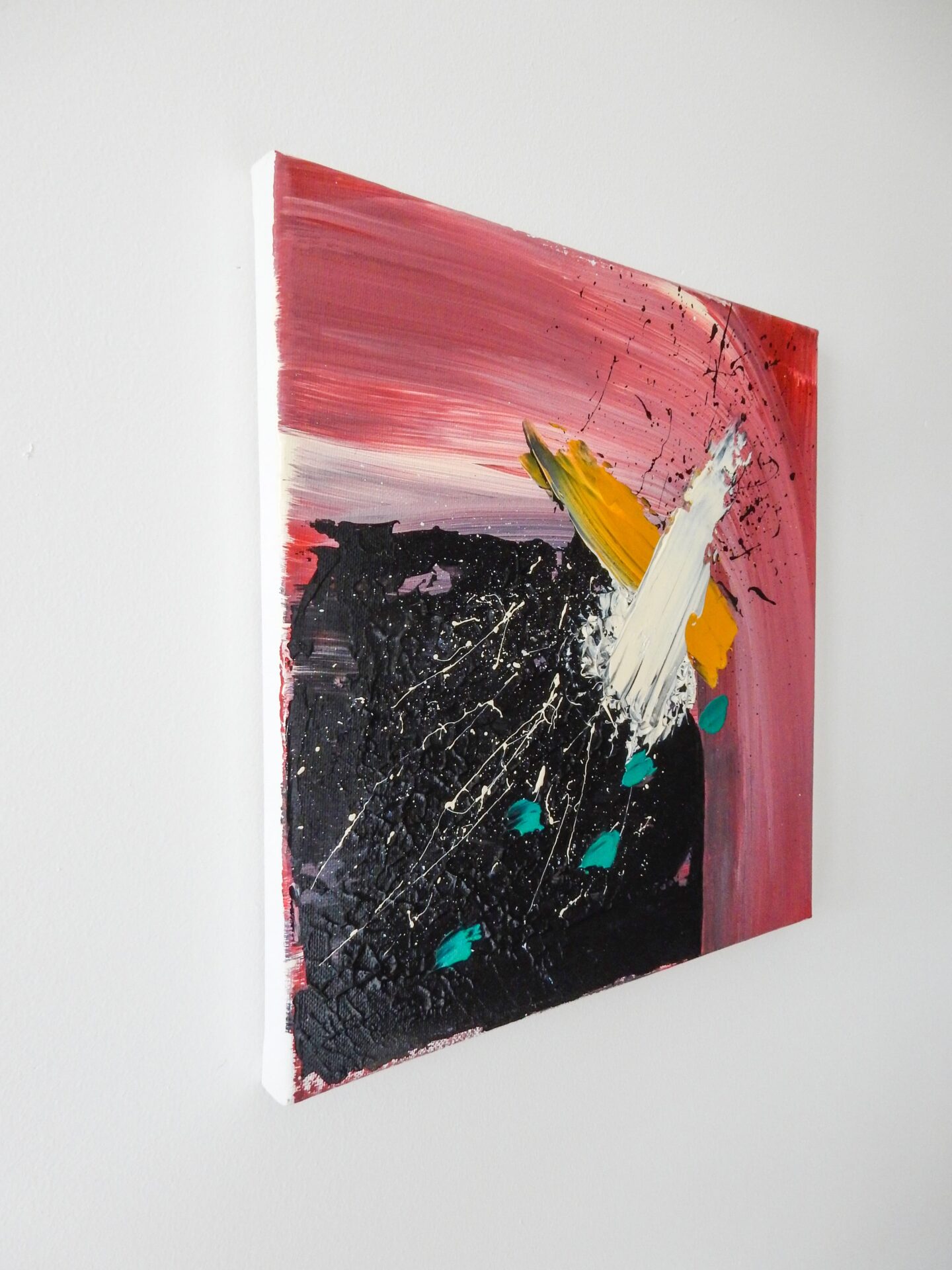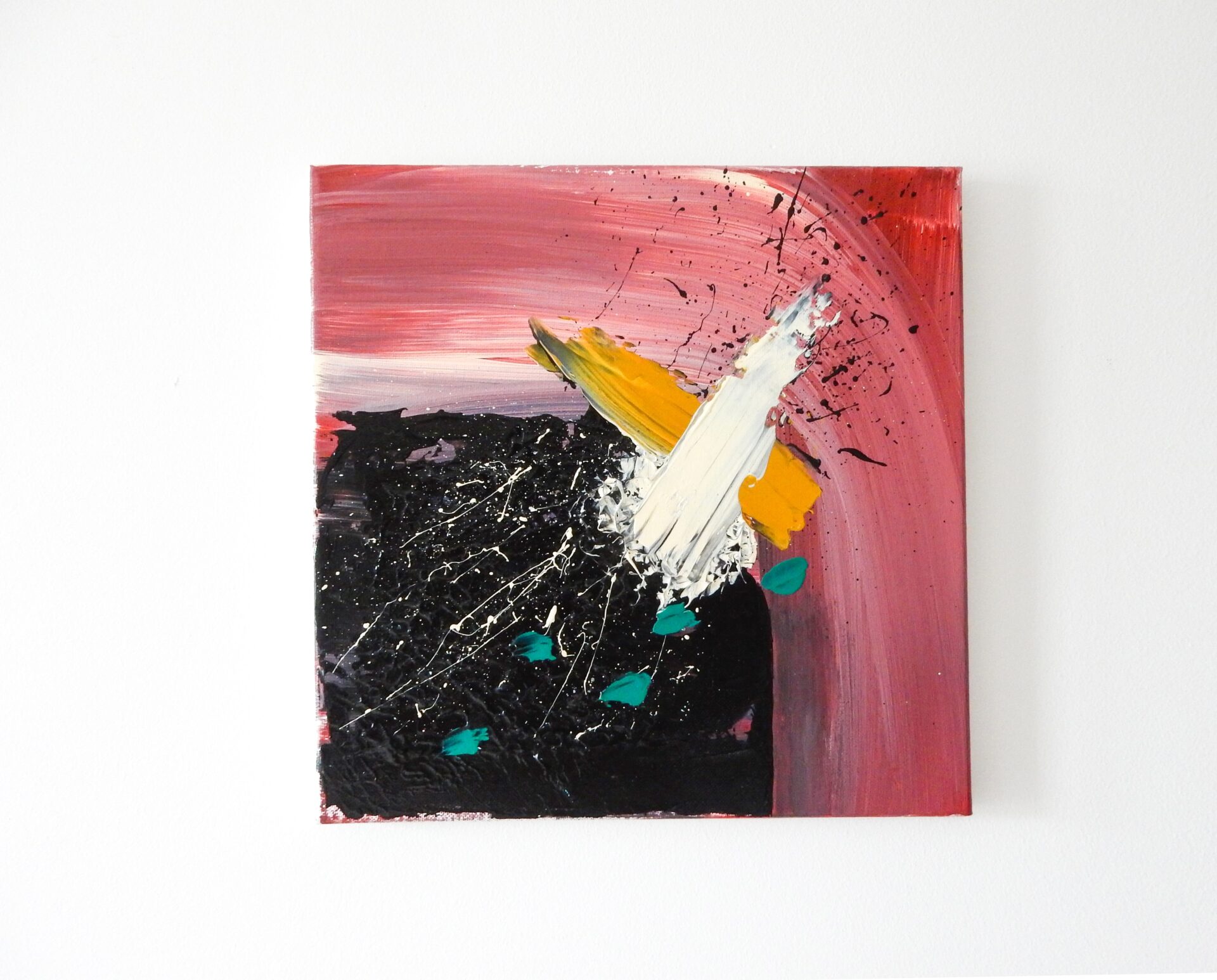 Informacje podstawowe: akryl na płótnie bawełnianym (gruntowanym) 30×30 cm. Barwy: czerń, biel, czerwień, róż, zieleń i kolor musztardowy. OBRAZ POSIADA W NIEKTÓRYCH MIEJSCACH WYPUKŁE ELEMENTY CO SPRAWIA, ŻE WYGLĄDA JESZCZE BARDZIEJ REALNIE. Werniks.