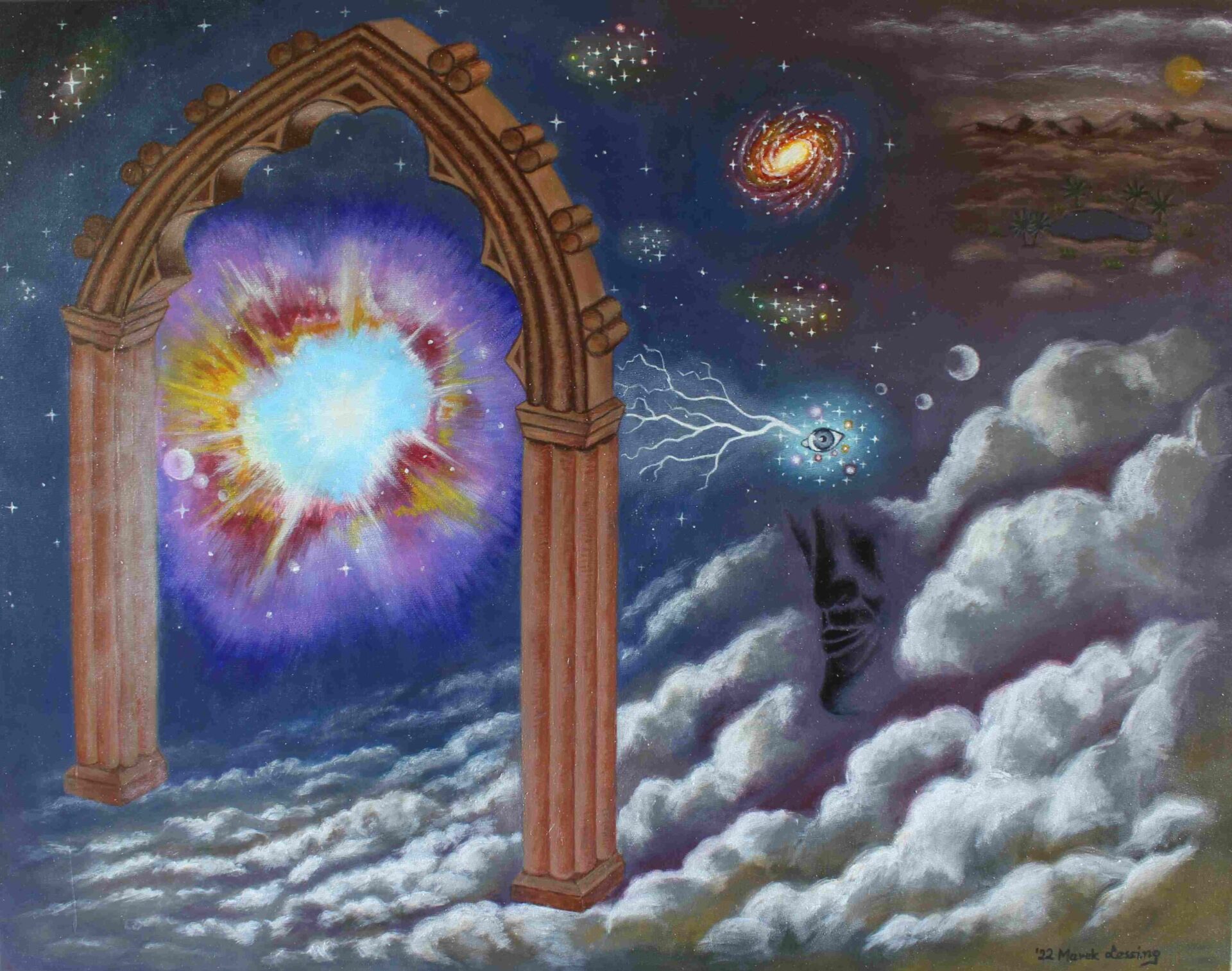 ,,Sekretny portal wojownika światła” 2020r. 90/70cm akryl na płótnie Malarstwo-surrealizm mistyczny