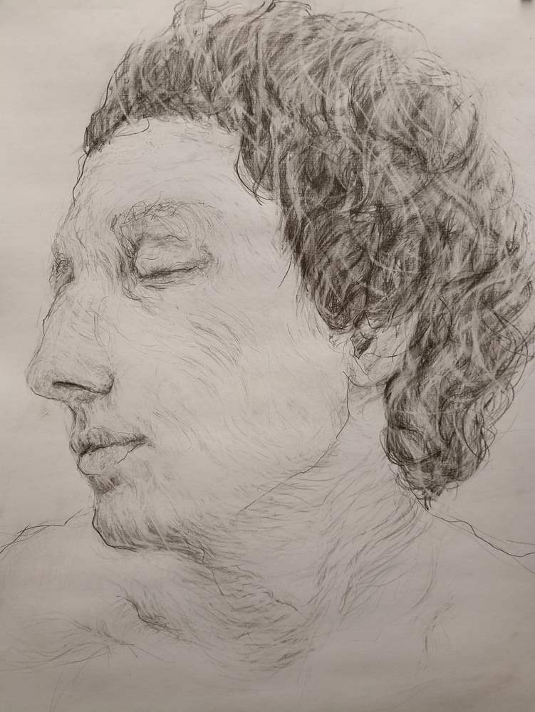 Rysunek „Senny portret” wykonany został ołówkiem na papierze. Sposób prowadzenia narzędzia po płaszczyźnie kojarzy się z ulotnością i płynnością snu ludzkiego. Dołączam certyfikat autentyczności z podziękowaniem. Jest możliwość wysyłki paczkomatem. Zapraszam do kontaktu.