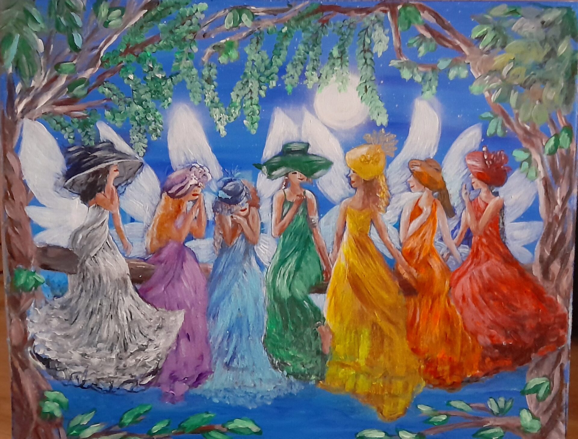 Obraz wg własnego pomysłu. Dużo koloru, bajkowa sceneria, rozgadane Wróżki.