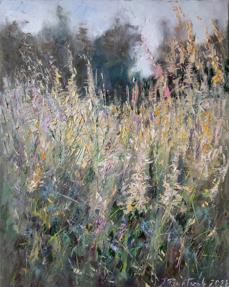 Obraz olejny na podobraziu płóciennym w technice alla prima z widoczną fakturą farby.