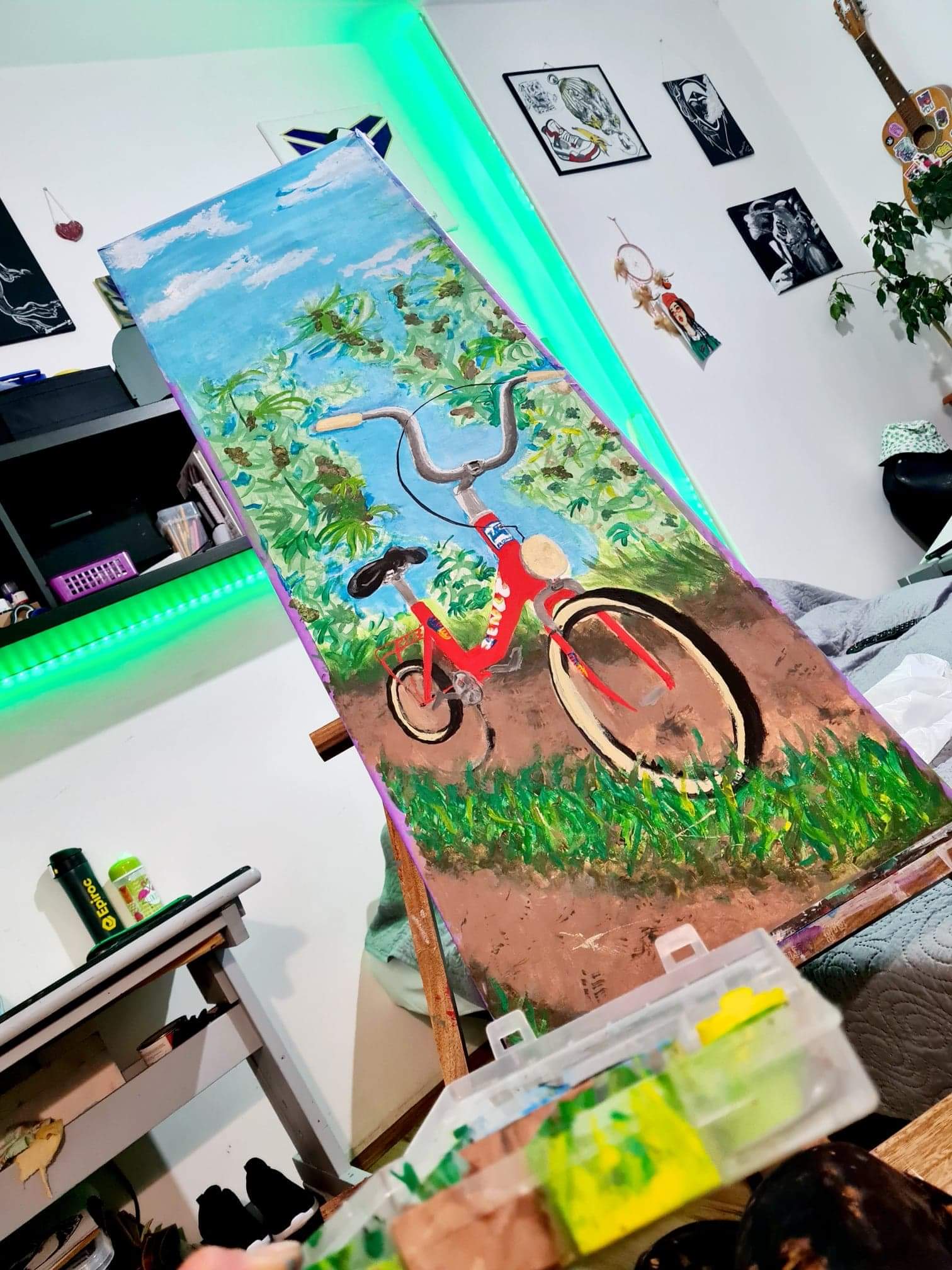 Malowany z płótnie farbami akrylowymi. Przedstawia rower spadek na „spocie”.