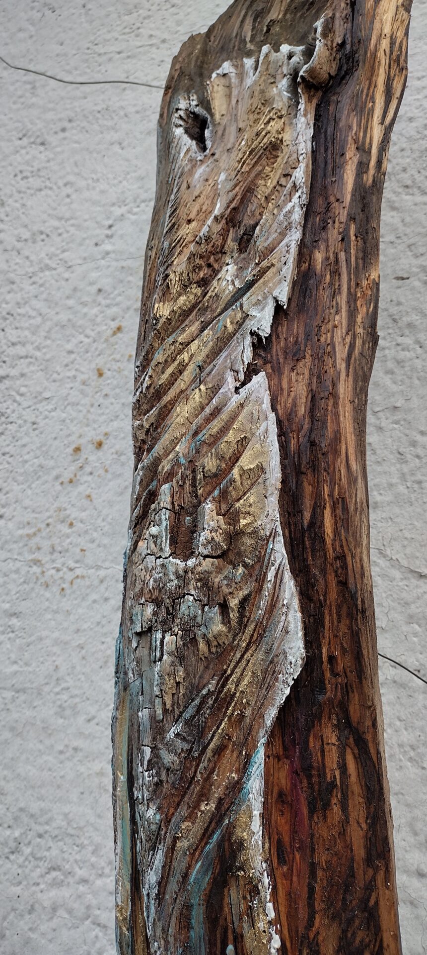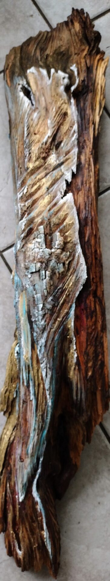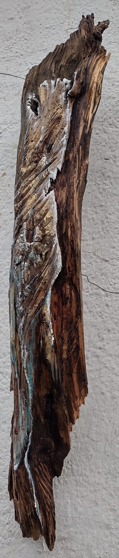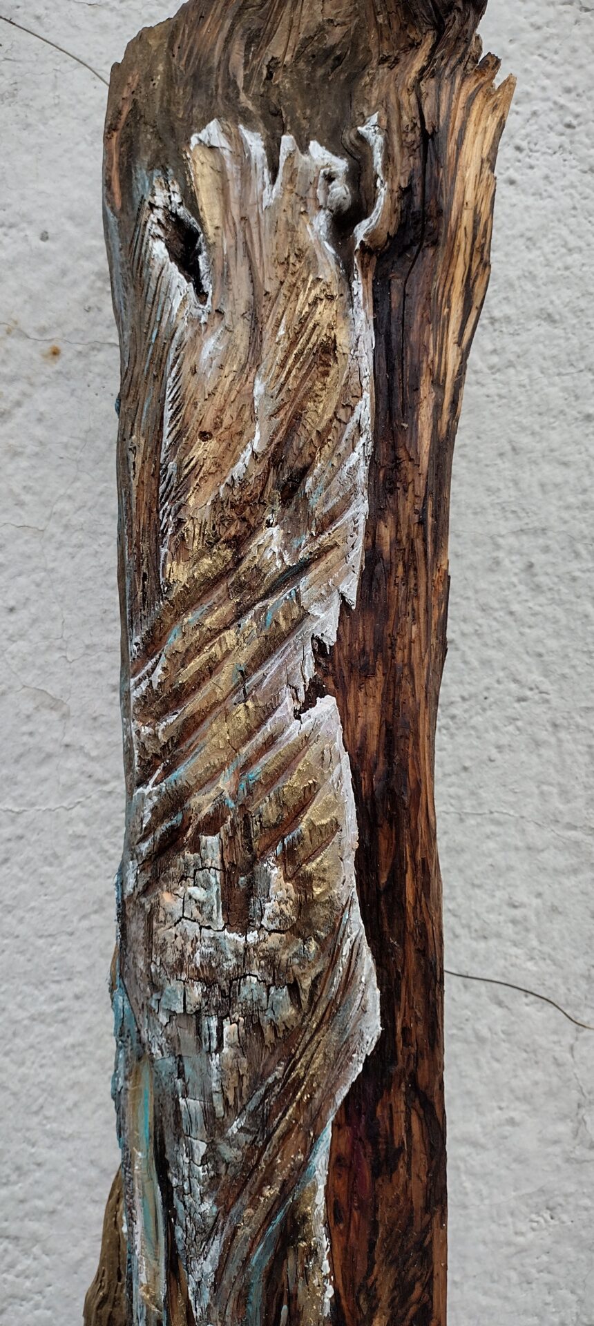 Rzeźba wykonana w dość grubym drewnie ,pięknym samym w sobie ,z drzewa po uderzaniu pioruna.(Historia drzewa jest ciekawa ,to było jego trzecie spotkanie z piorunem )