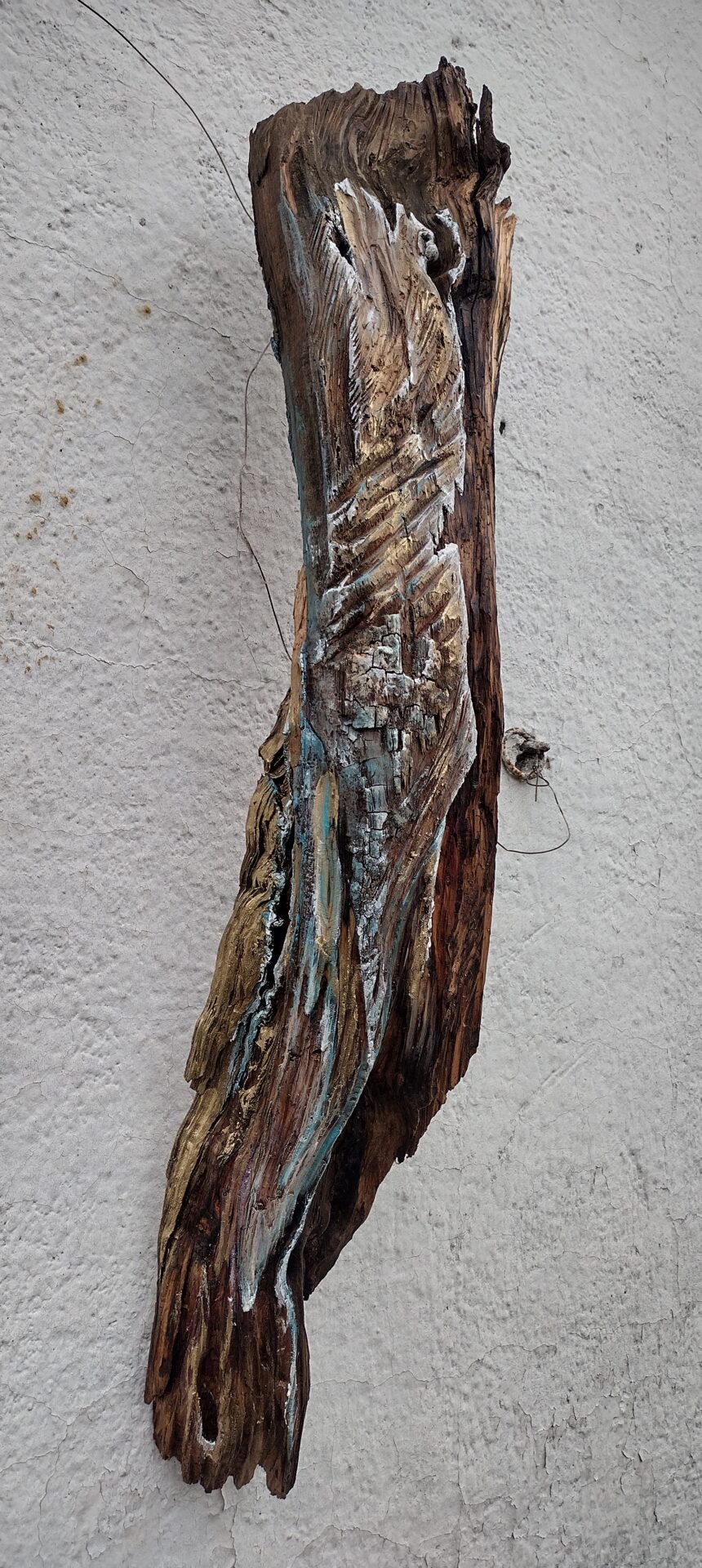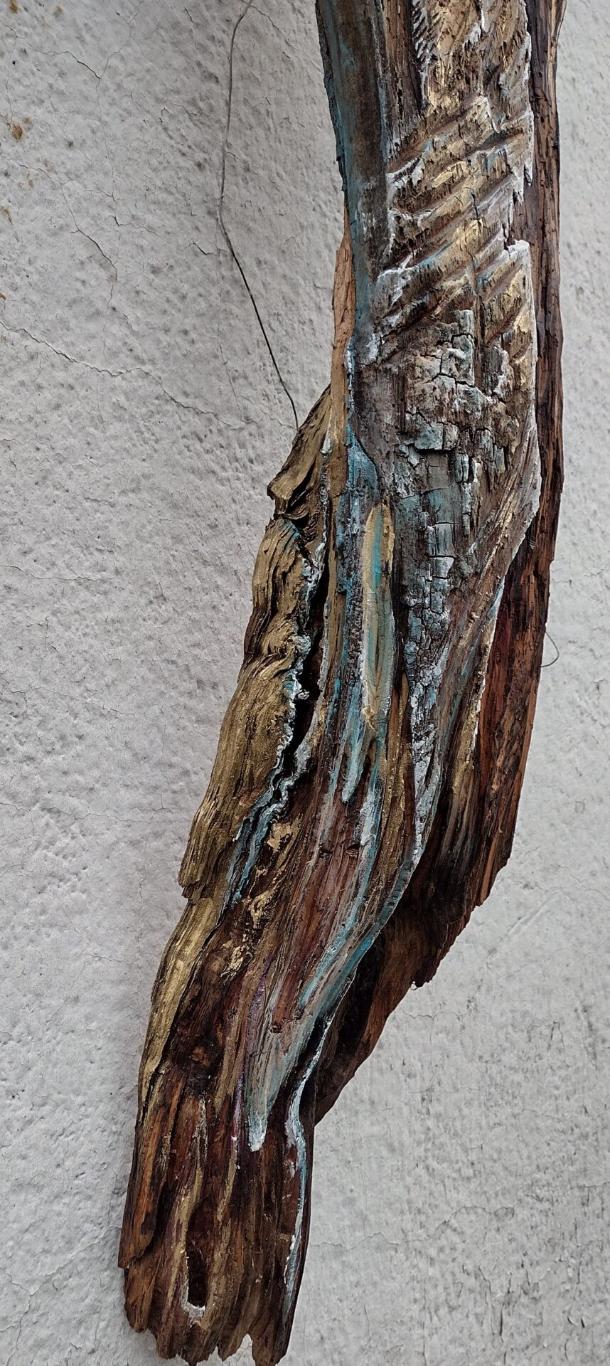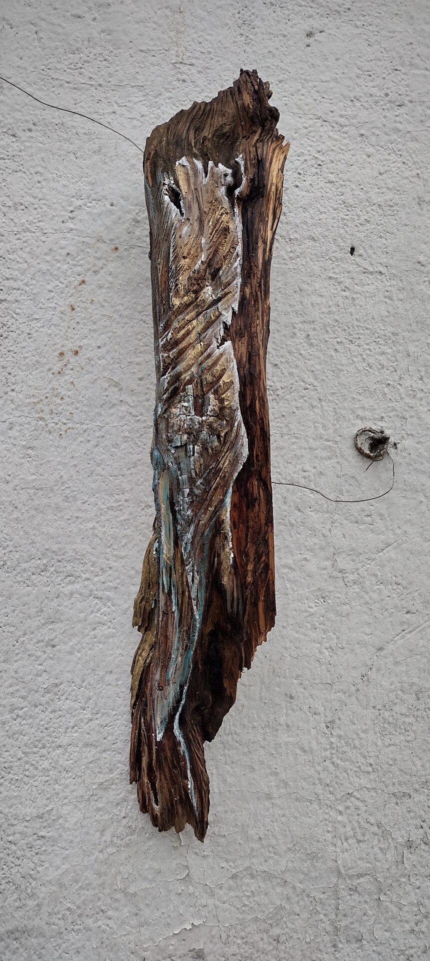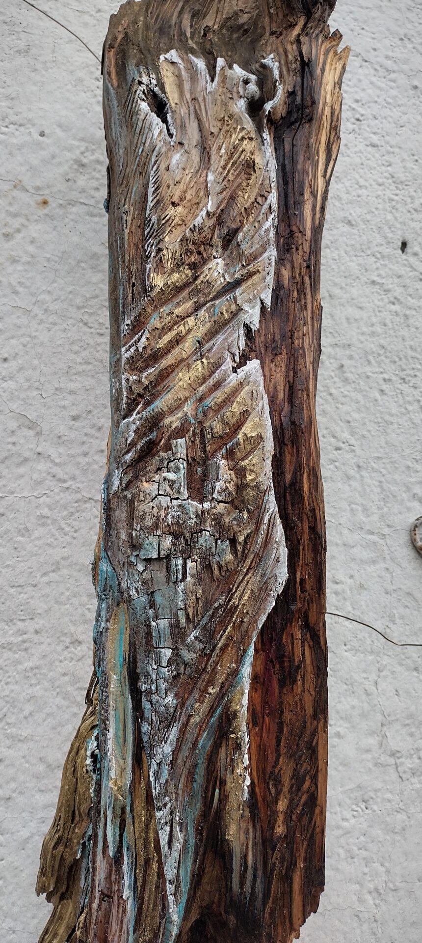 Rzeźba wykonana w dość grubym drewnie ,pięknym samym w sobie ,z drzewa po uderzaniu pioruna.(Historia drzewa jest ciekawa ,to było jego trzecie spotkanie z piorunem )