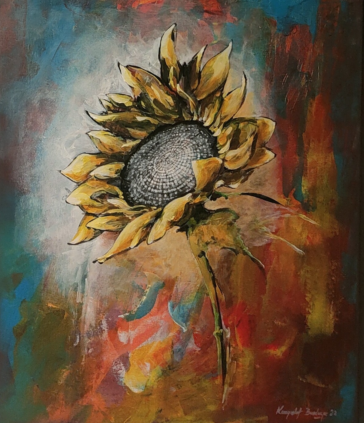 Obraz akrylowy na płótnie. Mechaniczne podejście do tematu kwiaty. Obraz posiada zamalowane boki i może być eksponowany bez ramy .