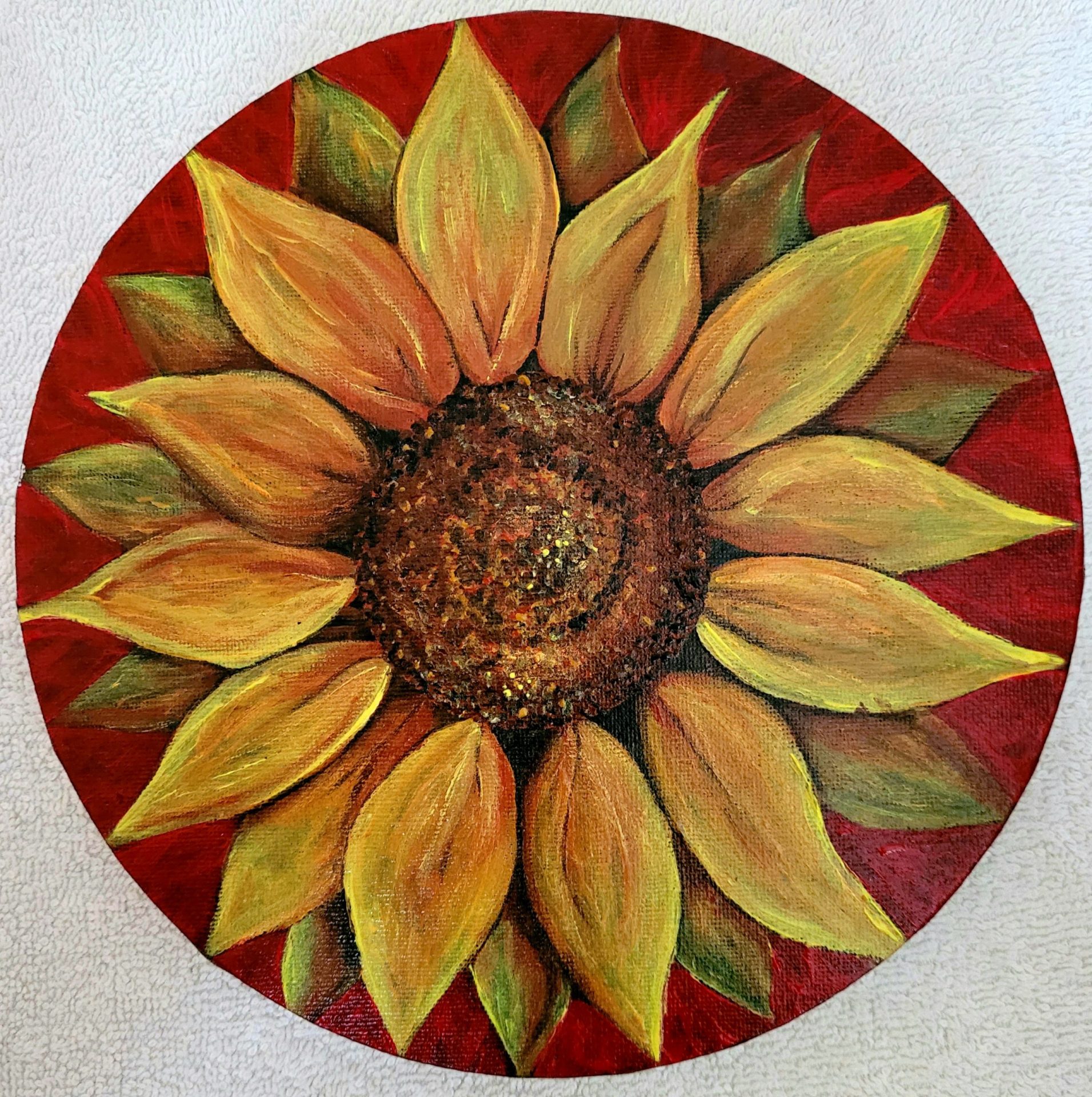 Średnica to 20 cm, jest to malarstwo akrylowe z 2019 roku pokryte werniksem.