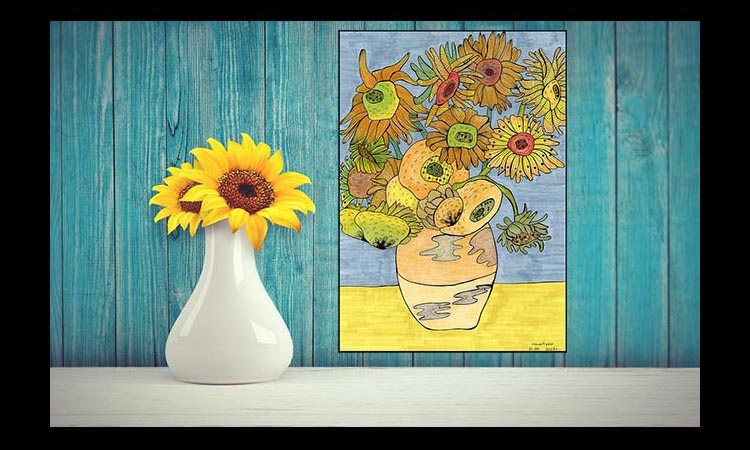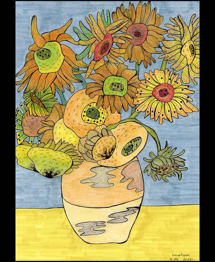 Tu kupujesz pliki cyfrowe do samodzielnego druku.”SŁONECZNIKI ZEN” – autorski, sygnowany rysunek. Oryginał rysowany kredkami i markerami.