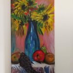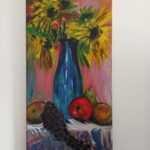 Obraz ręcznie malowany farbami akrylowymi na płótnie, zabezpieczony matowym werniksem, sygnowany, technika autorska, boki obrazu pomalowane w kolorze tła.