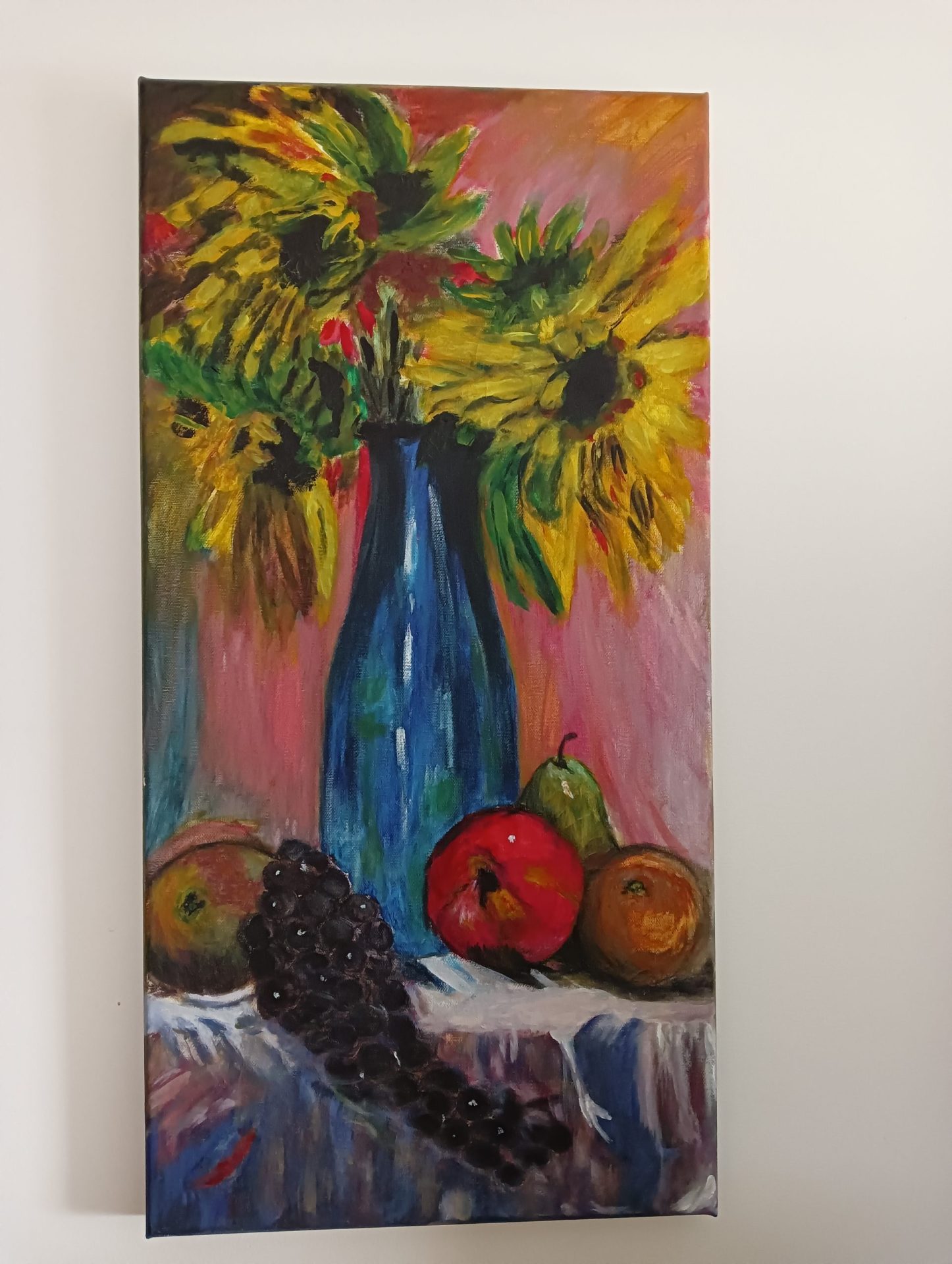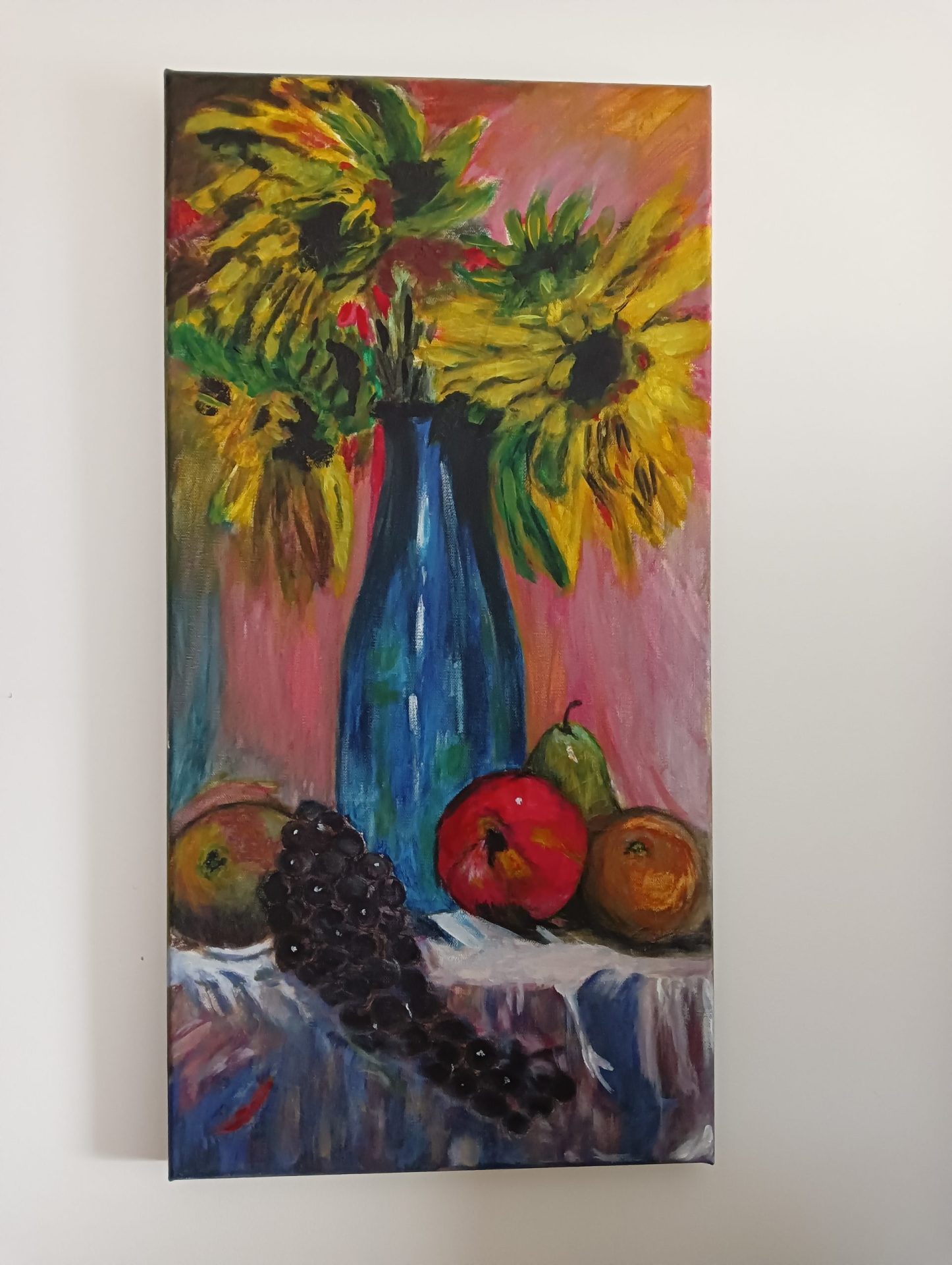 Obraz ręcznie malowany farbami akrylowymi na płótnie, zabezpieczony matowym werniksem, sygnowany, technika autorska, boki obrazu pomalowane w kolorze tła.