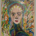 To obraz ekspresyjny w stylu abstrakcyjnym, przedstawiający kobiecą twarz. Intensywne czerwone usta oraz wyraziste, ciemne oczy kontrastują z tłem pełnym dynamicznych żółtych, niebieskich i różowych barw. Linie i pociągnięcia pędzla tworzą wrażenie energii i emocji.