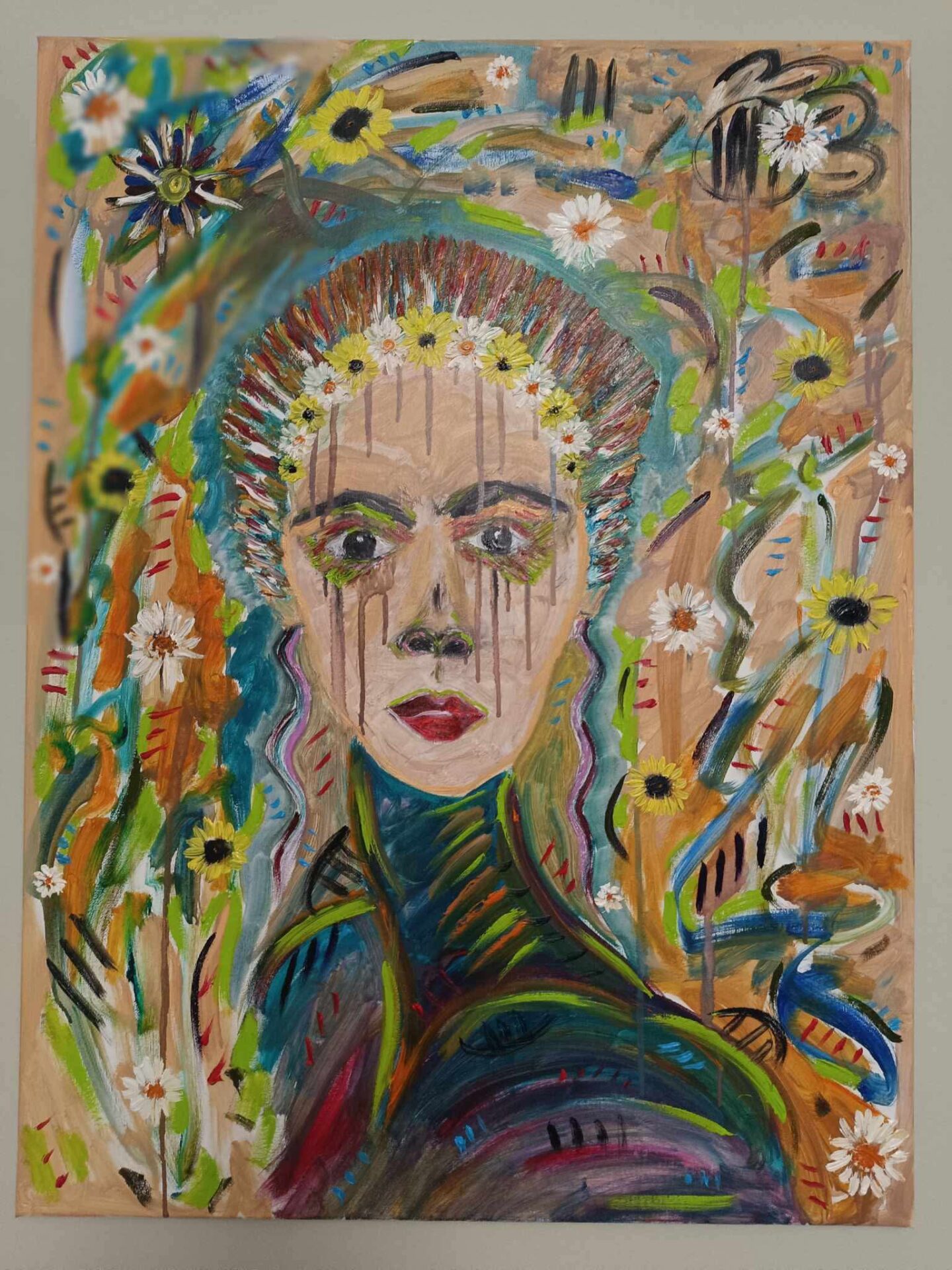 To obraz ekspresyjny w stylu abstrakcyjnym, przedstawiający kobiecą twarz. Intensywne czerwone usta oraz wyraziste, ciemne oczy kontrastują z tłem pełnym dynamicznych żółtych, niebieskich i różowych barw. Linie i pociągnięcia pędzla tworzą wrażenie energii i emocji.