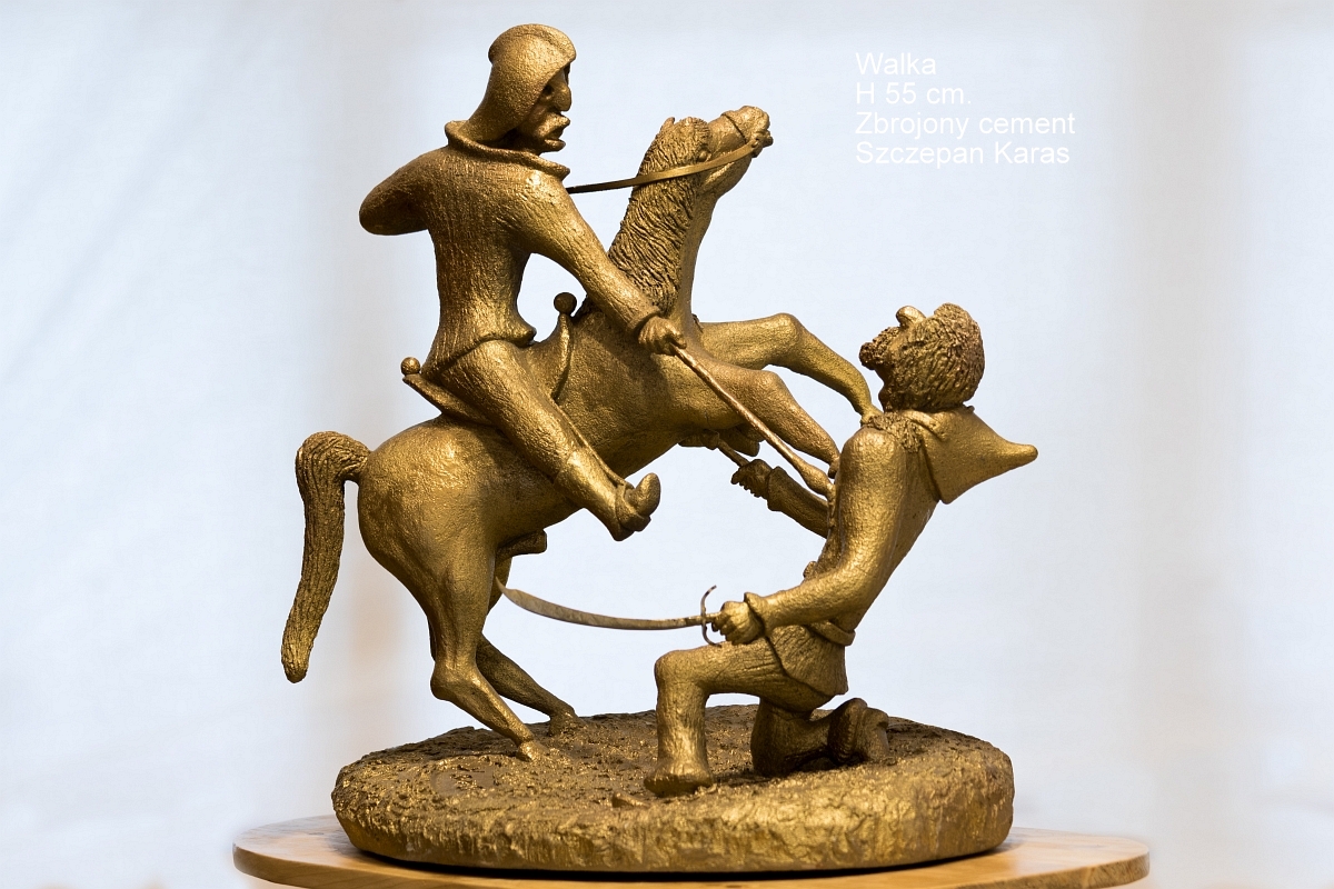 Jeździec na koniu w śmiertelnym starciu z piechurem z szablą w dłoni powalonym końskim kopytem i ugodzonym piką przez konnego.
