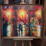 „Spacer w deszczu” – obraz olejny malowany na płycie o wymiarach 100 x 80 cm. Przedstawia nastrojową scenę pełną emocji i bliskości, ukazującą dwie postacie w deszczu. W subtelnej grze światła i cienia deszcz tworzy aurę intymności, podkreślając wyjątkowy moment wspólnego spaceru. Idealny dla miłośników sztuki pełnej uczuć i refleksji.