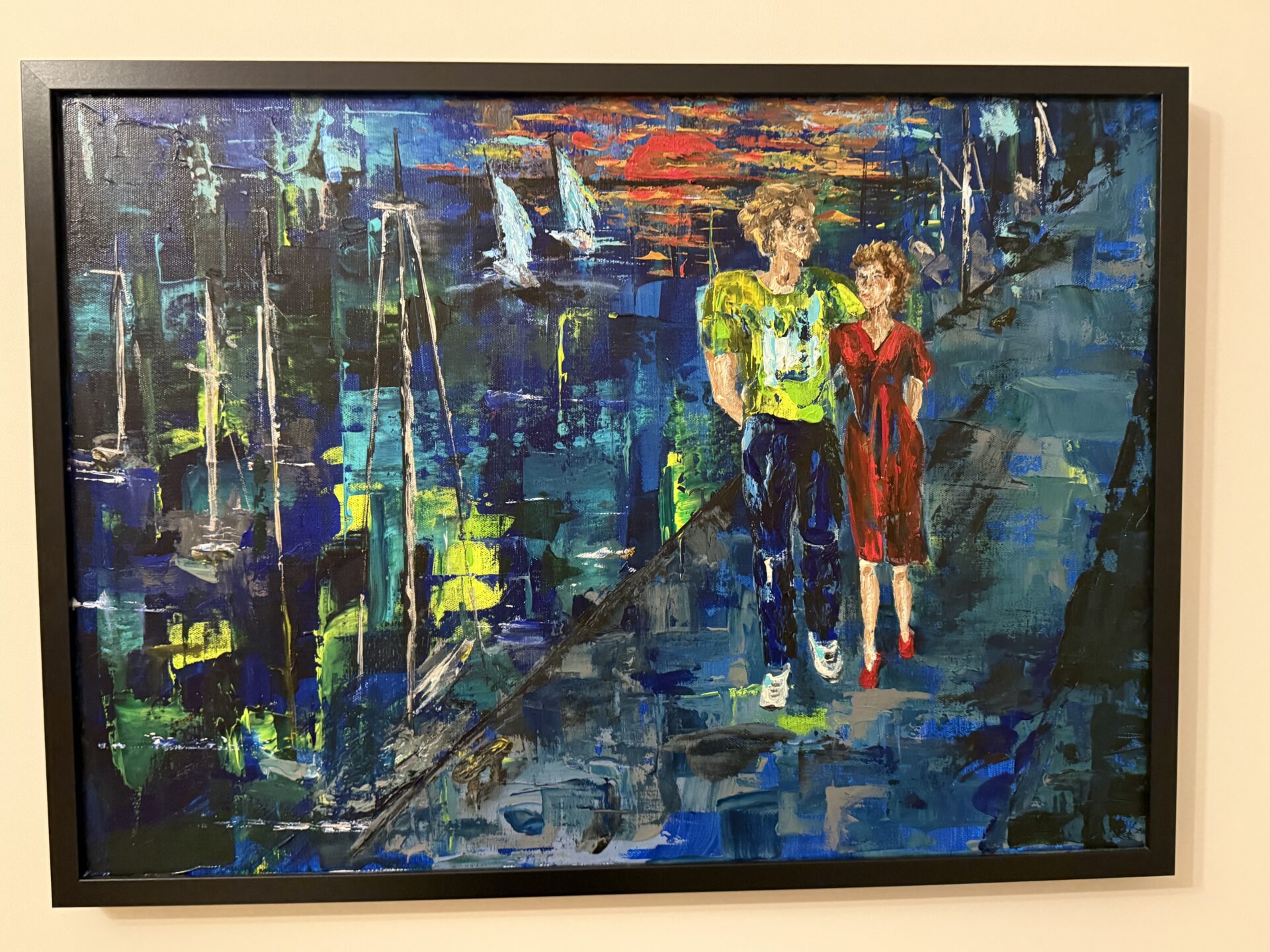 Para spacerująca przy porcie jachtowym o zachodzie słońca. Na pierwszym planie widać aluminiowe maszty jachtów zacumowanych w porcie. Parę . A na drugim planie zawijające do portu dwa jachty otulone zachodzącym , w czerwieni, słońcem. Woda odbija portowe światła.