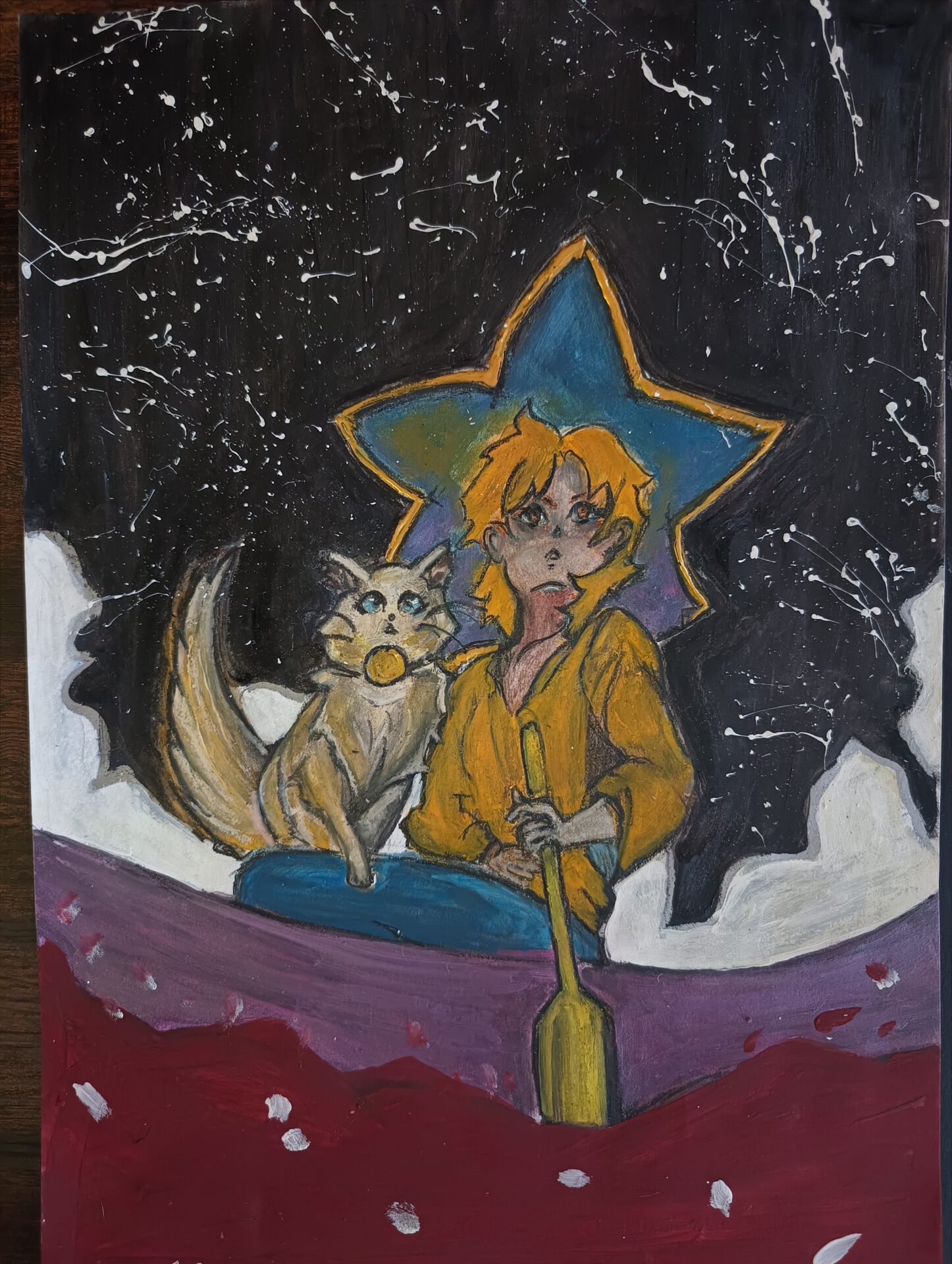 Rysunek techniką mieszaną akryl i pastele. Ilustracja przedstawia postać z gry Spiritfarer, która ukazuje jak ulotne jest życie i przedstawia ciągłą podróż. Rysunek jest typowym rysunkiem game-artowym. Rozmiar A3 oraz zdjęcie wykonane w świetle dziennym. Możliwość oprawienia w antyramę.