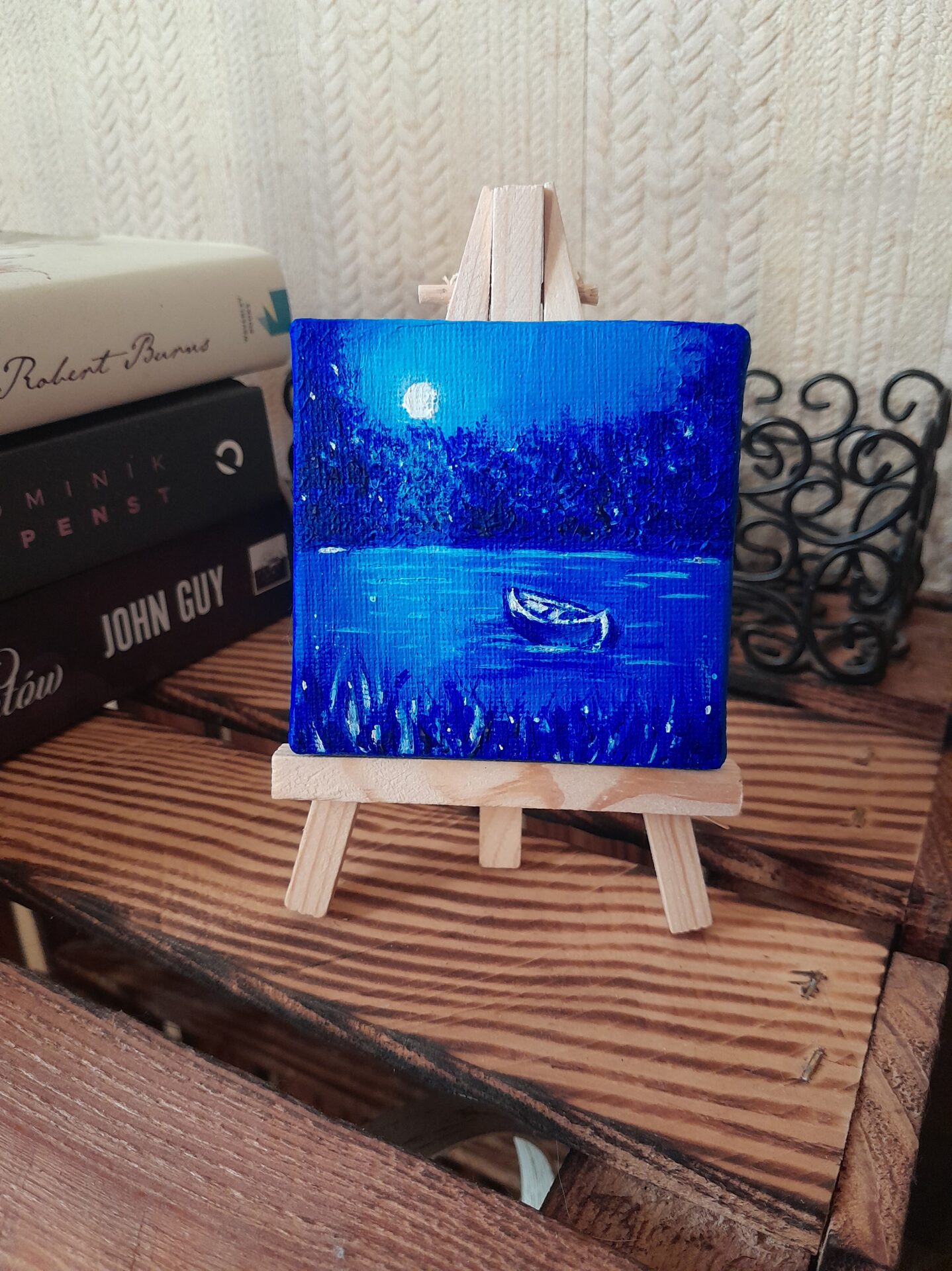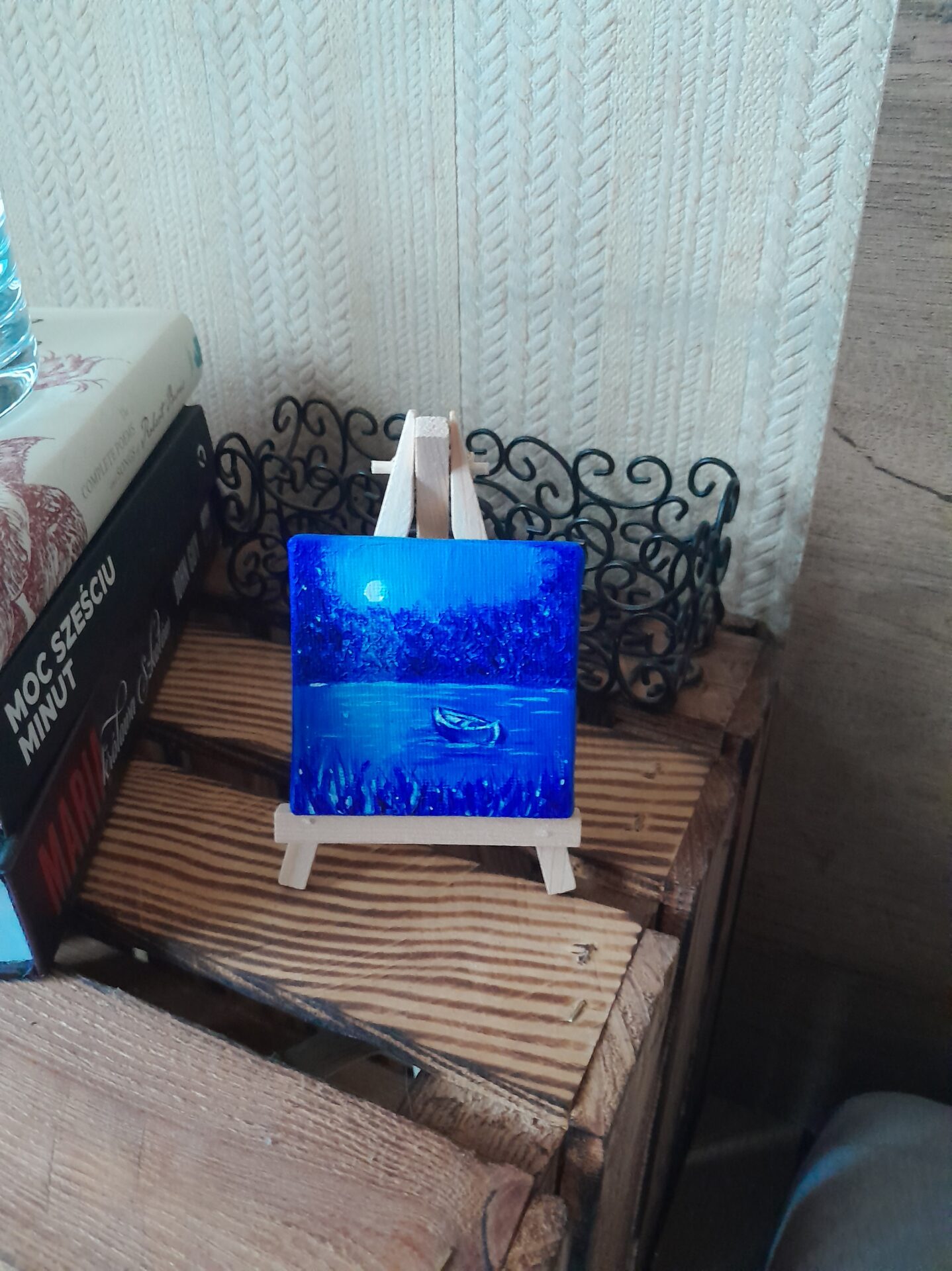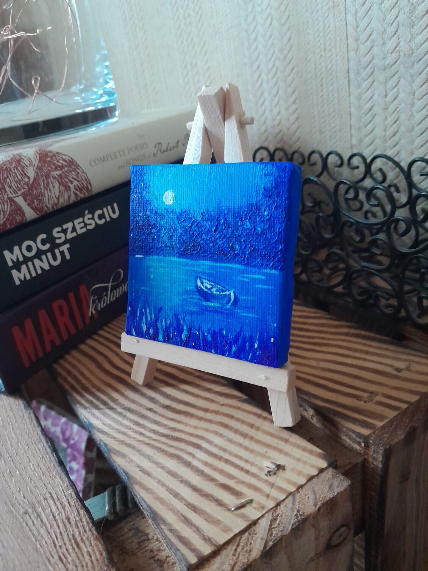 Obrazek na płótnie, malowany farbami akrylowymi. Oryginalna ozdoba pomieszczenia o wymiarach 13cm/8cm wraz ze sztaluga, samo płótno 7cm/7cm. Serdecznie polecam.