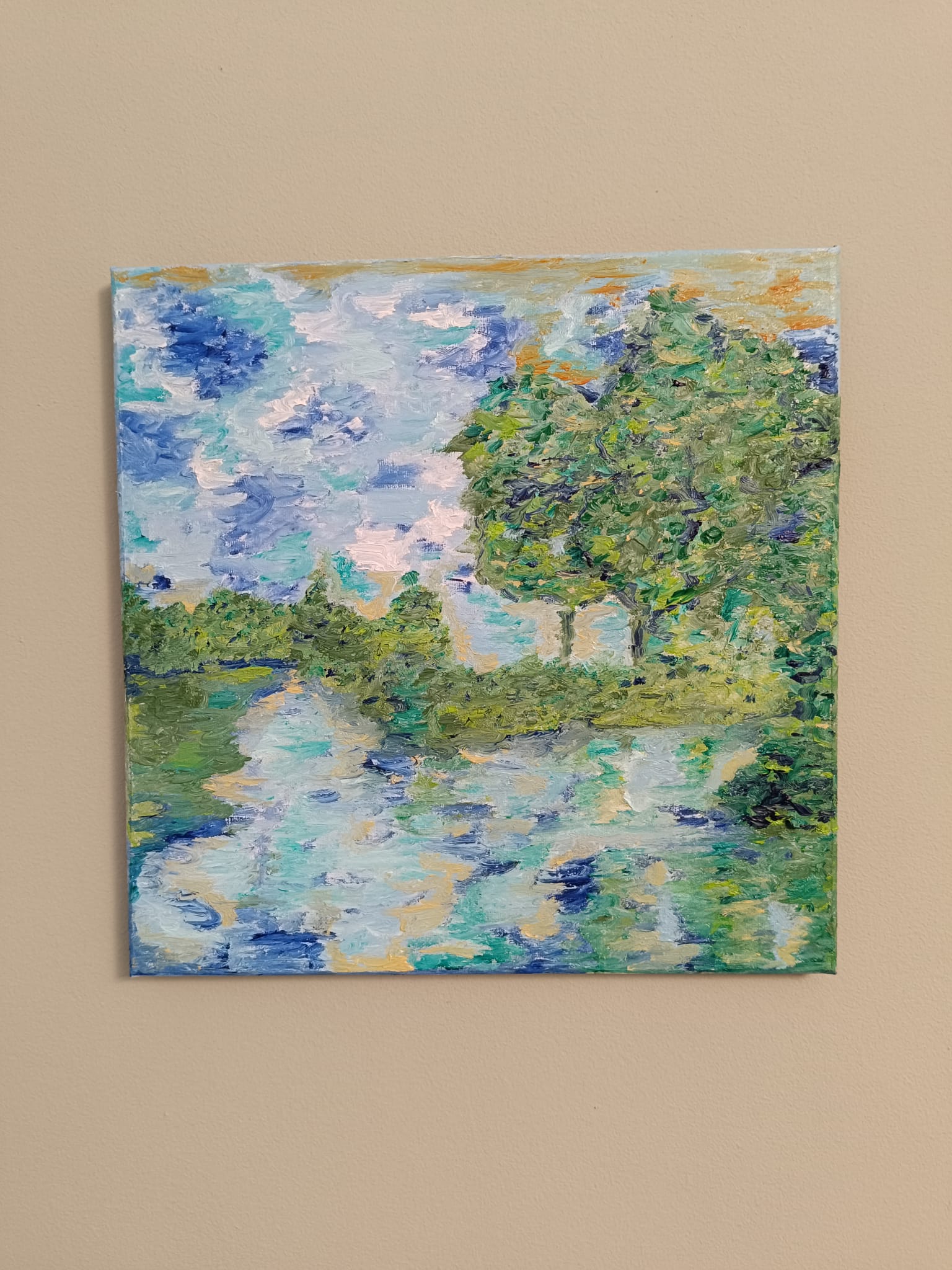 Ten impresjonistyczny obraz przedstawia idylliczny pejzaż z rzeką odbijającą niebo i otaczające ją drzewa. Malarskie, luźne pociągnięcia pędzla oddają dynamikę wody i ruch powietrza, tworząc wrażenie lekkości i ulotności chwili. Dominują chłodne odcienie niebieskiego i zieleni, przeplatane ciepłymi akcentami żółci, co nadaje pracy harmonijny i spokojny charakter. Idealnie uchwycona atmosfera natury zachęca do refleksji i wyciszenia.
