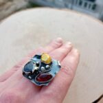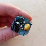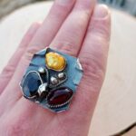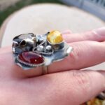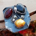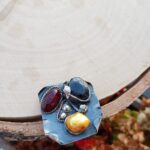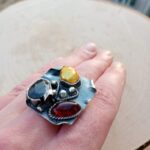Bardzo duży srebrny pierścień z szafirem, bursztynem bałtyckim i złotą perłą.