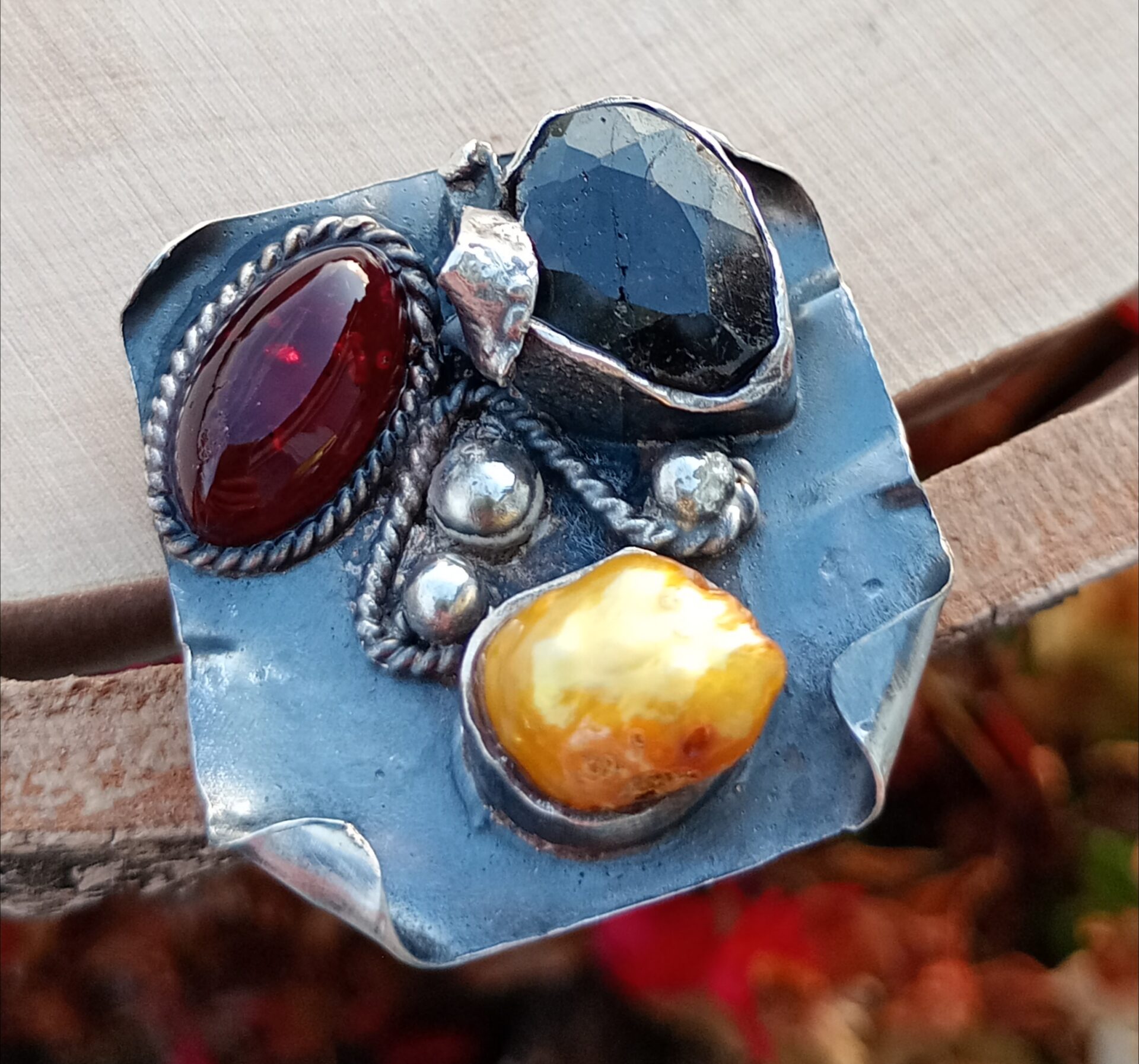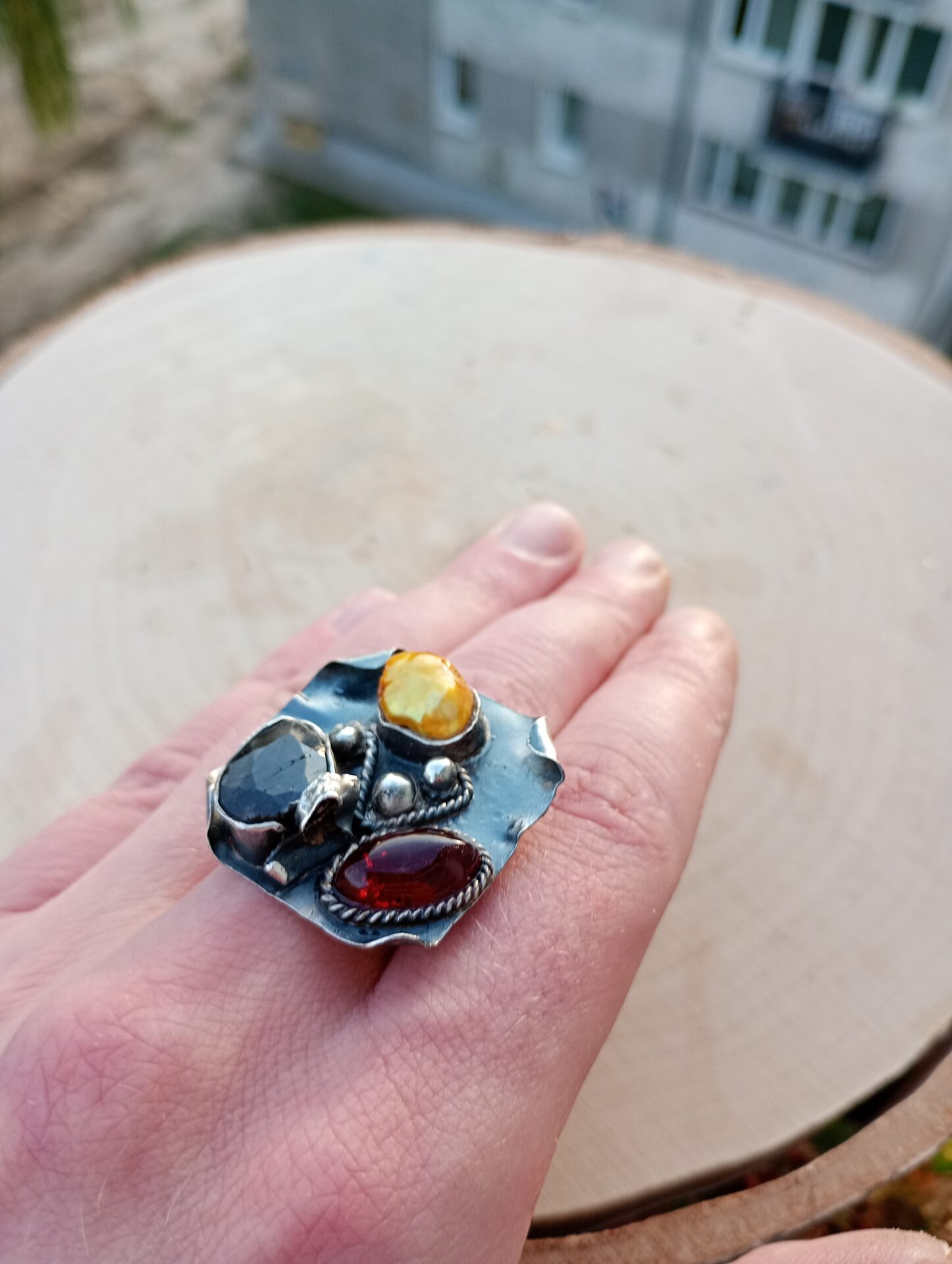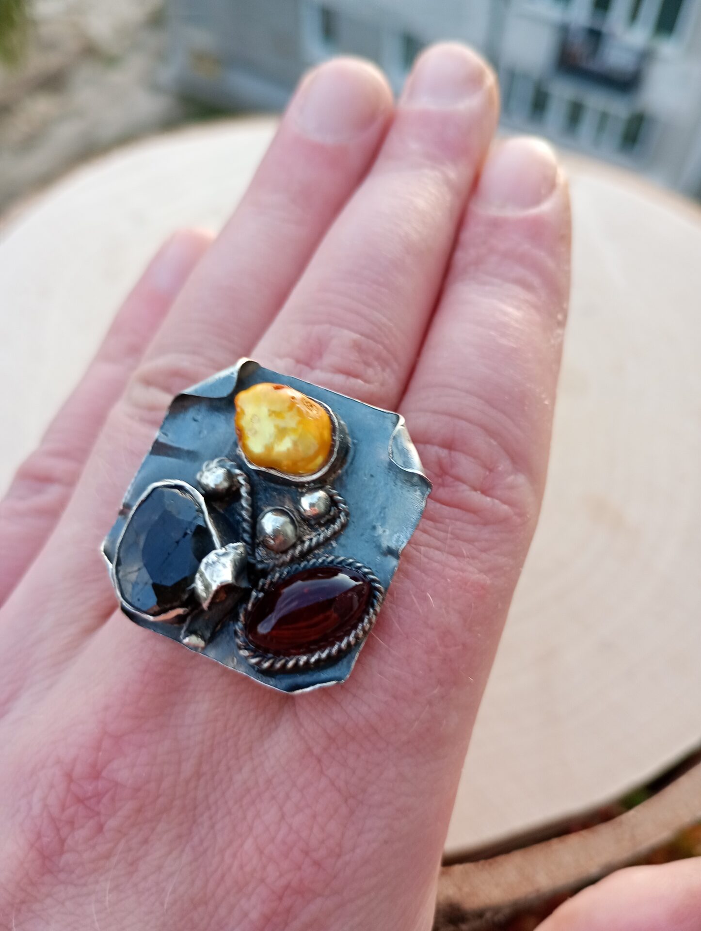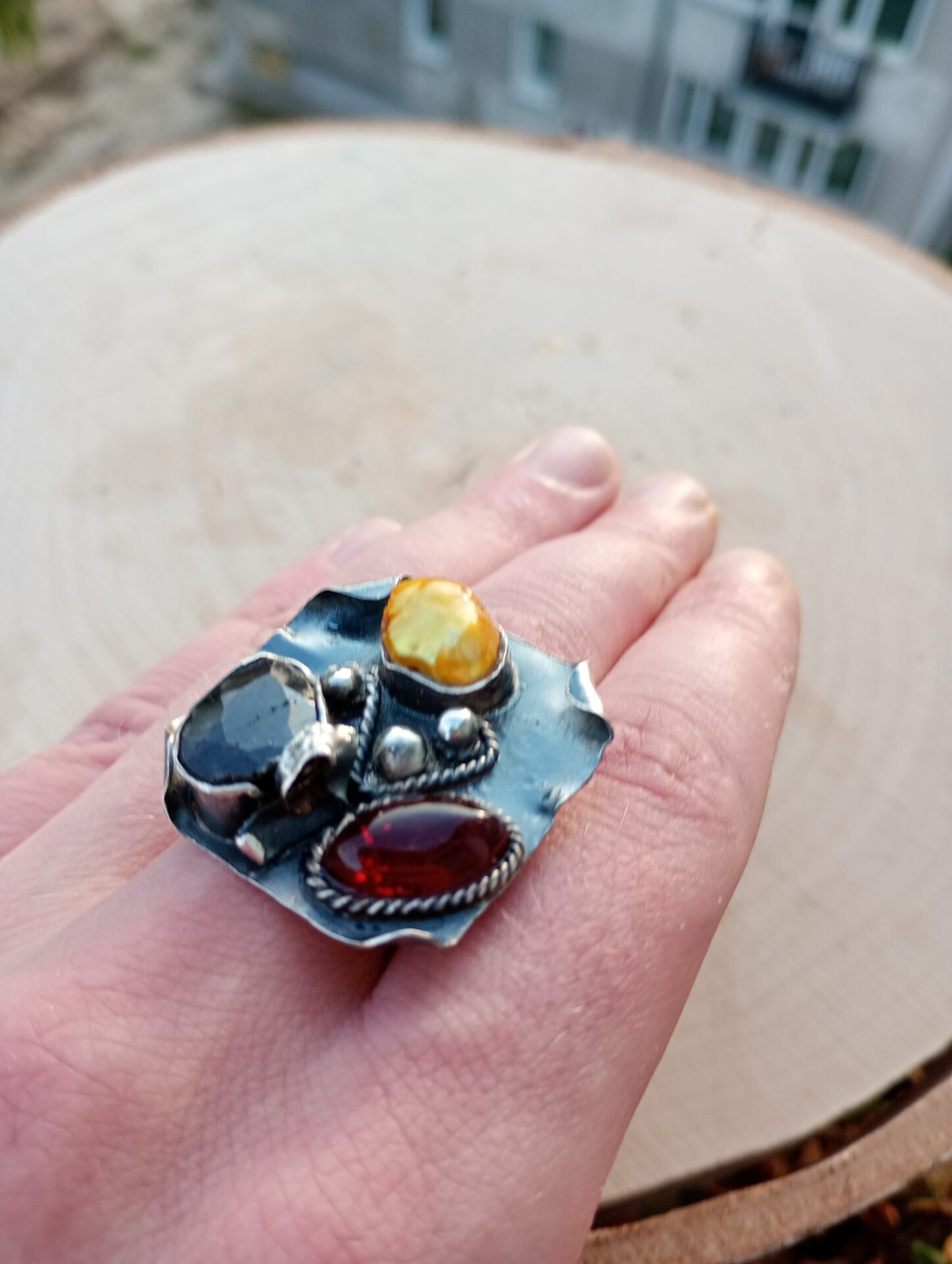 Bardzo duży srebrny pierścień z szafirem, bursztynem bałtyckim i złotą perłą.