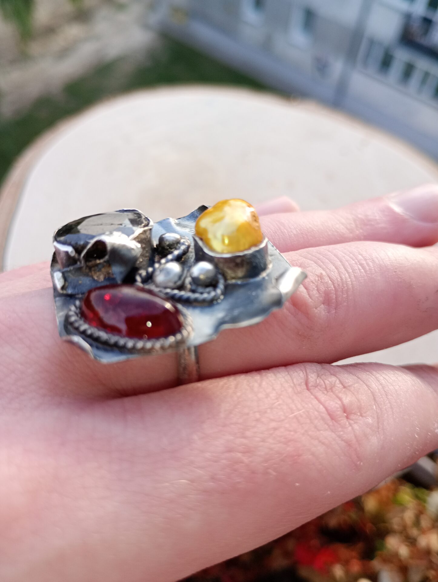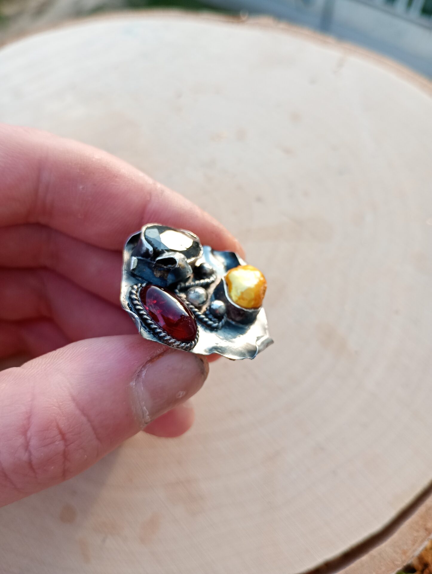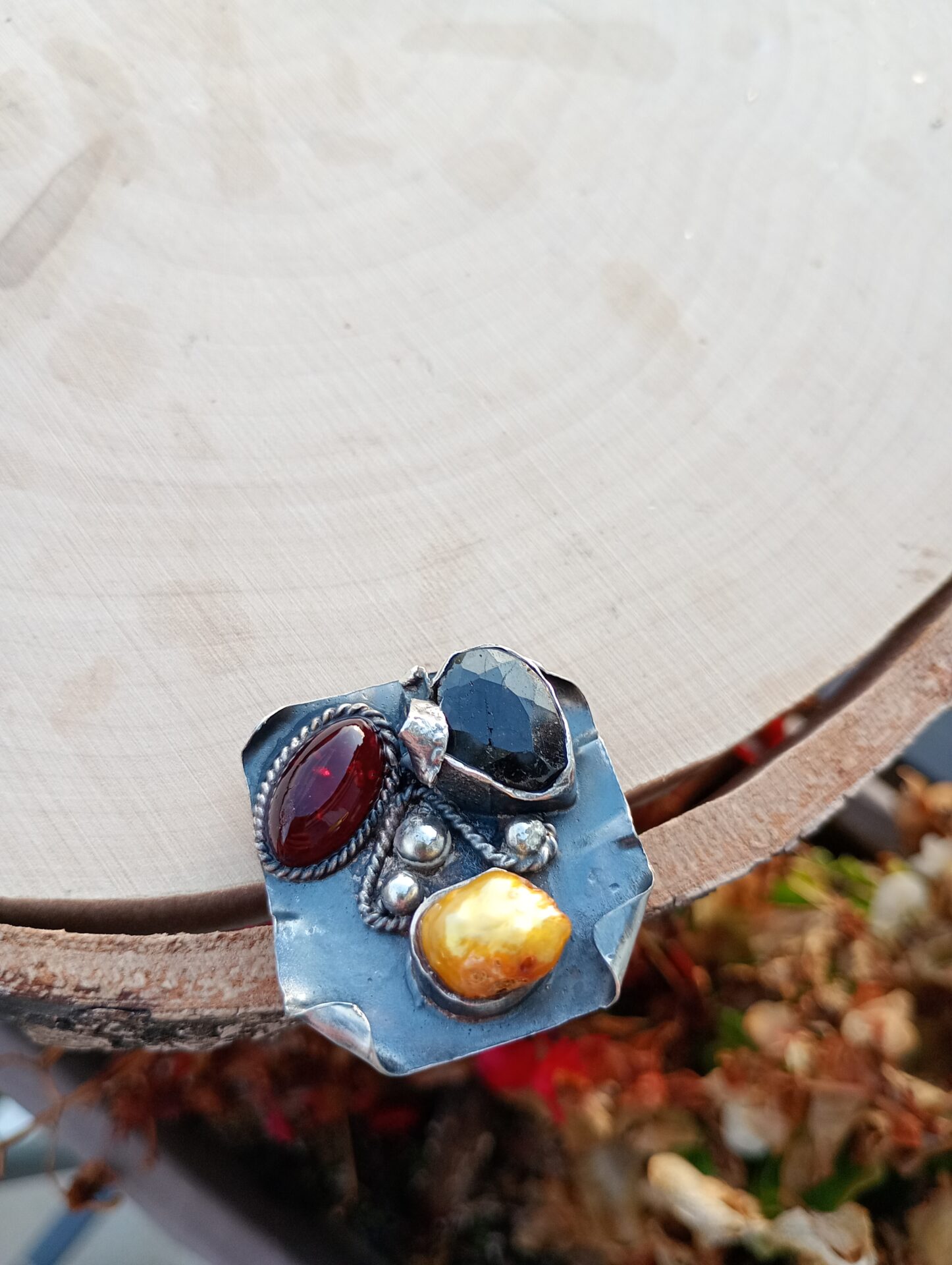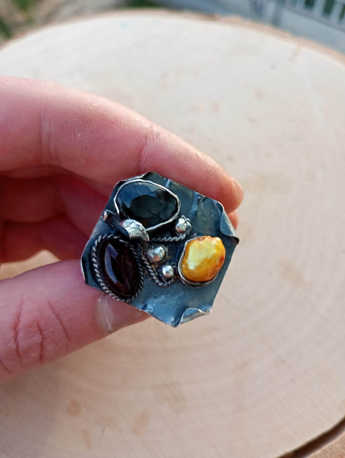Bardzo duży srebrny pierścień z szafirem, bursztynem bałtyckim i złotą perłą.