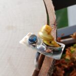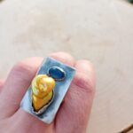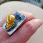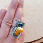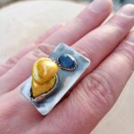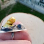 Srebrny pierścionek z dużą złotą perłą barokową i kianitem.