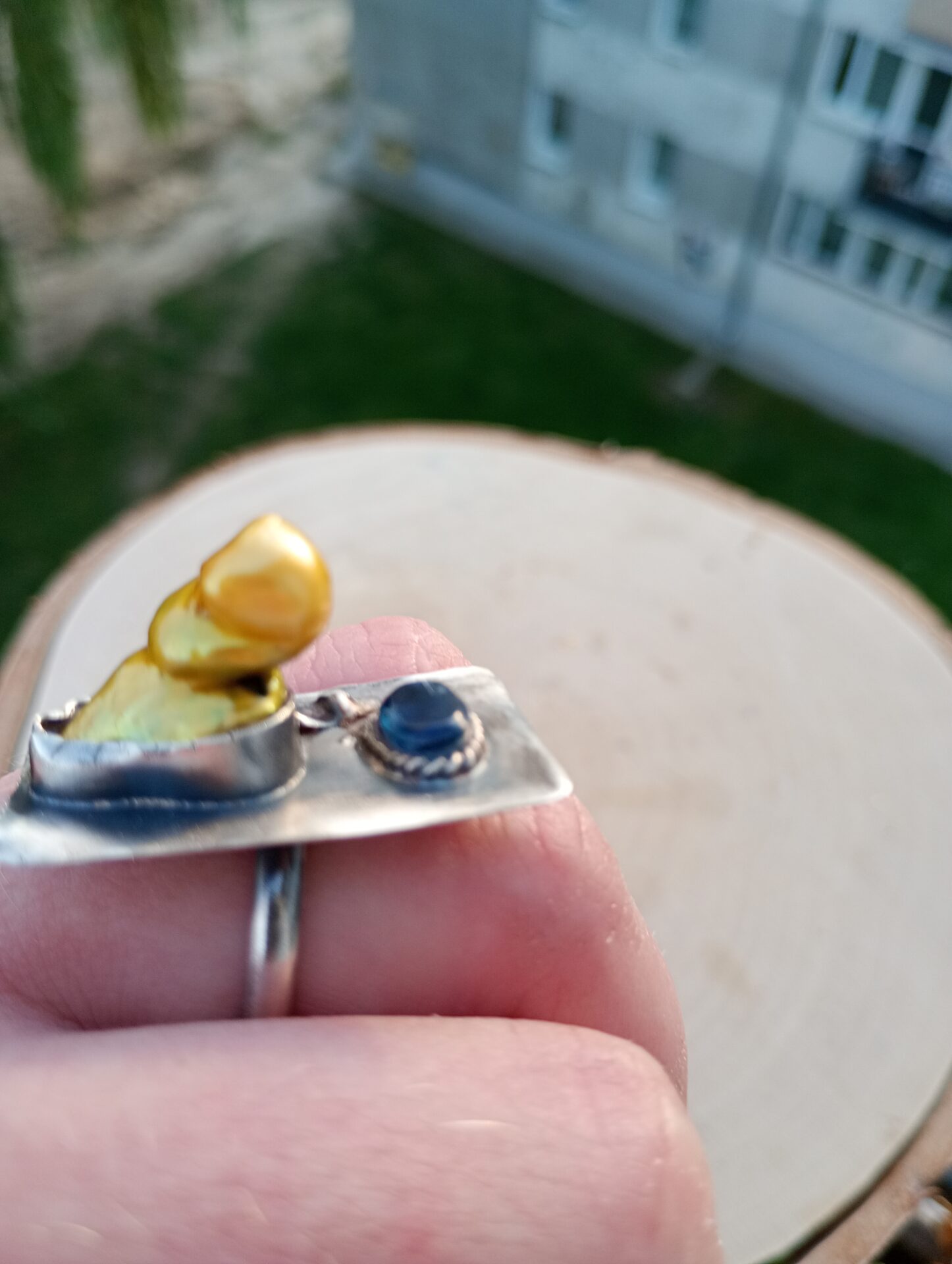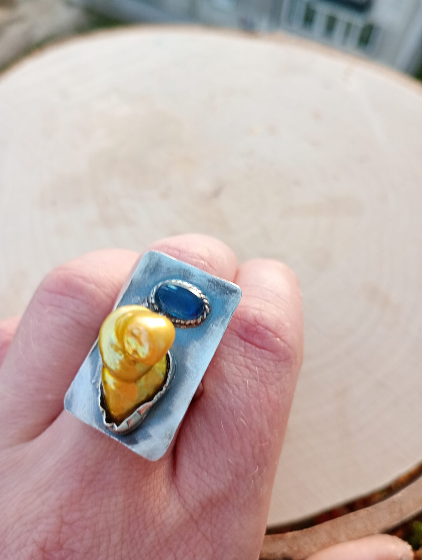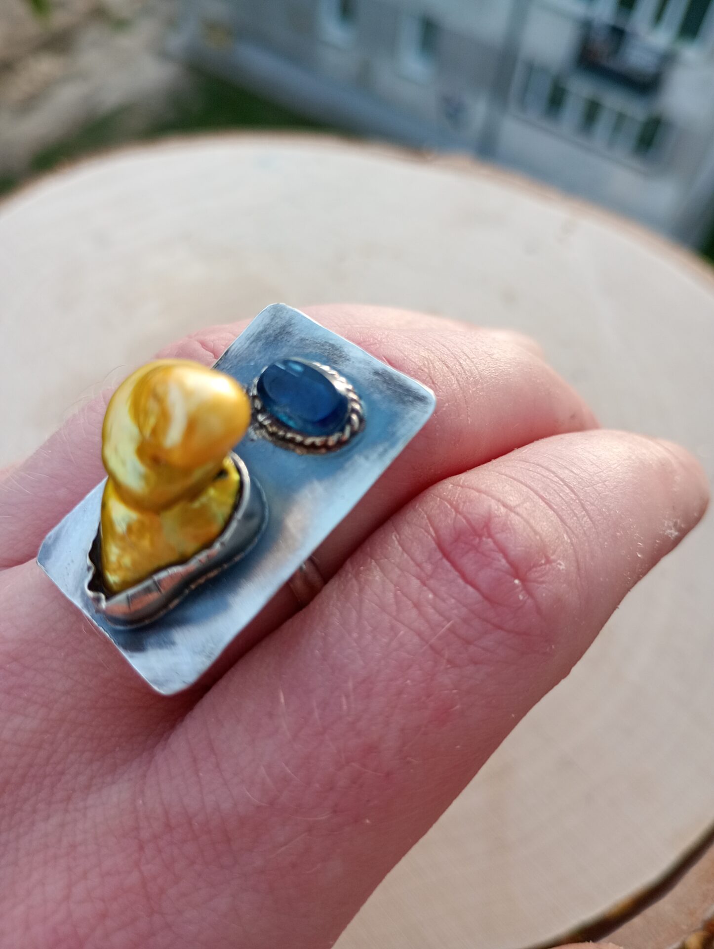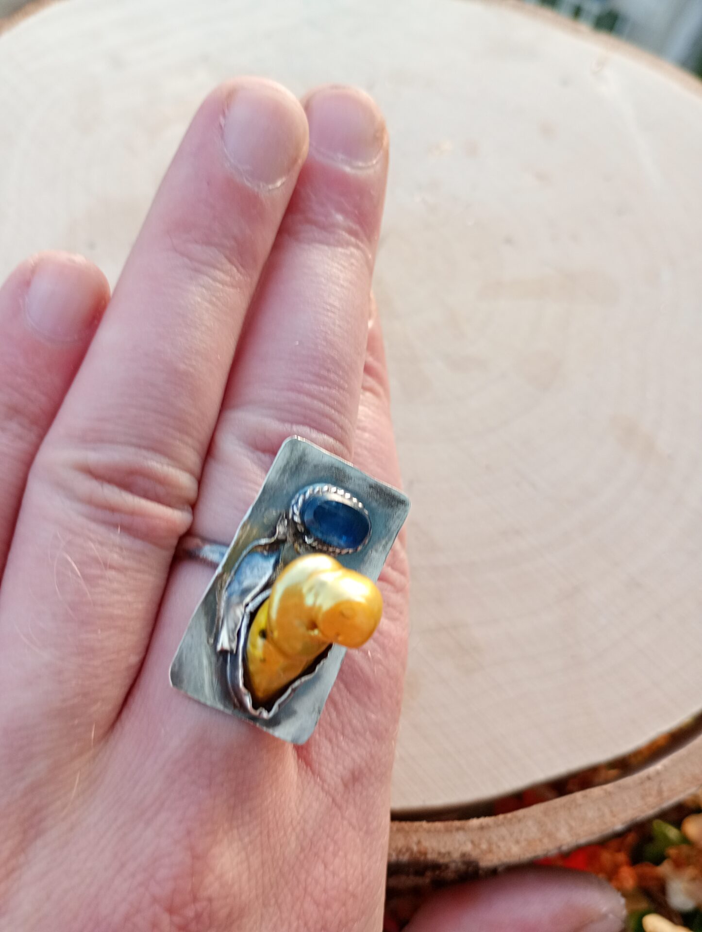 Srebrny pierścionek z dużą złotą perłą barokową i kianitem.