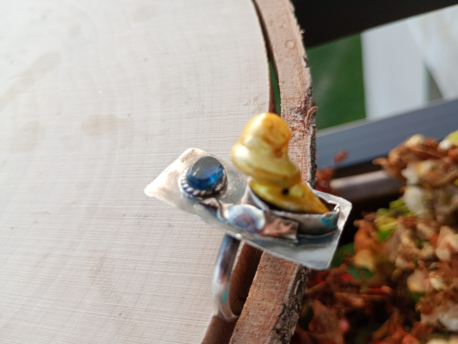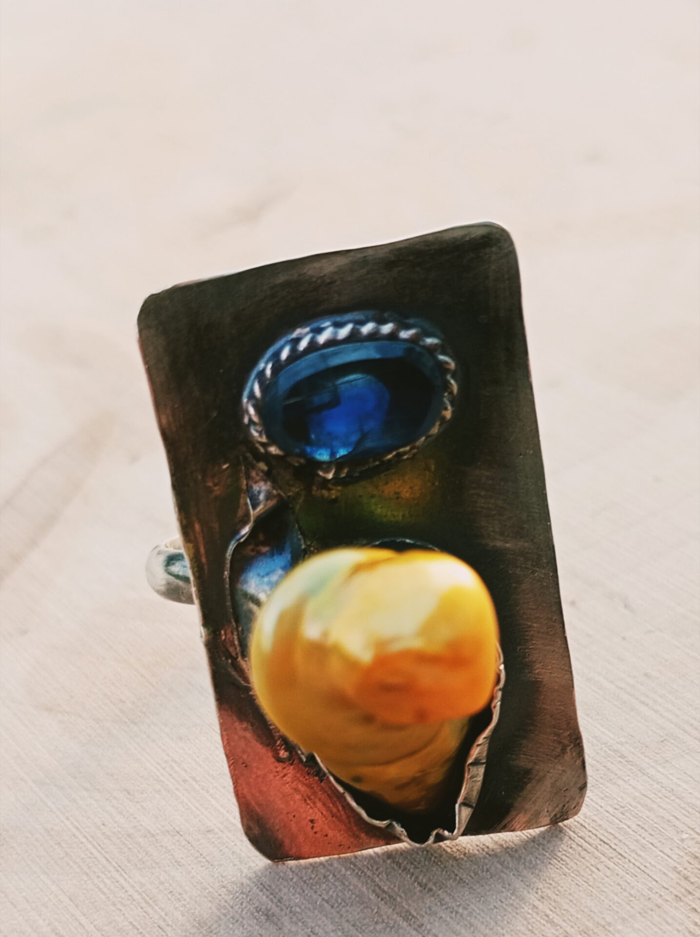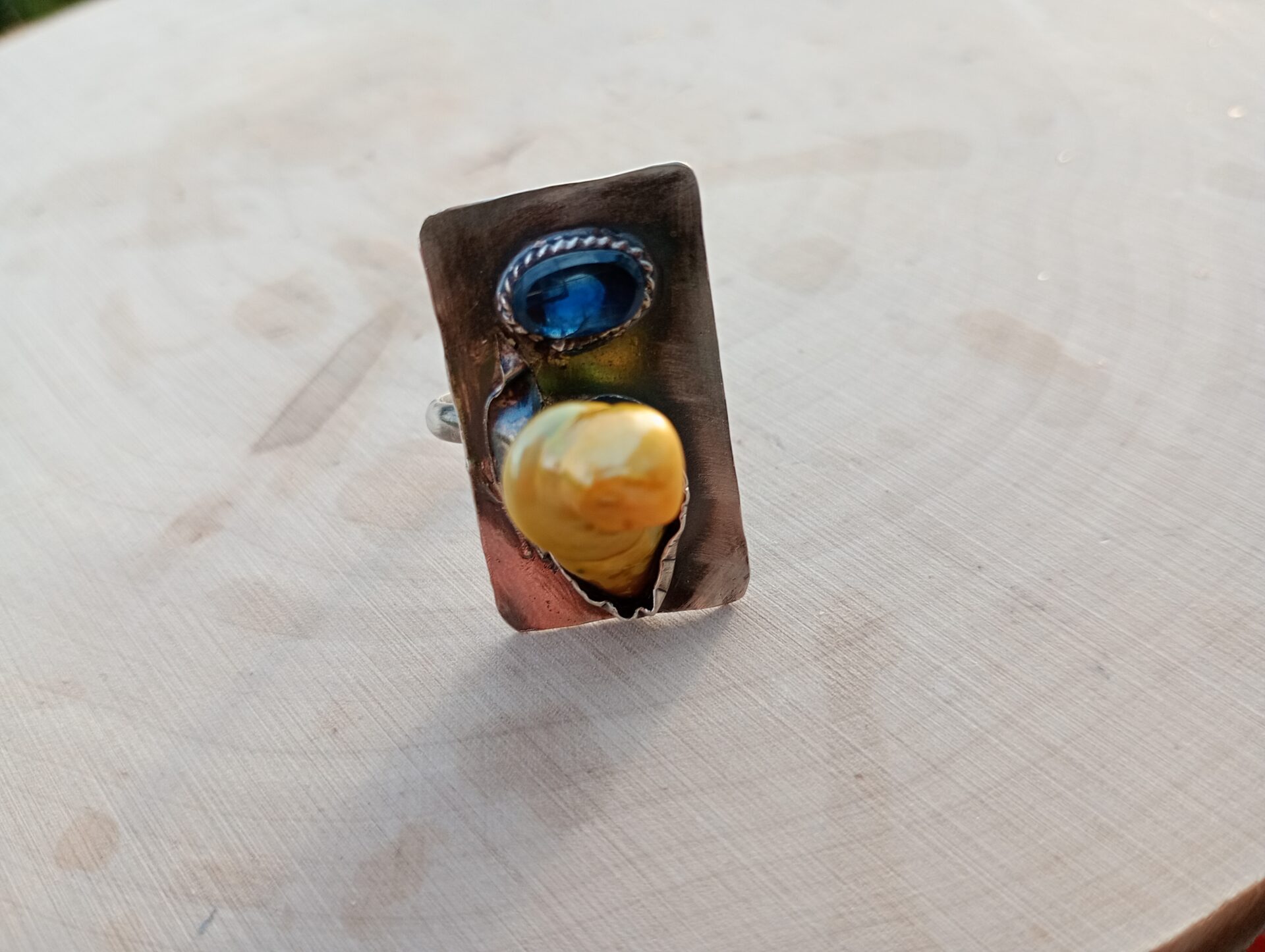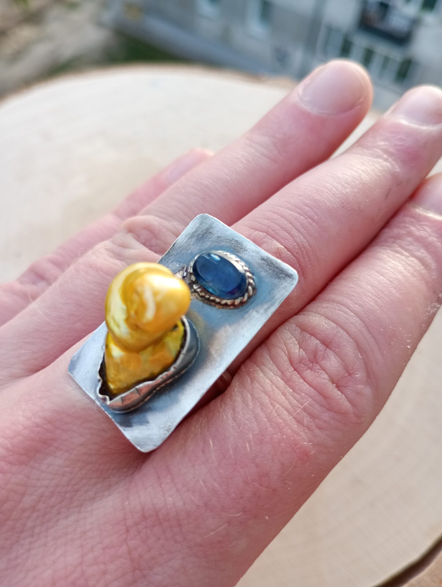 Srebrny pierścionek z dużą złotą perłą barokową i kianitem.