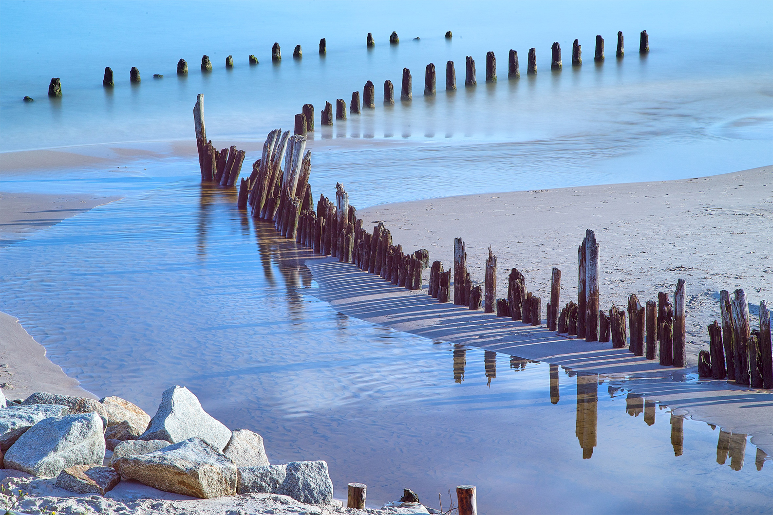 Fotografia przedstawia palisadę przy strumieniu, który spływa z Błot Karwieńskich do Bałtyku. Oryginalność fotografii polega na tym że nie widać fal wód Bałtyku, choć w podczas fotografowania były, ani jakiejkolwiek zmarszczki na wodzie strumienia, choć w rzeczywistości całkiem żwawo spływała. Efekt wygładzania uzyskany został przez wydłużenie czasu ekspozycji do 10 minut, uzyskałem to przez nałożenie na obiektyw neutralnie szarego, bardzo ciemnego filtra, przedłużającego czas ekspozycji kilkusetkrotnie. W ten sposób uzyskałem efekt stanu spoczynku wód Bałtyku. Fotografia opatrzona certyfikatem jakości wydruku z hologramem nr.A001751, wydanym przez Qprint. Druk cyfrowy giglée. Atrament 8-kolorowy pigmentowy HP Vivera. Podłoże: papier Hahnemuhle German Etching 310 g. Limit druku 10 egzemplarzy, wydruk 1/10.