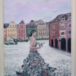 Uproszczona wizualizacja poznańskiego Starego Rynku z wyimaginowaną dziewczyną skupiającą wszystkie staromiejskie gołębie. Obraz malowany farbami akrylowymi na płótnie, zabezpieczony werniksem, oprawiony w ramkę. Wymiary podane z ramką.