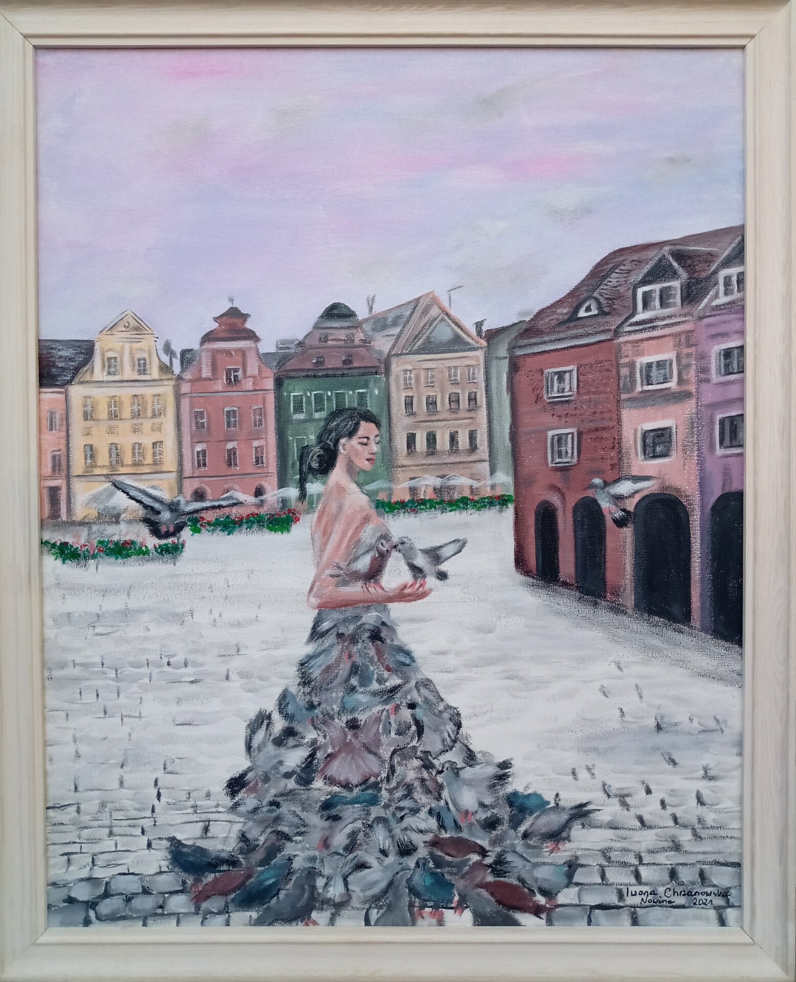 Uproszczona wizualizacja poznańskiego Starego Rynku z wyimaginowaną dziewczyną skupiającą wszystkie staromiejskie gołębie. Obraz malowany farbami akrylowymi na płótnie, zabezpieczony werniksem, oprawiony w ramkę. Wymiary podane z ramką.