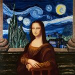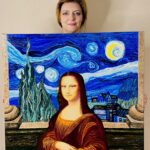 Obraz pt. „Starry Lisa” inspirowany twórczością dwóch uwielbionych przeze mnie malarzy: Leonardo da Vinci i Vincent van Gogh. Obraz namalowany w grudniu 2024r, wymiary 80x80cm, akryl na płótnie z wykorzystaniem metody pouringu, pokryty werniksem. Pięknie prezentuje się na jasnym tle ponieważ barwy są bardzo wyrażne. Polecam serdecznie.