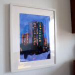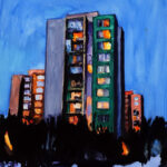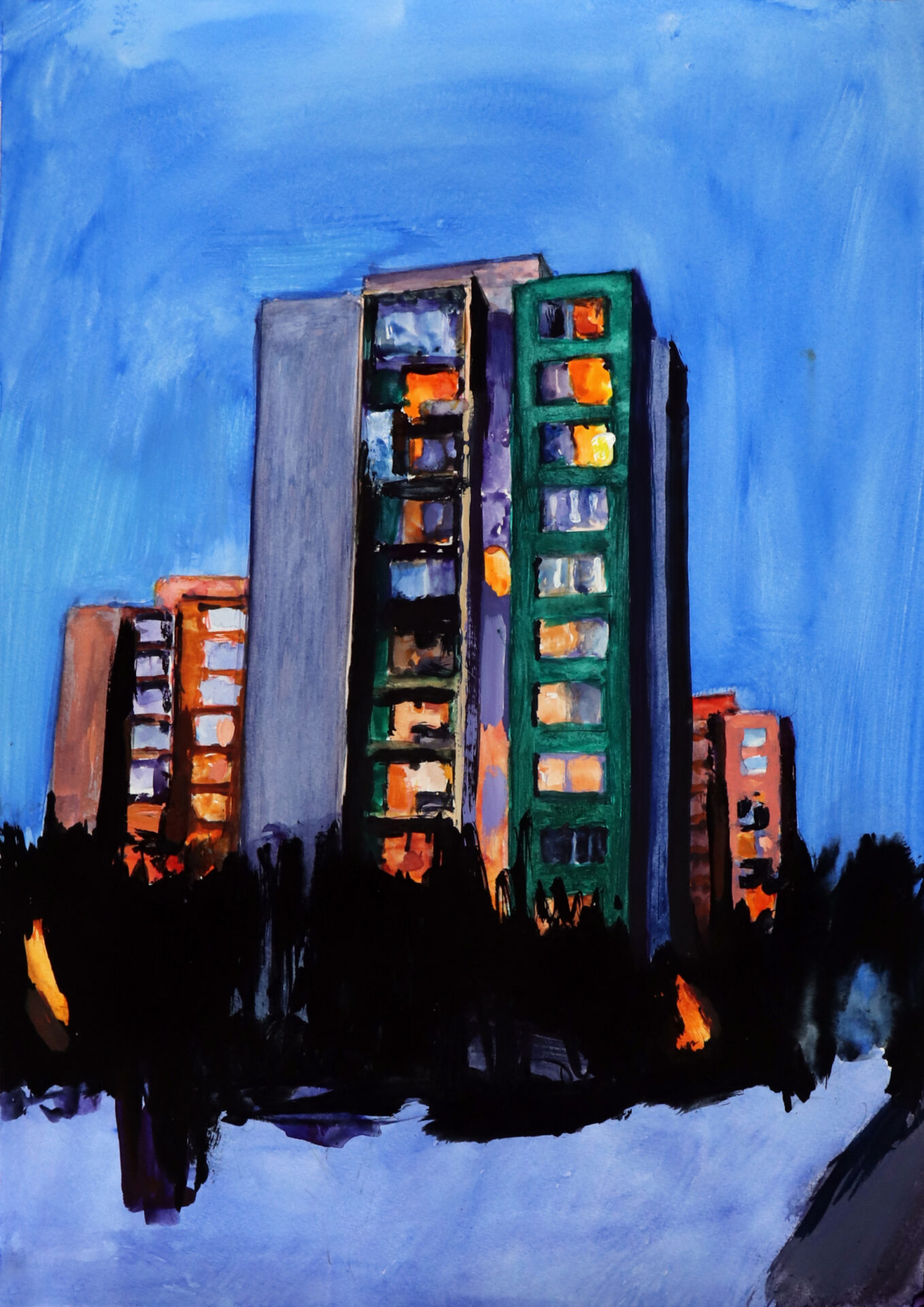 Obraz akwarelowy z dodatkiem gwaszu z roku 2024. Obraz należy do jednego z najstarszych cykli w mojej twórczości pt.: Stegny. Cykl ten związany jest z moim Miejscem Zamieszkania. Taki tytuł nosiła moja druga wystawa z 2007 r. Był to malarski reportaż z najbliższej okolicy, miejsca codziennych obserwacji malarskich, często notowanych intuicyjnie, później dokumentowanych fotograficznie. Obraz jest wersją papierową większego obrazu sztalugowego. Oryginał na płótnie znajduje się w kolekcji prywatnej w Austrii.