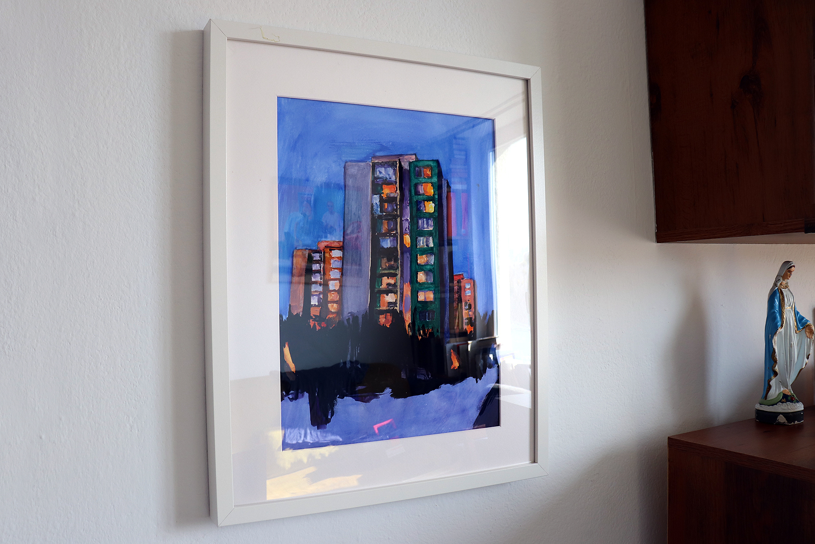 Zimowy błękit spowija całą okolicę. Śnieżny dywan z odrobiną błękitu jest jasnym dopełnieniem ciemniejszego nieba. Również większość budynków wtapia się w zimną, mglistą atmosferę. I na tym tle rozbłyska w pełni swoim niezapomnianym blaskiem szeregowo ustawiony kalejdoskop gorących światełek, wydobywających się przez szyby z ciepłych, jasno oświetlonych mieszkań bloku. Jak lampki na choince, raz gasnąc, to znów rozbłyskając, współtworzą niezapomnianą aurę świąt. Kompozycje dopełniają ciemne kontury okolicznych krzaków, których głęboka, zielona czerń podkreśla miękkość delikatnych połaci chłodnego śniegu.