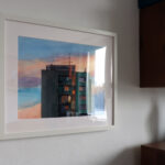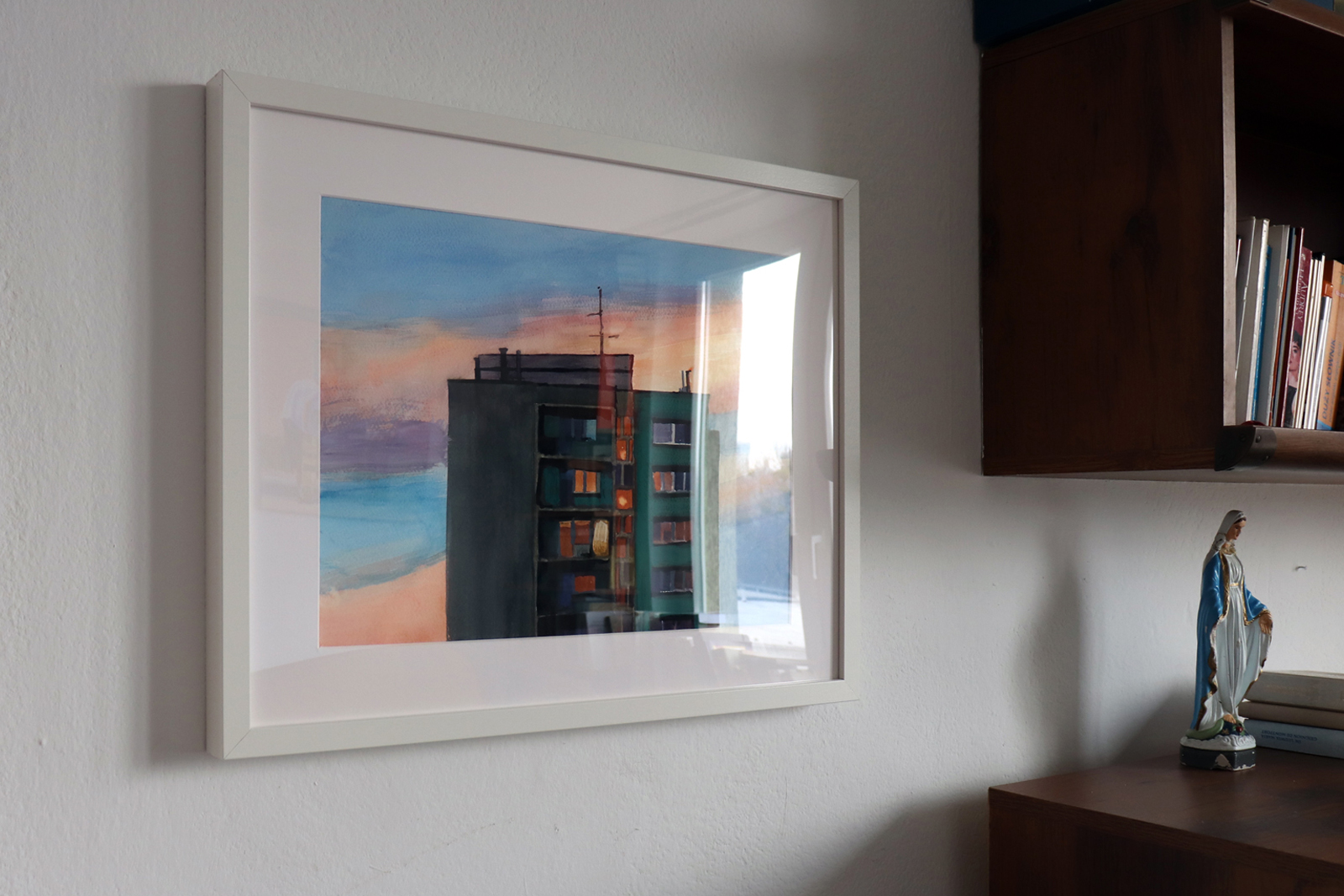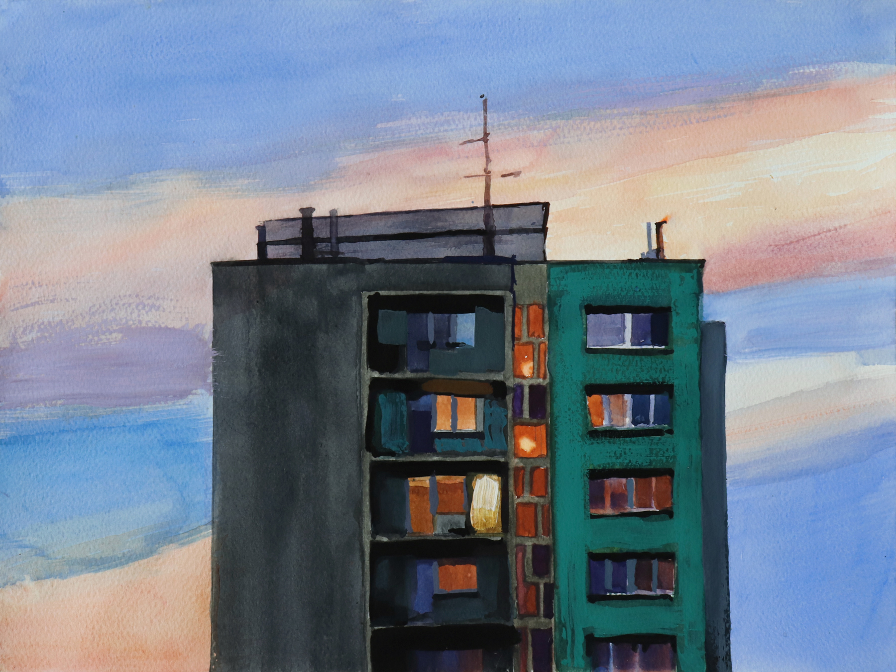 Obraz akwarelowy z dodatkiem gwaszu z roku 2014, namalowany na podstawie autorskiej fotografii. Obraz należy do cyklu Stegny, jednego z najstarszych w mojej twórczości. Cykl ten związany jest z moim Miejscem Zamieszkania. Taki tytuł nosiła moja druga wystawa z 2007 r. Był to malarski reportaż z najbliższej okolicy, miejsca codziennych obserwacji malarskich, często notowanych intuicyjnie, później dokumentowanych fotograficznie. Wystawiany był m.in. w 2023 roku w Galerii Miejskiej BWA w Bydgoszczy. Po raz pierwszy od namalowania udostępniony do sprzedaży jest formą szkicu na papierze, notatką przed namalowaniem większego obrazu sztalugowego.