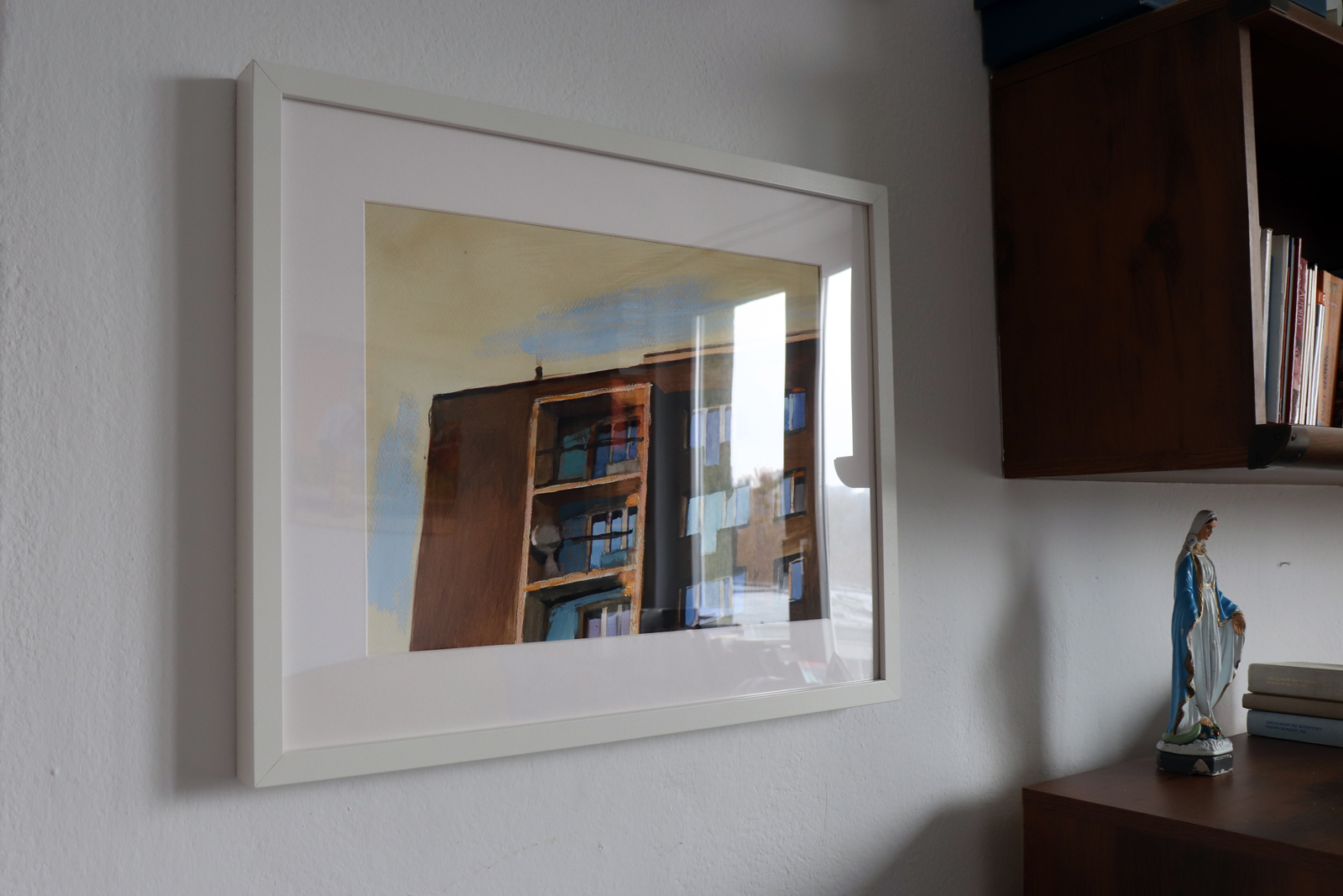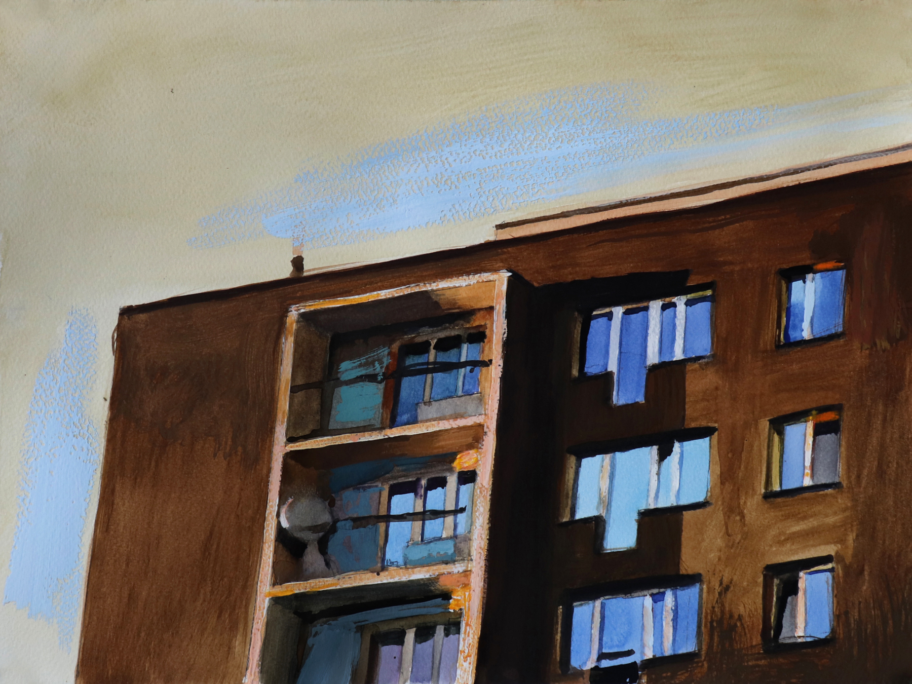 Obraz akwarelowy z dodatkiem gwaszu z roku 2014, namalowany na podstawie autorskiej fotografii. Obraz należy do cyklu Stegny, jednego z najstarszych w mojej twórczości. Cykl ten związany jest z moim Miejscem Zamieszkania. Taki tytuł nosiła moja druga wystawa z 2007 r. Był to malarski reportaż z najbliższej okolicy, miejsca codziennych obserwacji malarskich, często notowanych intuicyjnie, później dokumentowanych fotograficznie. Wystawiany był m.in. w 2023 roku w Galerii Miejskiej BWA w Bydgoszczy. Po raz pierwszy od namalowania udostępniony do sprzedaży jest formą szkicu na papierze, notatką przed namalowaniem większego obrazu sztalugowego.