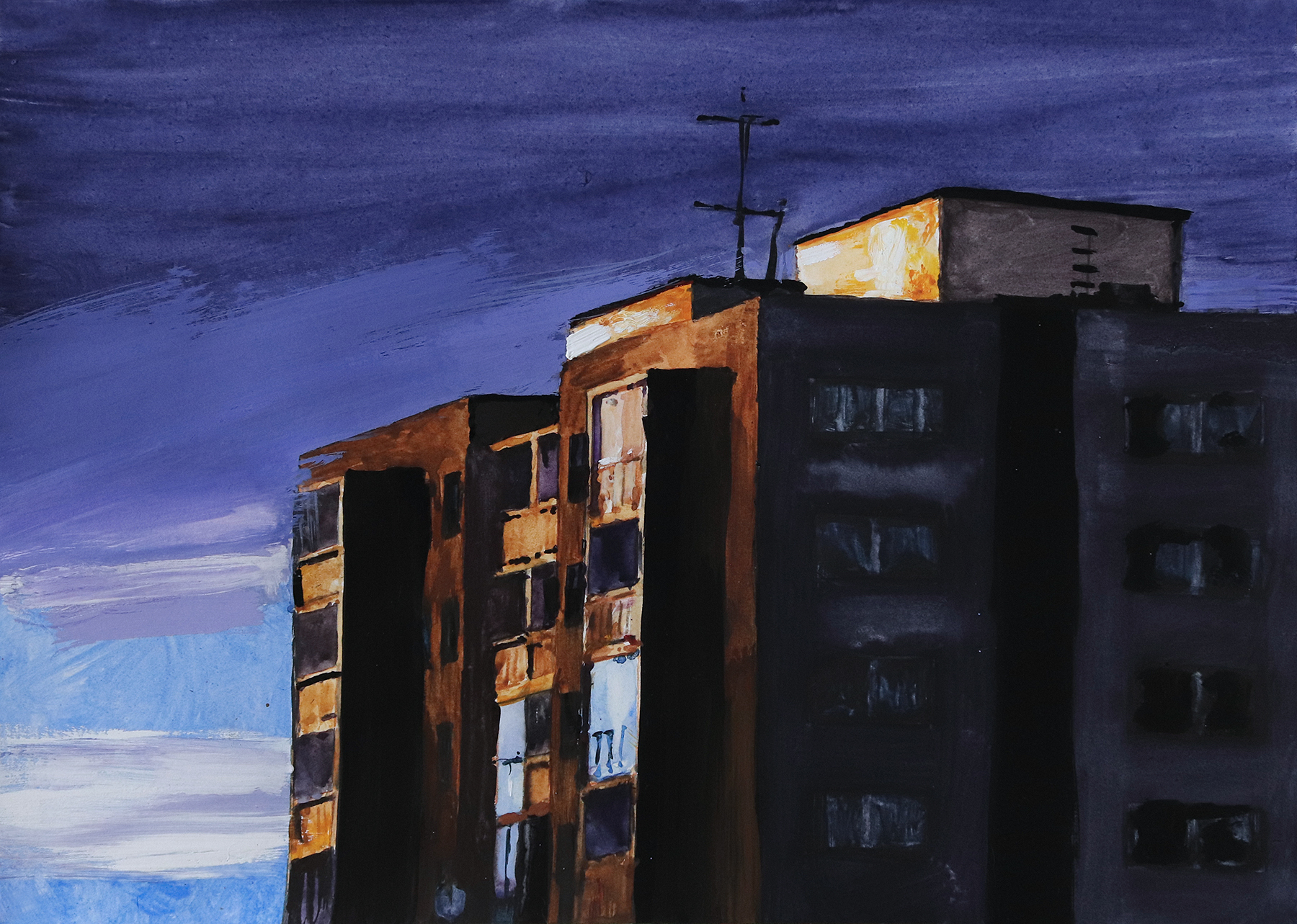 Obraz akwarelowy z dodatkiem gwaszu z roku 2024, namalowany na podstawie autorskiej fotografii. Obraz należy do cyklu Stegny, jednego z najstarszych w mojej twórczości. Cykl ten związany jest z moim Miejscem Zamieszkania. Taki tytuł nosiła moja druga wystawa z 2007 r. Był to malarski reportaż z najbliższej okolicy, miejsca codziennych obserwacji malarskich, często notowanych intuicyjnie, później dokumentowanych fotograficznie.Obraz na papierze jest formą szkicu, notatką przed namalowaniem większego obrazu sztalugowego.