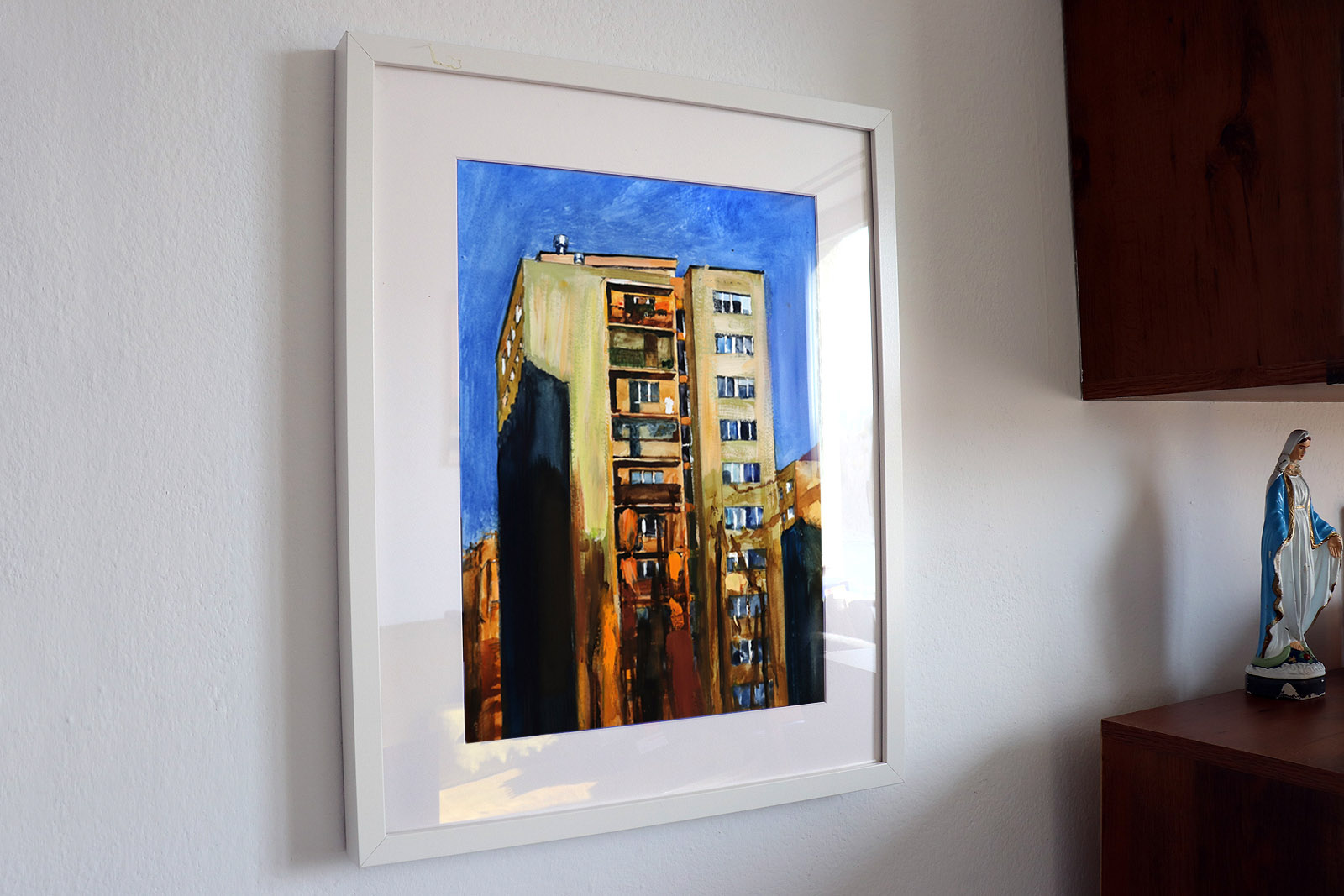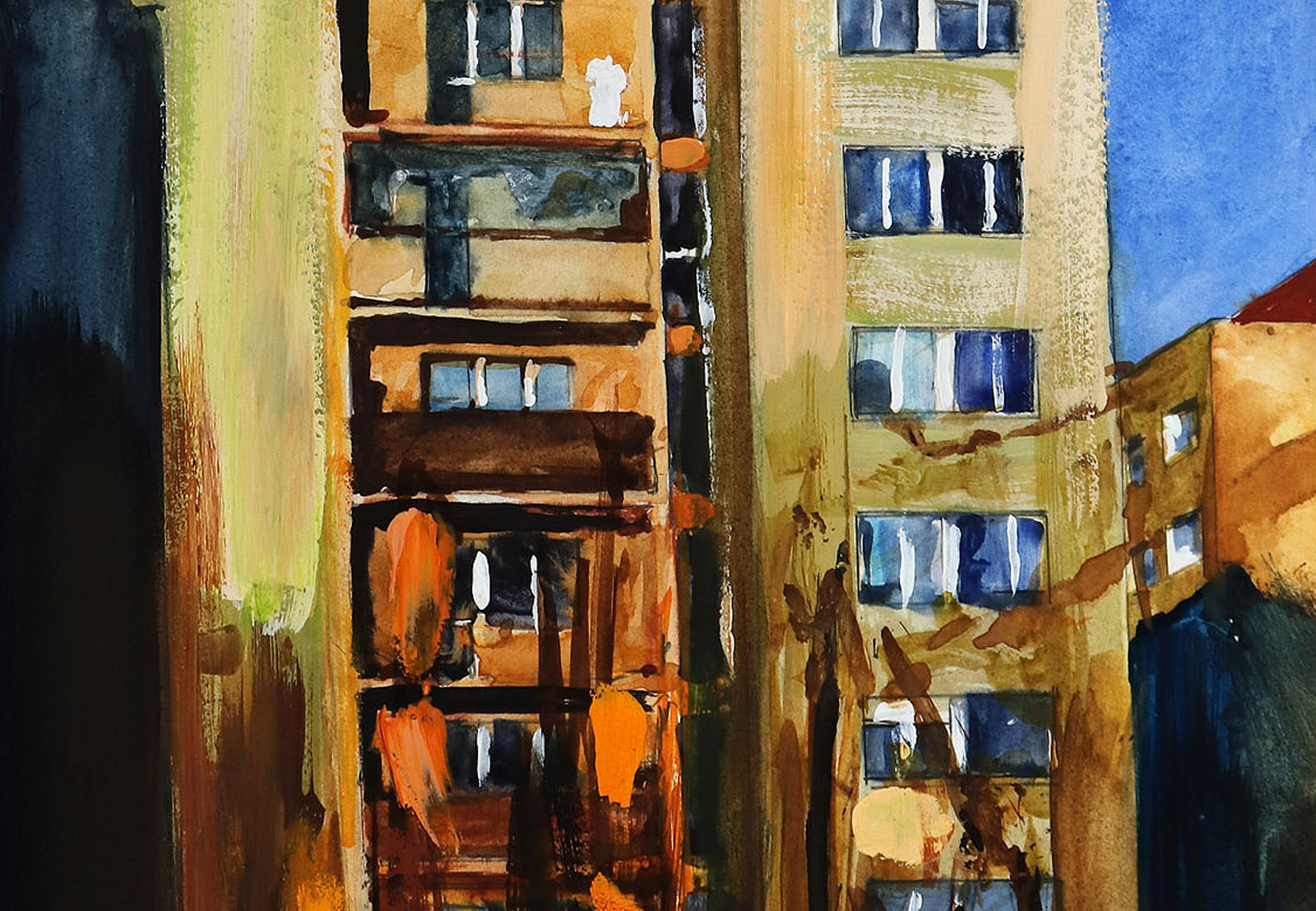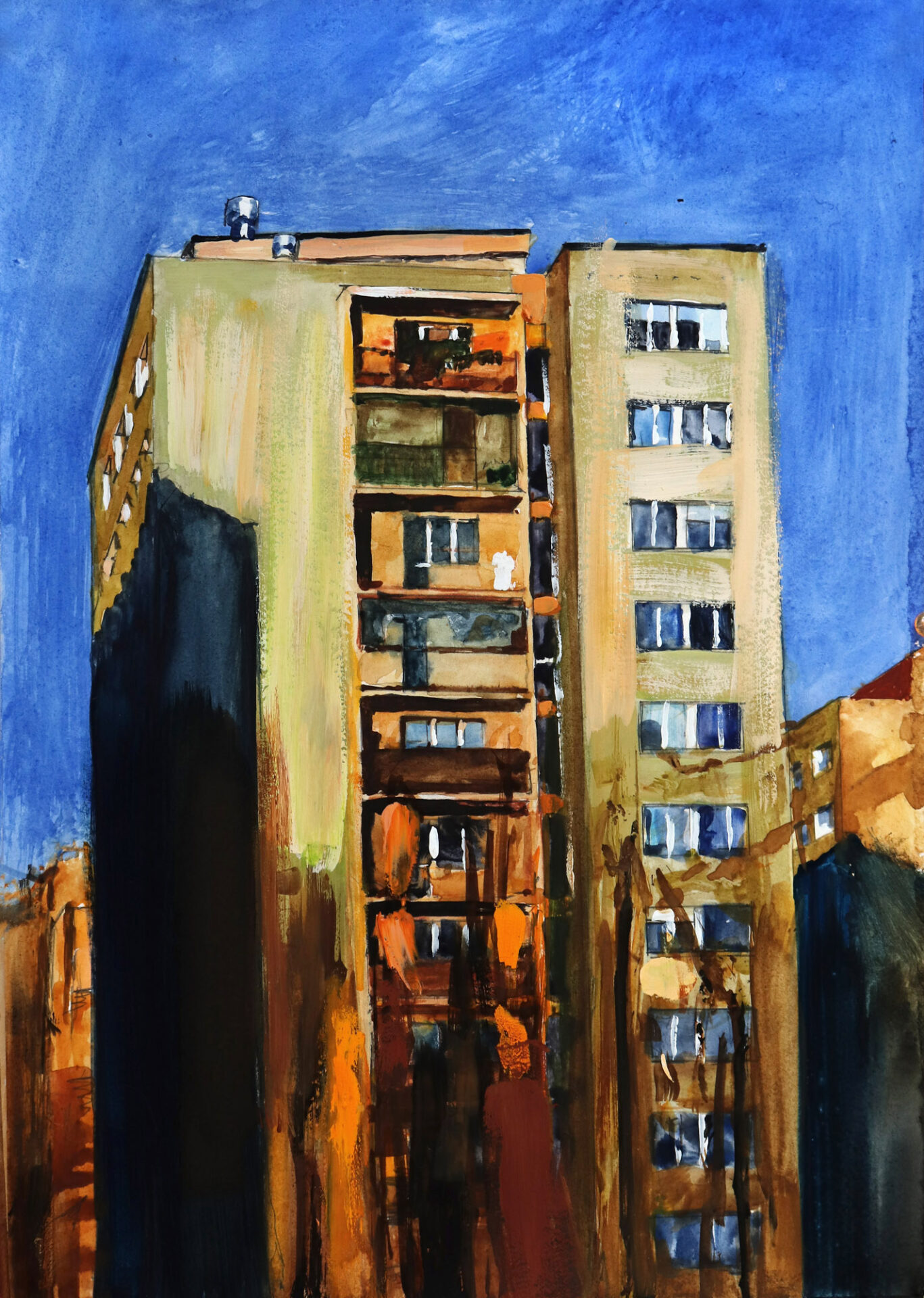 Obraz akwarelowy z dodatkiem gwaszu z roku 2024. Obraz należy do jednego z najstarszych cykli w mojej twórczości pt.: Stegny. Cykl ten związany jest z moim Miejscem Zamieszkania. Taki tytuł nosiła moja druga wystawa z 2007 r. Był to malarski reportaż z najbliższej okolicy, miejsca codziennych obserwacji malarskich, często notowanych intuicyjnie, później dokumentowanych fotograficznie.