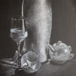 Dzień dobry mam na sprzedaż rysunek „Still nature”. Rysunek wykonany białą kredką na czarnym papierze. Wymiary rysunku 35/50cm.